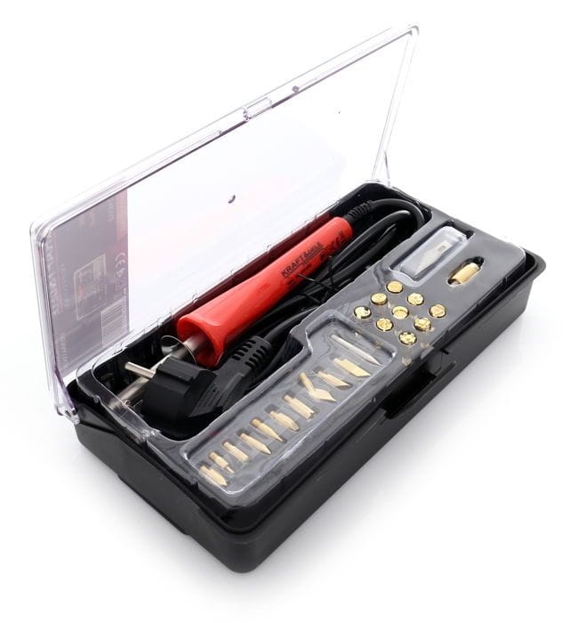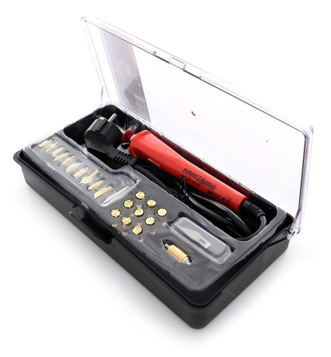 Wypalarka do drewna i skór polskiej marki Kraft&Dele o symbolu KD10112. Urządzenie służy m.in do zdobienia przedmiotów z drewna, skóry, korka za pomocą dołączonych do zestawu grotów. Urządzenie osiąga temperaturę aż do 275°C, dzięki czemu wypalanie jest niezwykle proste i szybkie.