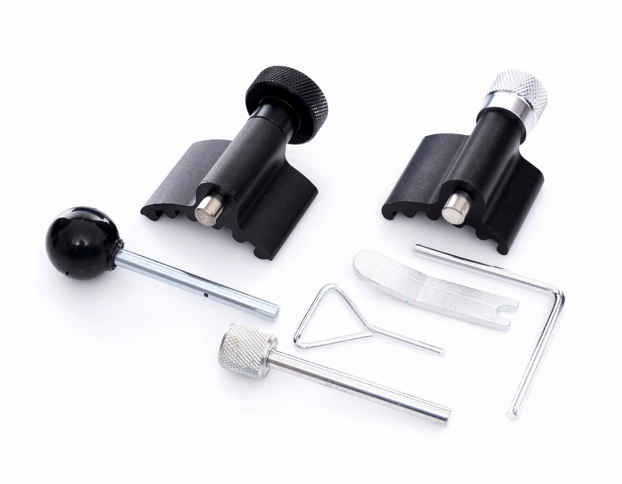Profesjonalny przyrząd do blokowania kół rozrządu. Zestaw umożliwia unieruchomienie kół zębatych rozrządu w pozycji serwisowej, podczas wymiany paska rozrządu. Specjalny kształt blokad pozwala na precyzyjne ustawienie punktów kontrolnych zapłonu. Blokady unieruchamiają koło zębate rozrządu i wału korbowego oraz koło napinacza paska. Polecane do użytku zawodowego w specjalistycznych serwisach samochodowych. Całość zestawu zapakowana w praktycznej walizkę