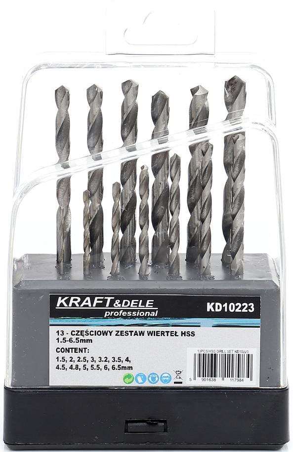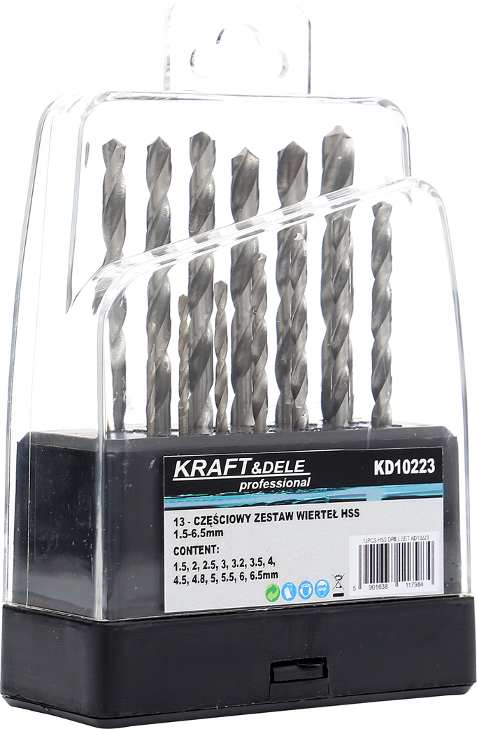 KD10223 to zestaw 13 wierteł ze stali szybkotnącej HSS marki KRAFT&DELE, przeznaczonych do precyzyjnego wiercenia w różnych materiałach. Wiertła zostały wykonane metodą szlifowania, co zapewnia wysoką dokładność wykonania oraz stabilną pracę nawet przy wysokich obrotach.
