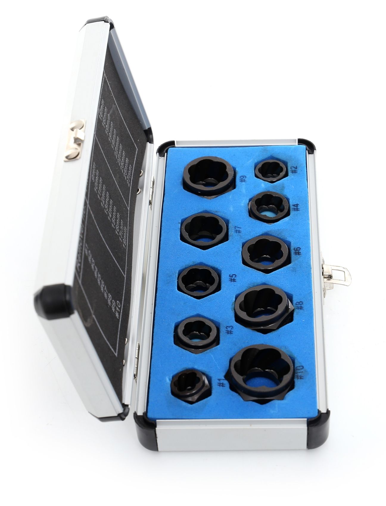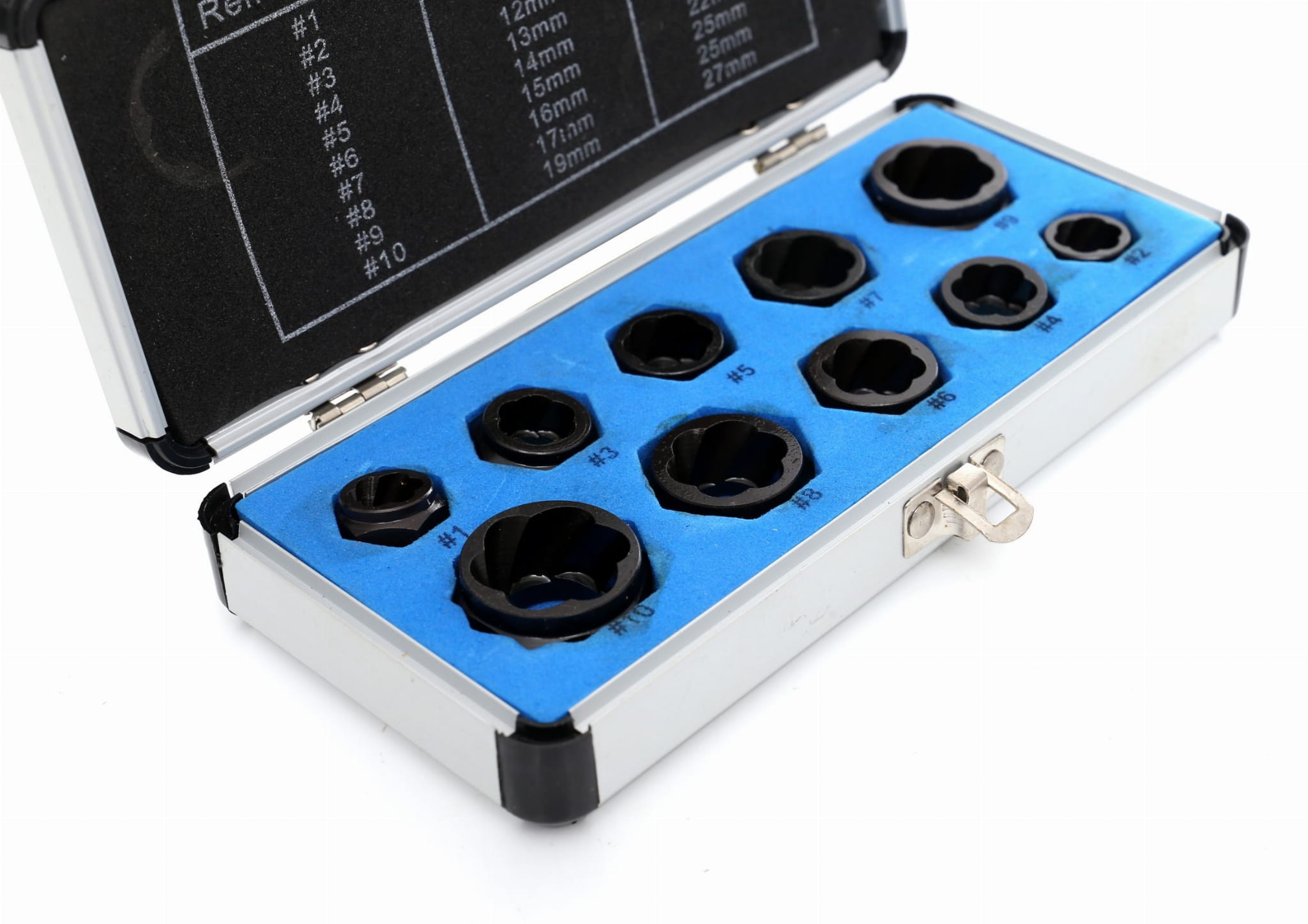 W zestawie znajdziemy wykrętaki w 10 rozmiarach: 9, 10, 11, 12, 13, 14, 15, 16, 17 oraz 19 mm.