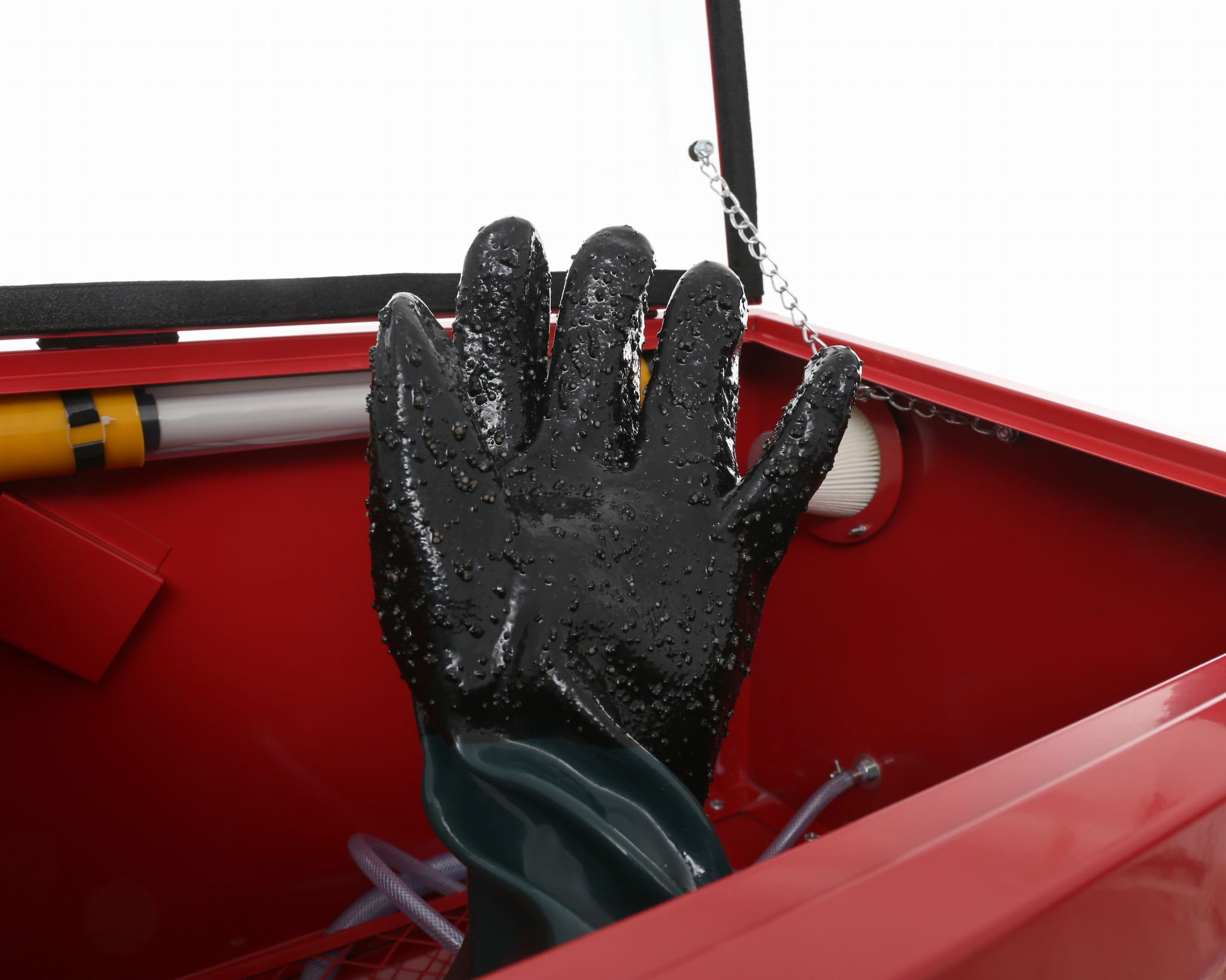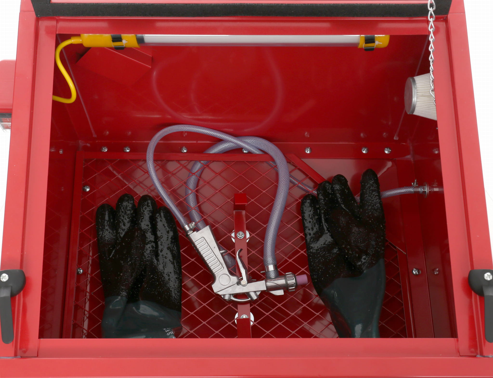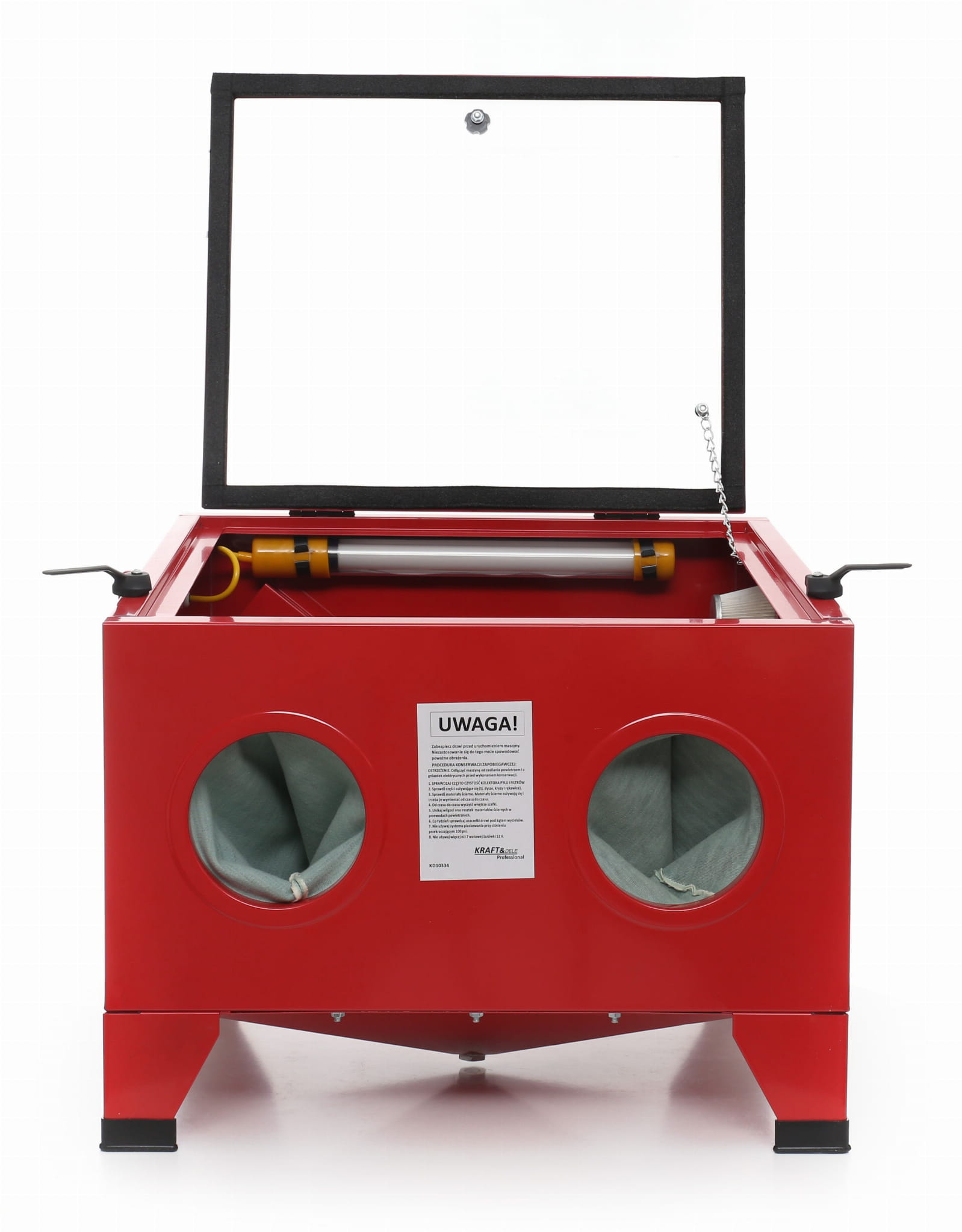 Fabrycznie nowa piaskarka kabinowa o pojemności 90l wyposażona w pistolet do piaskowania oraz lampę podświetlającą.