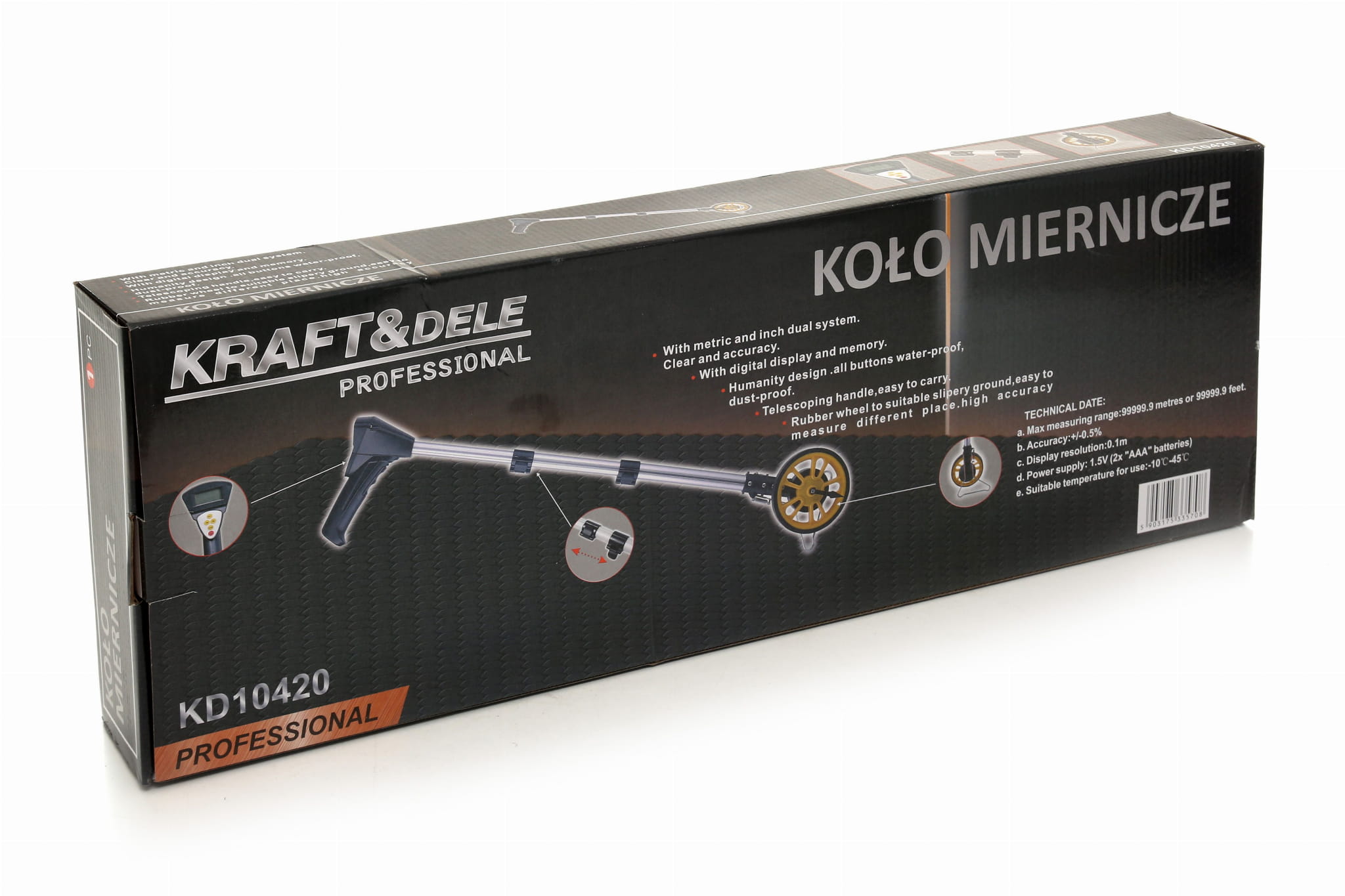 Koło miernicze wyposażone w elektroniczny system pomiaru odległości. Pomiar dokonywany jest poprzez toczenie kółka po równej nawierzchni, które obracając się uruchamia elektroniczny licznik. Wynik pomiaru jest wyświetlany w postaci cyfr na wyświetlaczu LCD. Metalowa nóżka pozwala na postawienie urządzenia w pozycji pionowej. Jest to urządzenie znajdujące szerokie zastosowanie w pomiarach polowych, na drogach, w budownictwie, pomiarach domowych i ogrodowych, nawierzchni dróg publicznych, boisk sportowych, instalacji słupów energetycznych, podczas sadzenia drzew, itd.
