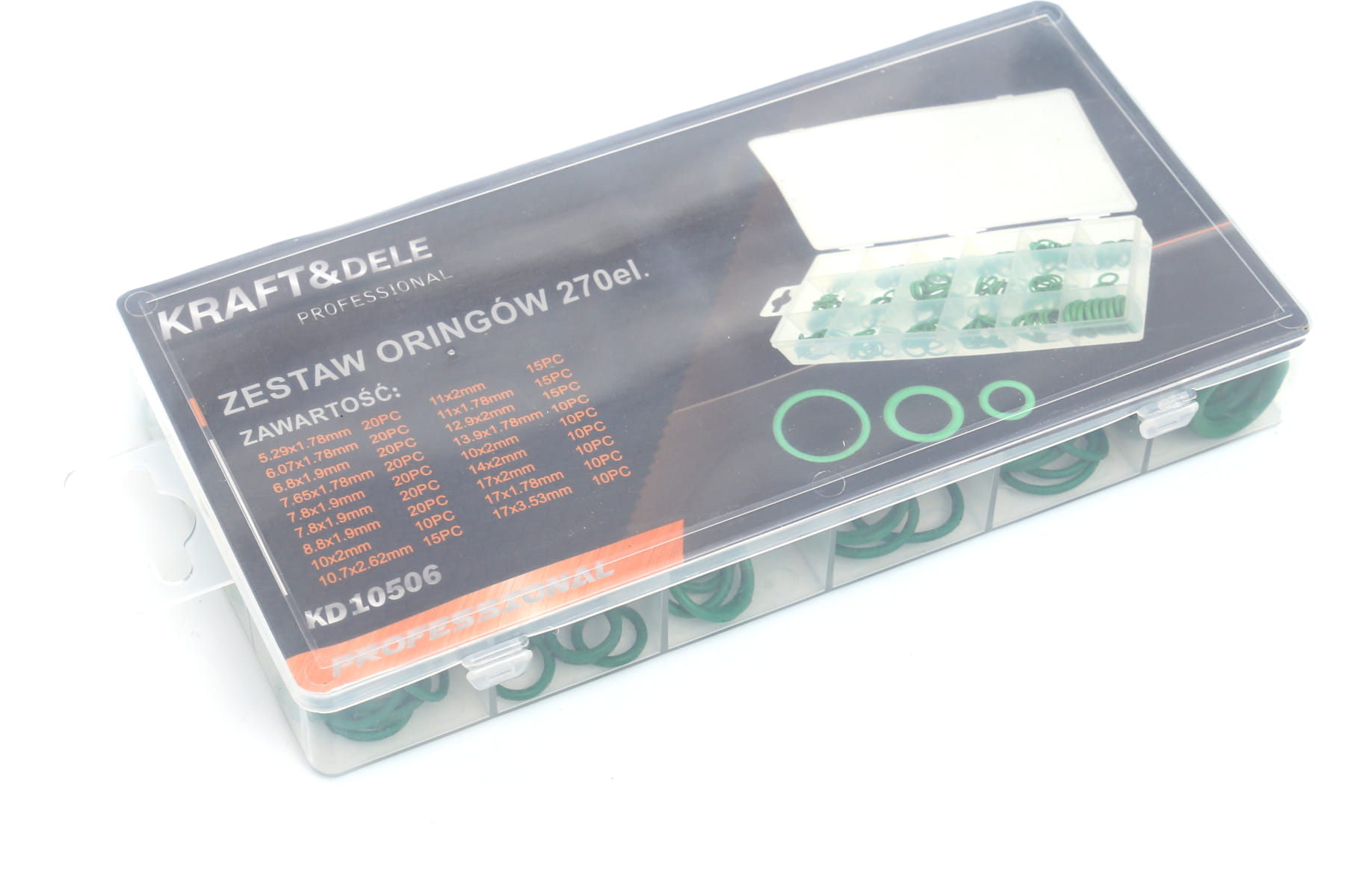 KD10506 marki KRAFT&DELE to kompletny zestaw 270 sztuk olejoodpornych oringów, przeznaczonych do uszczelniania połączeń w instalacjach hydraulicznych, pneumatycznych oraz motoryzacyjnych. Sprawdzą się w warsztacie, serwisie mechanicznym oraz przy pracach montażowych i naprawczych.