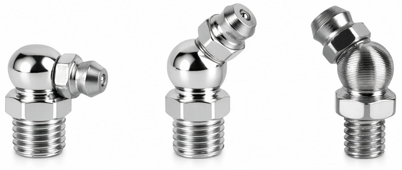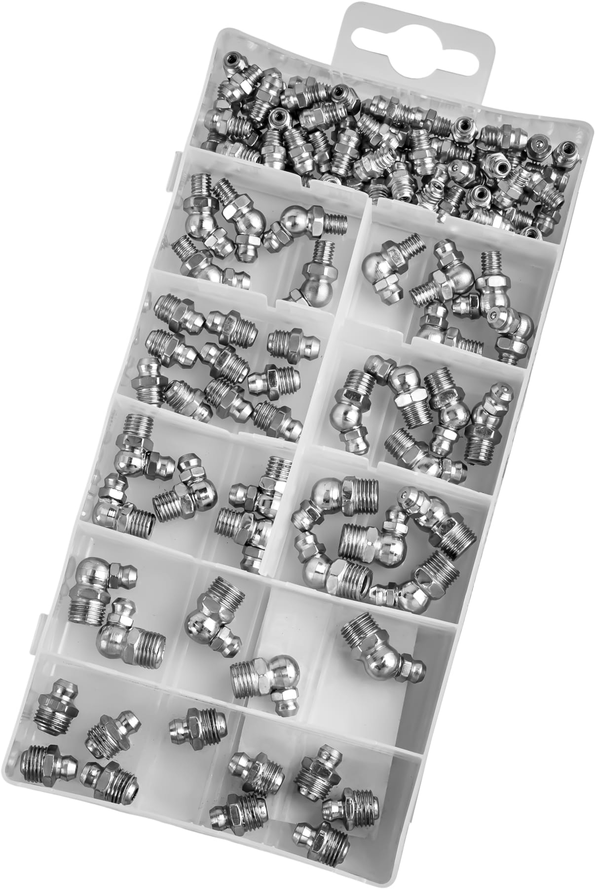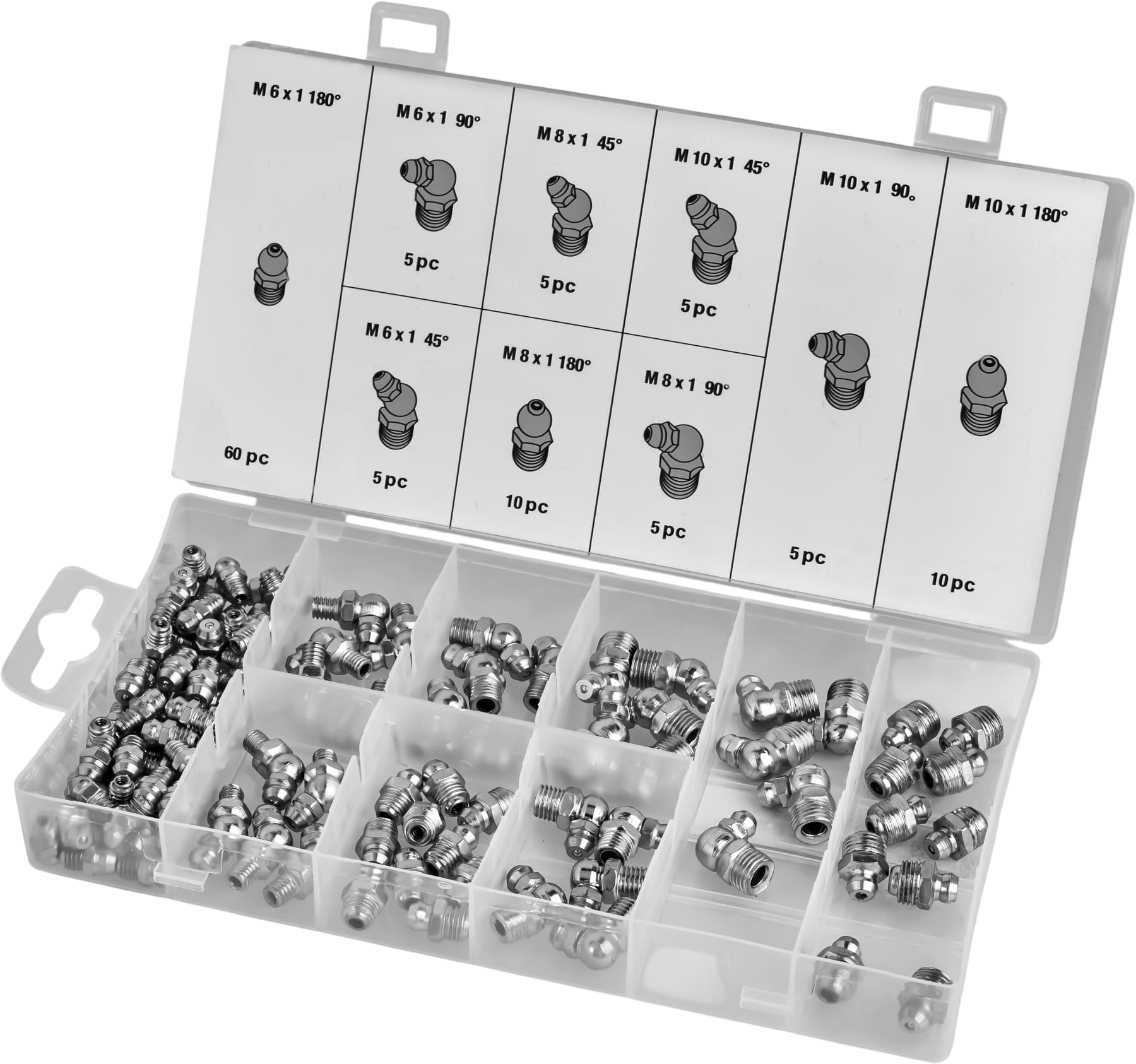W skład zestawu wchodzą smarowniczki proste, pod kątem 45° oraz 90°, umożliwiające wygodny dostęp do trudno umiejscowionych punktów smarnych. Gwinty w rozmiarach M6, M8 oraz M10 zapewniają szeroką kompatybilność z popularnymi urządzeniami i podzespołami mechanicznymi. Wszystkie elementy zostały zapakowane w praktyczne pudełko z przegródkami i opisami, co ułatwia organizację oraz szybkie odnalezienie właściwej smarowniczki.