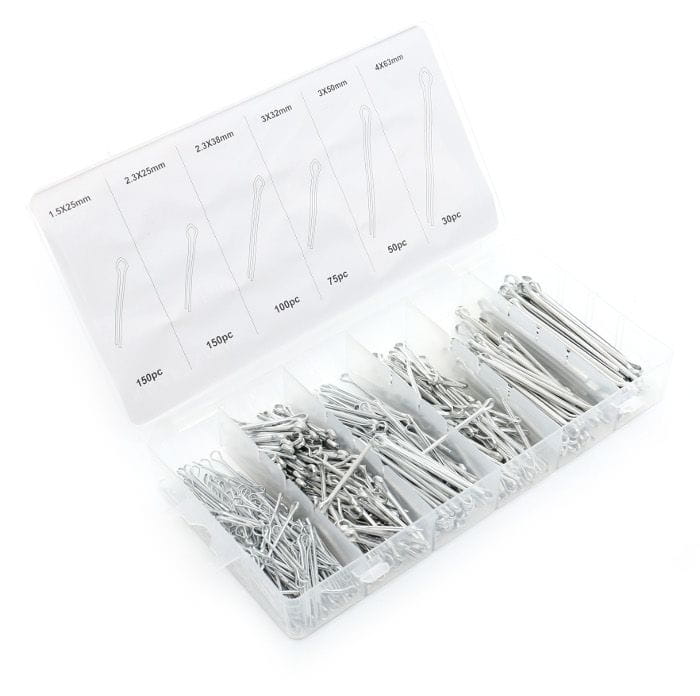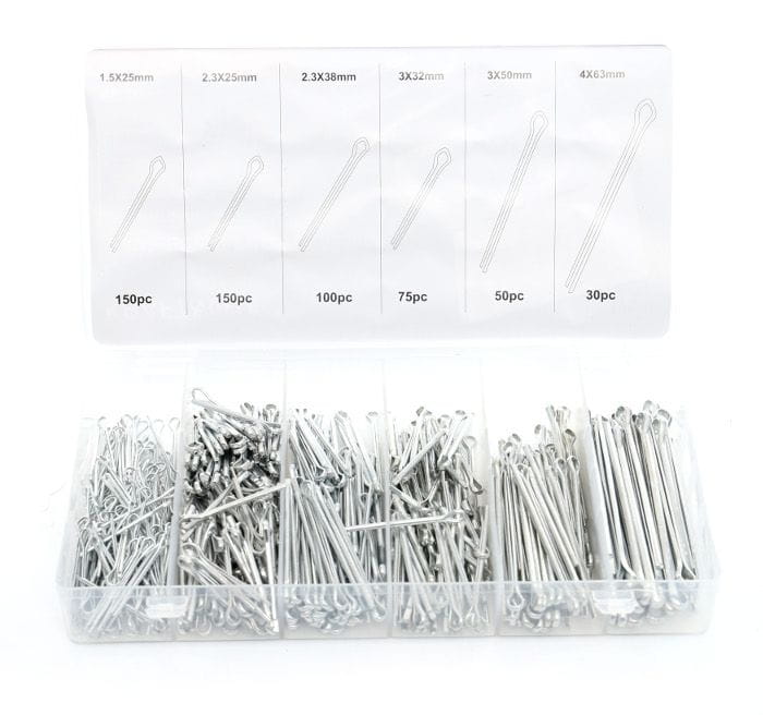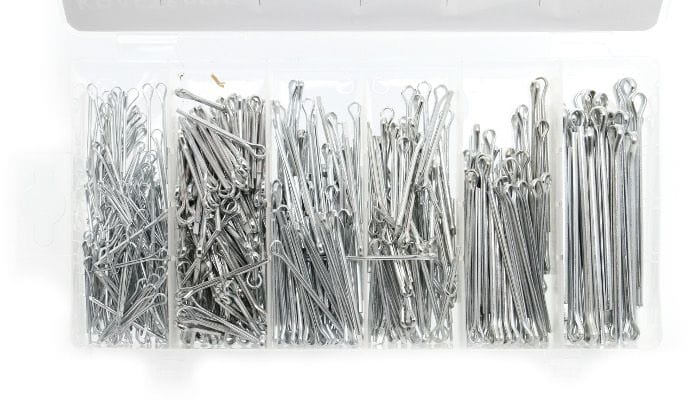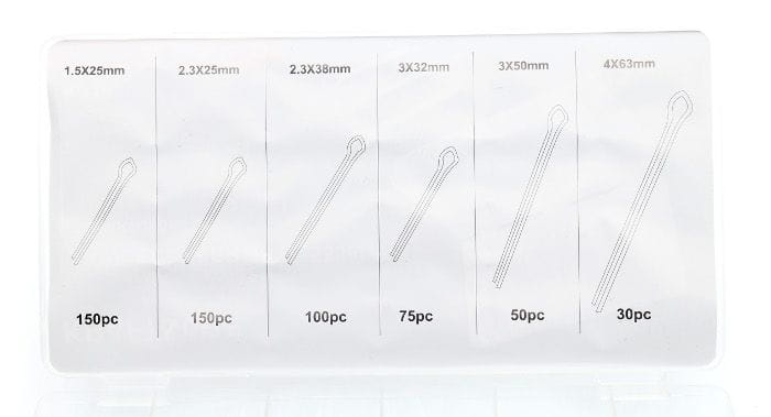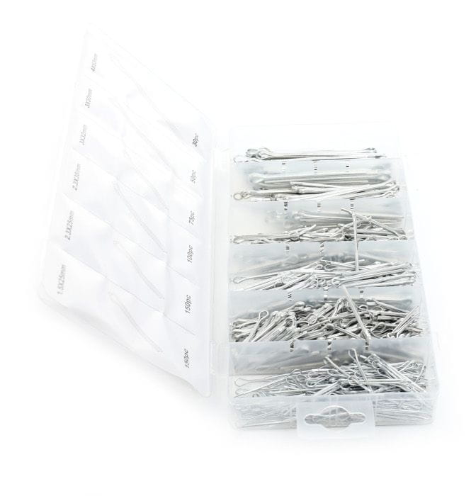 Całość zapakowana jest w plastikowym pojemniku, w którym każdy rodzaj zawleczki ma swoje oznaczone miejsce.