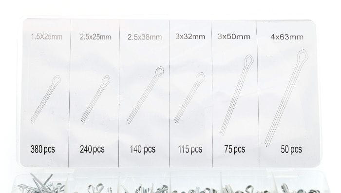 Zestaw został starannie posegregowany w wytrzymałym, plastikowym organizerze — każda zawleczka posiada swoje właściwe miejsce, co ułatwia szybkie odnalezienie odpowiedniego rozmiaru podczas pracy. Materiał wykonania to solidna stal, gwarantująca trwałość i odporność na odkształcenia.
