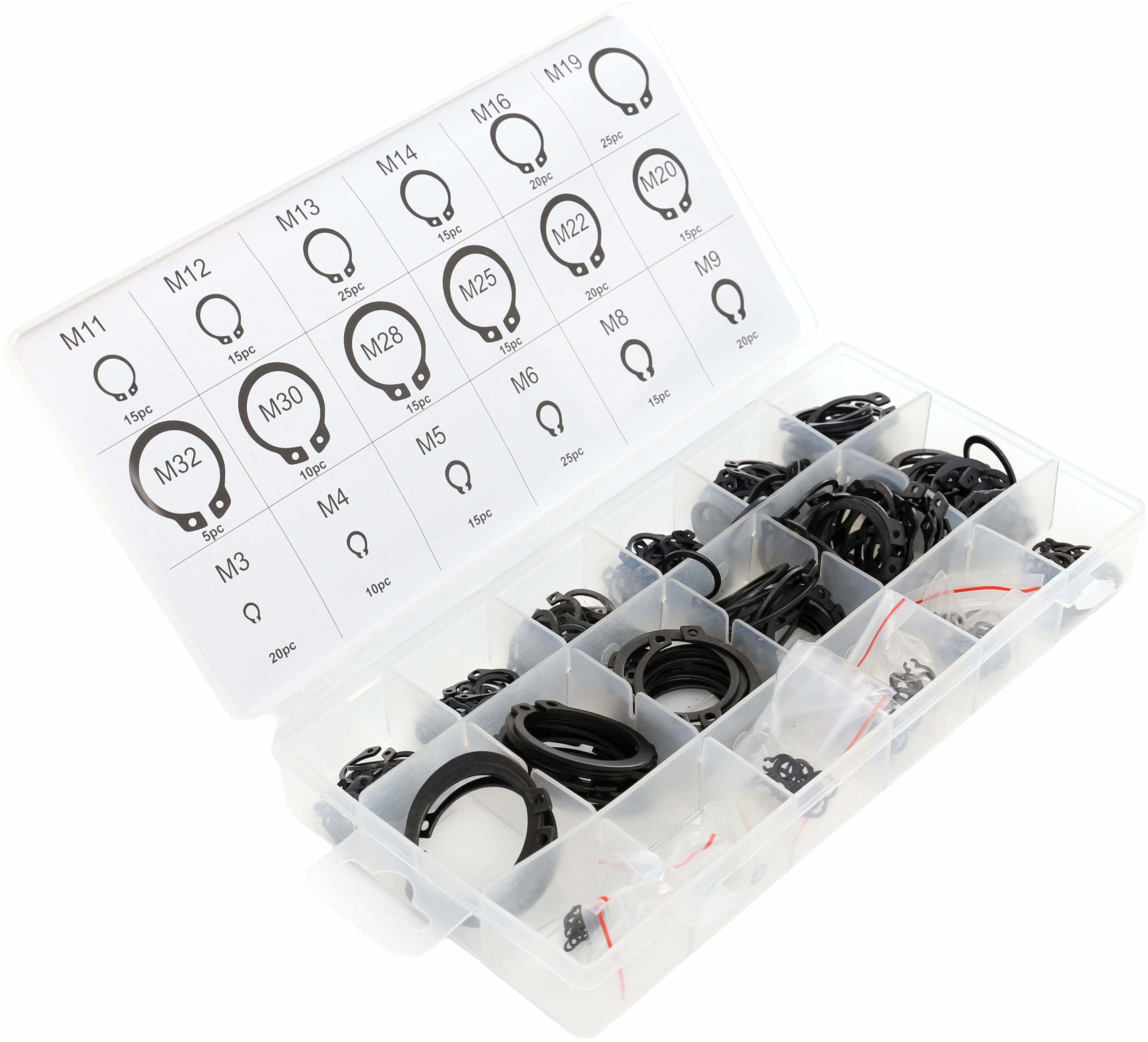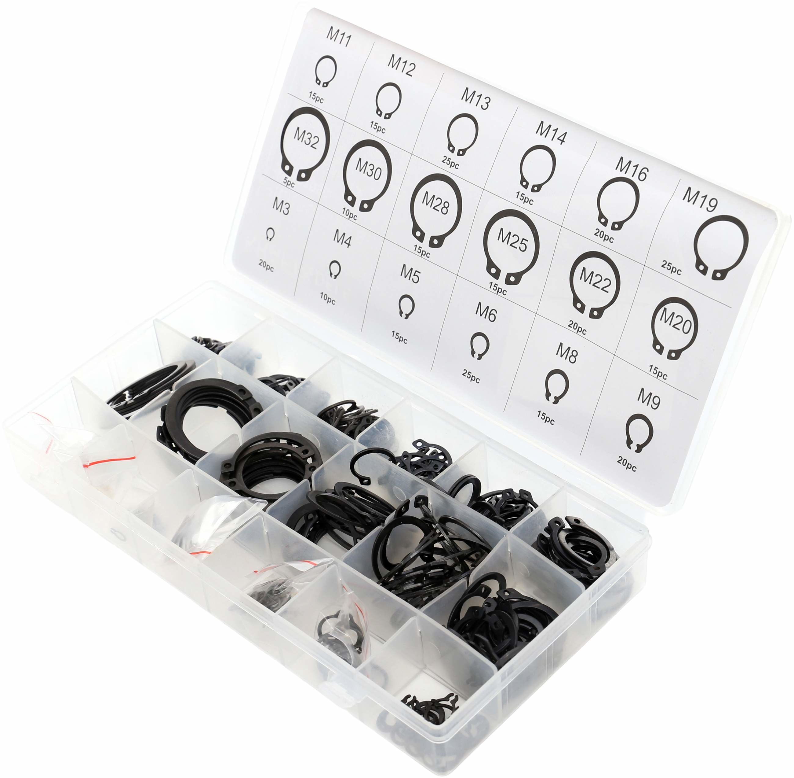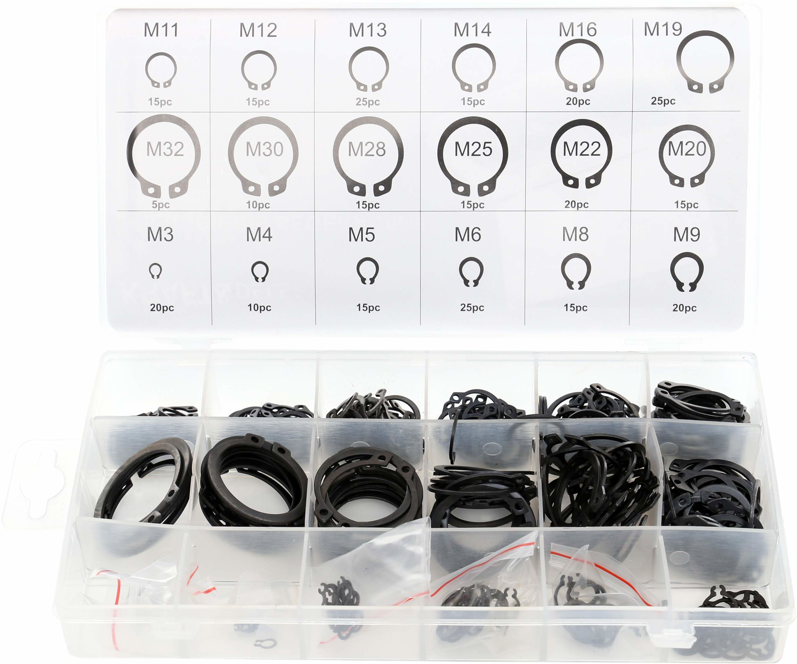 Pierścienie wykonane są z wysokiej jakości stali sprężystej, dzięki czemu charakteryzują się dużą wytrzymałością oraz odpornością na odkształcenia. Całość zapakowana jest w wygodny organizer z przegródkami, który umożliwia łatwe sortowanie i szybki dostęp do odpowiednich rozmiarów podczas pracy. Zestaw idealnie sprawdzi się w warsztatach, serwisach oraz przy pracach montażowych i naprawczych.