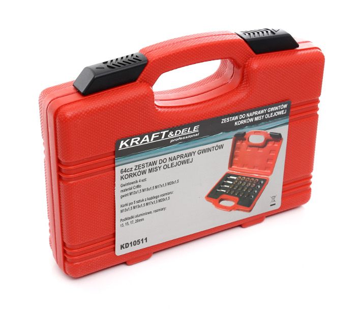 Zestaw gwintowników i korków o symbolu KD10511 do prostej naprawy gwintów korków spustowych miski olejowej, skrzyni biegów i innych. Pasuje do większości gwintów popularnie używanych w samochodach osobowych i lekkich samochodach ciężarowych. Zestaw przeznaczony do warsztatów samochodowych, naprawczych i serwisów.
