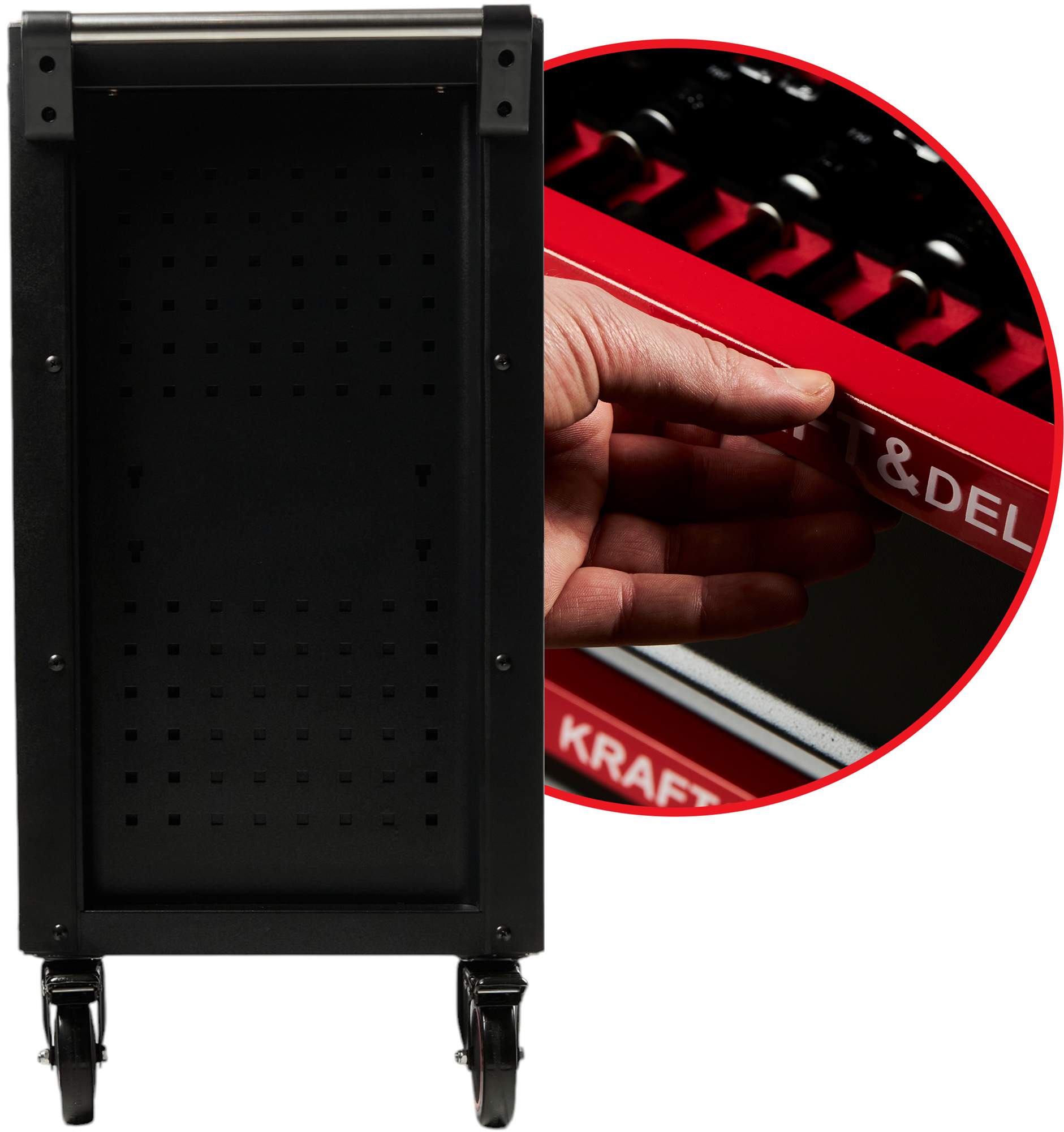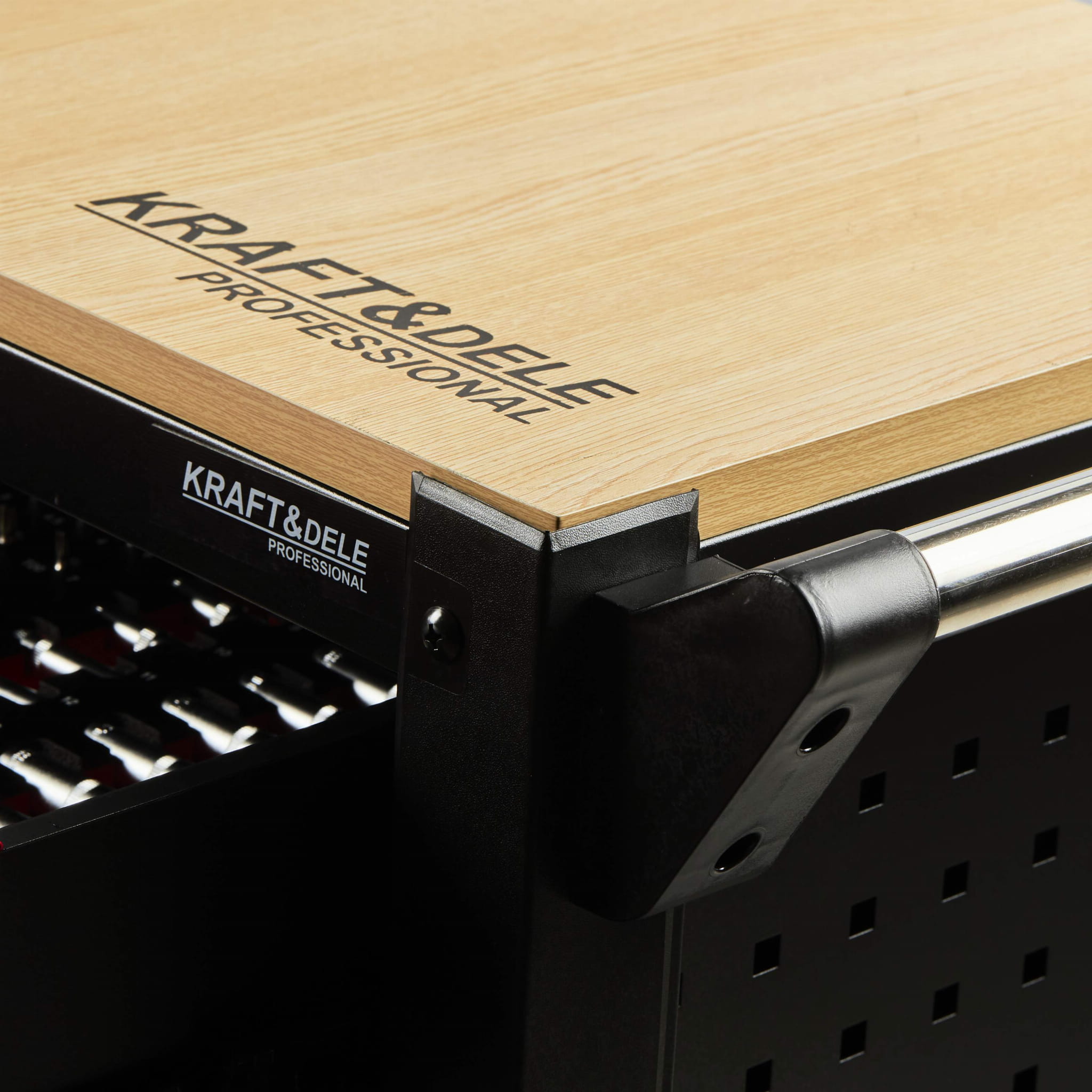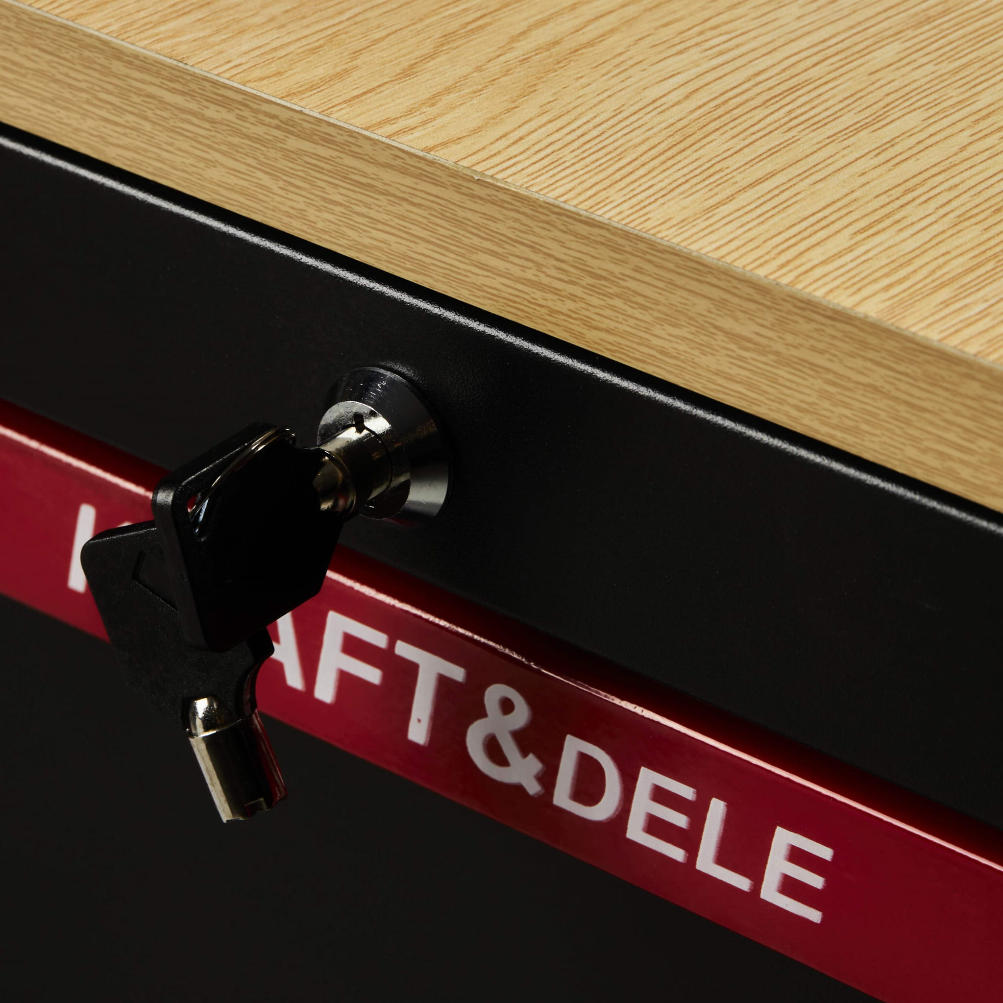 Dzięki solidnej konstrukcji, stalowej obudowie oraz prowadnicom łożyskowanym szafka zapewnia trwałość i komfort codziennego użytkowania. Przemyślany układ szuflad ułatwia organizację narzędzi, a drewniany blat roboczy pozwala na wygodną pracę bezpośrednio na szafce. Dodatkowe elementy, takie jak gumowe odbojniki, system blokady oraz mobilna konstrukcja z uchwytem i kółkami, zwiększają bezpieczeństwo oraz wygodę użytkowania nawet przy częstym przemieszczaniu.