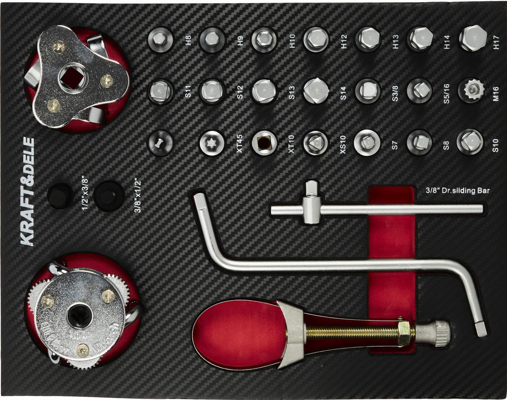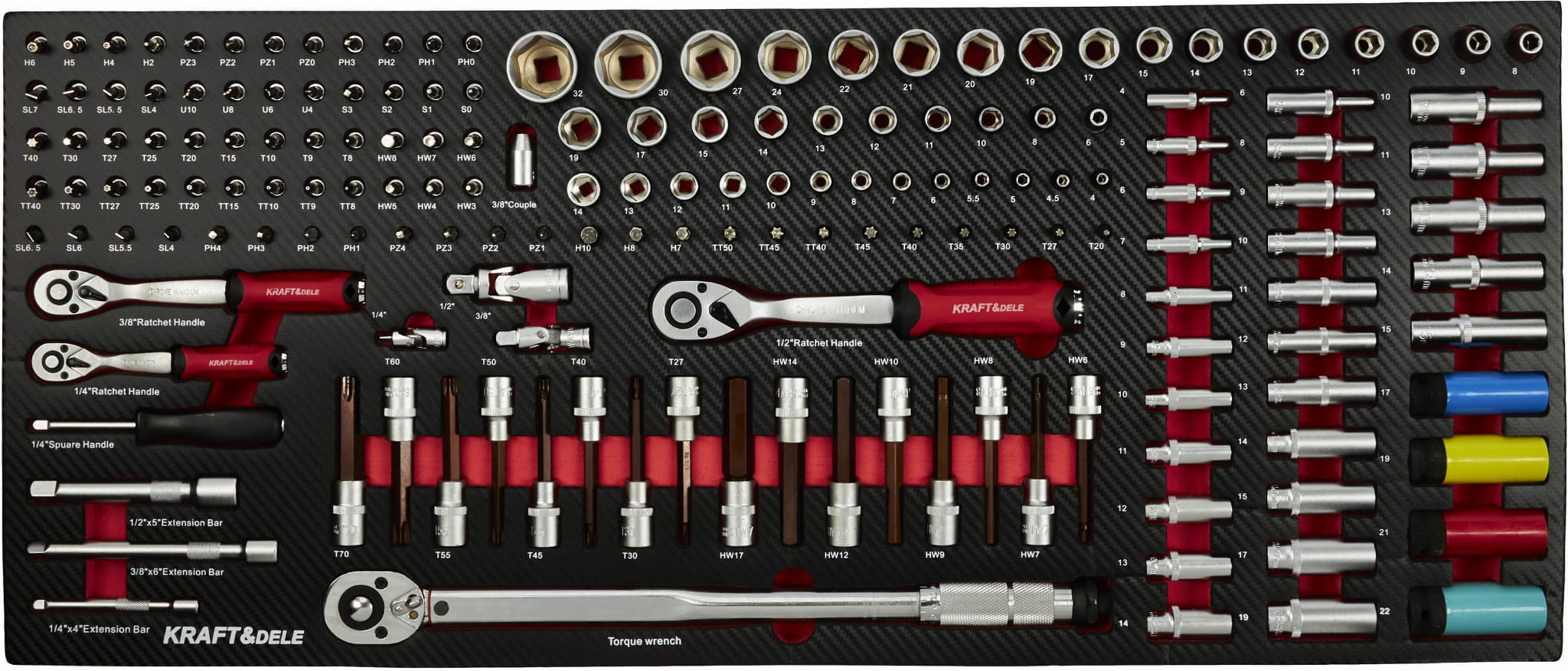 3 grzechotki (72 zęby) - 1/4", 3/8", 1/2" Klucz dynamometryczny 1/2" 20-210 Nm (72 zęby) Wkrętak ręczny 1/4" do nasadek i bitów 48 bitów z nasadką 1/4" – H6-SL6 24 bity 8mm - SL6.5-T20 Nasadka z uchwytem do bitów 3/8” 13 nasadek krótkich 1/4" - 4‑...‑14mm 11 nasadek długich 1/4" – 4‑...‑14 mm 11 nasadek długich 3/8" – 6‑...‑19 mm 10 nasadek krótkich 3/8" – 6‑...‑19 mm 16 bitów z nasadką 1/2" - T70‑...‑HW6 5 nasadki długie 1/2" – 10‑...‑15 mm 17 nasadek krótkich 1/2” – 8‑...‑32 mm 4 długie nasadki udarowe do felg aluminiowych - 17mm, 19mm, 21mm, 22mm 3 przeguby Cardana - 1/4", 3/8", 1/2" 3 przedłużki - 1/4" x 100mm – 3/8” 150mm – 1/2" x 120mm |