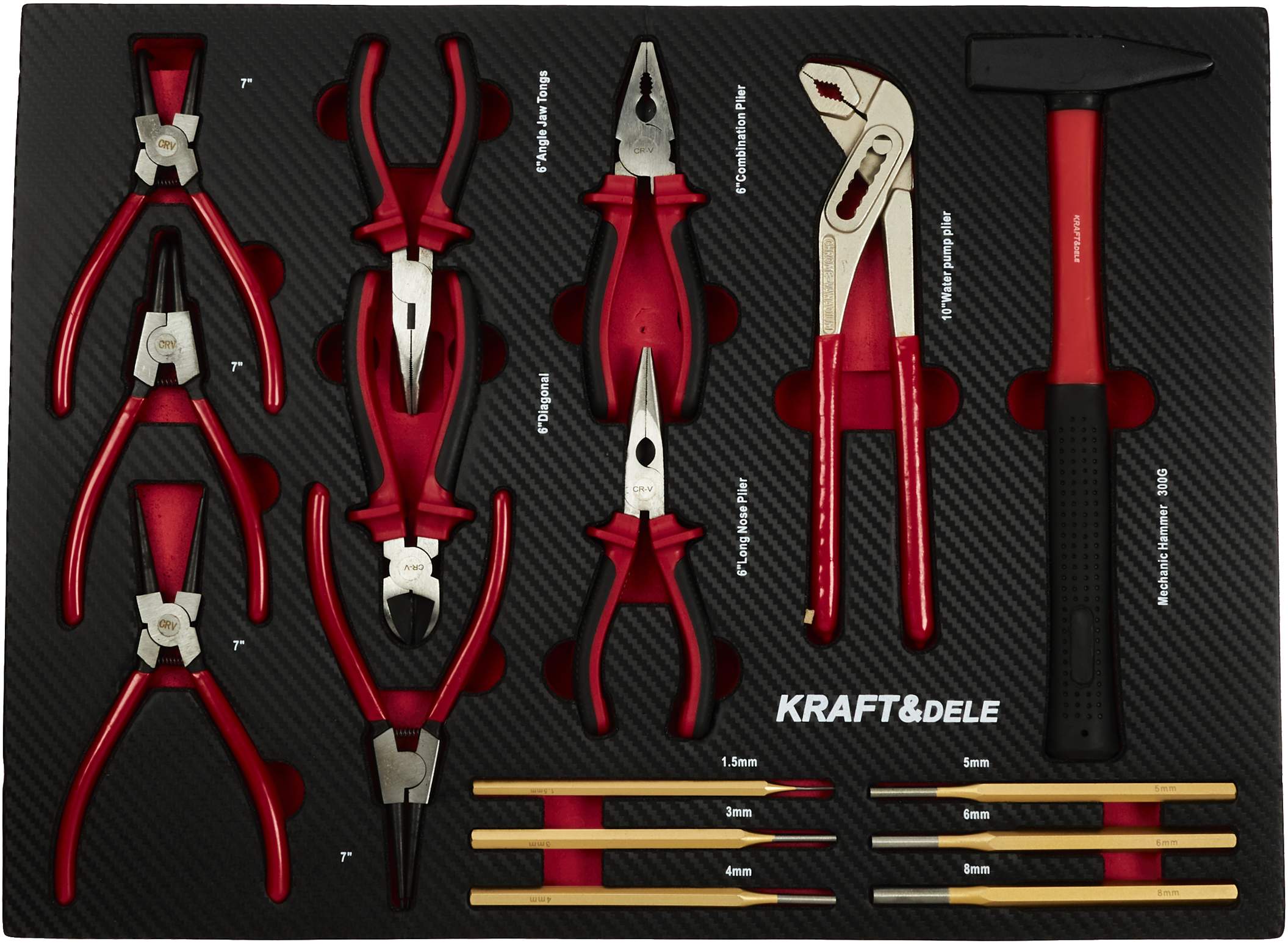 Proste/odgięte wewn. i zewn. szczypce – 170 mm Kombinerki, szczypce wydłużone, uniwersalne – 160 mm Szczypce uniwersalne nastawne – 250 mm Młotek warsztatowy – 300 g Wybijaki walcowe 6 szt. – różne rozmiary |