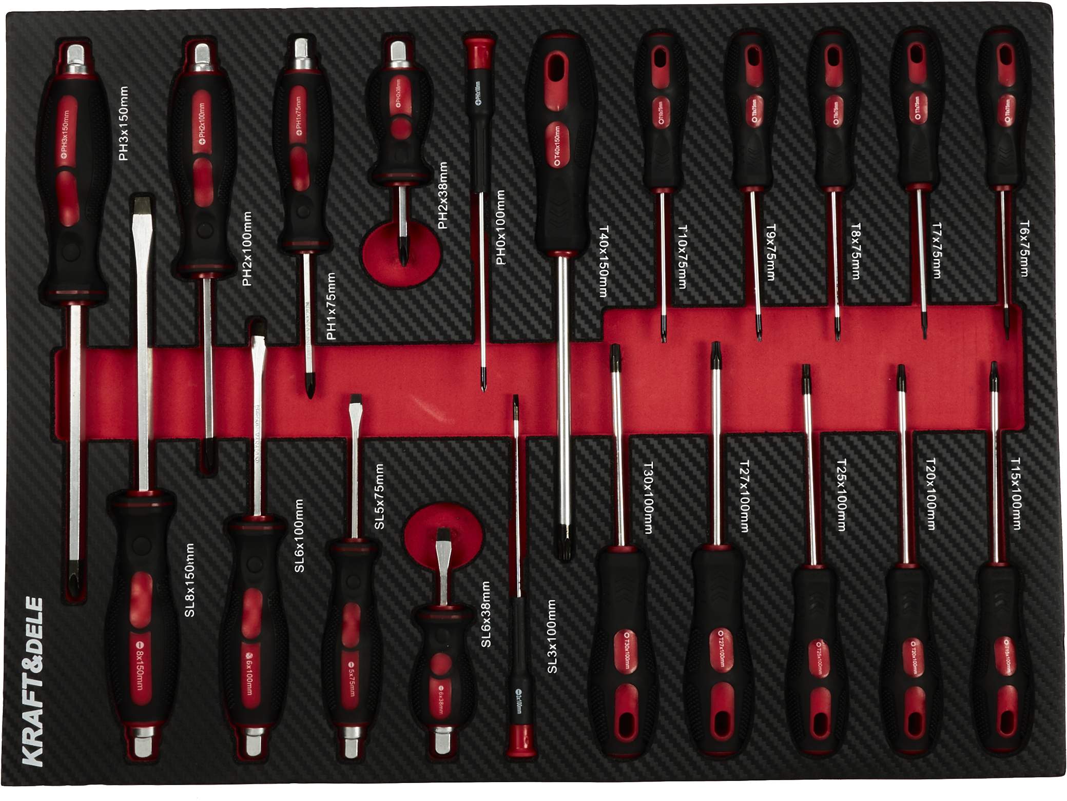 4 wkrętaki krzyżowe do pobijania – PH3‑PH2‑PH1 4 wkrętaki płaskie do pobijania – SL8‑SL6‑SL5 2 wkrętaki precyzyjne – PH0, SL3 11 wkrętaków typu torx – T6‑T40 |