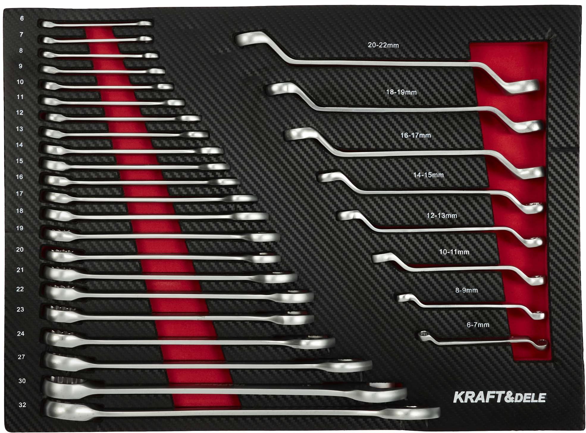 8 kluczy oczkowych giętych – 6×7‑...‑20×22 mm 22 klucze płasko‑oczkowe – 6‑...‑32 mm |