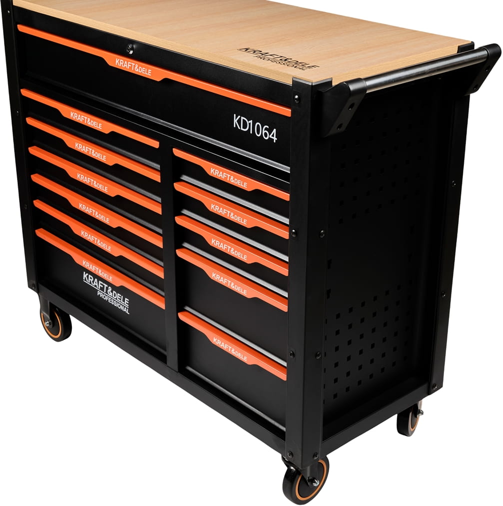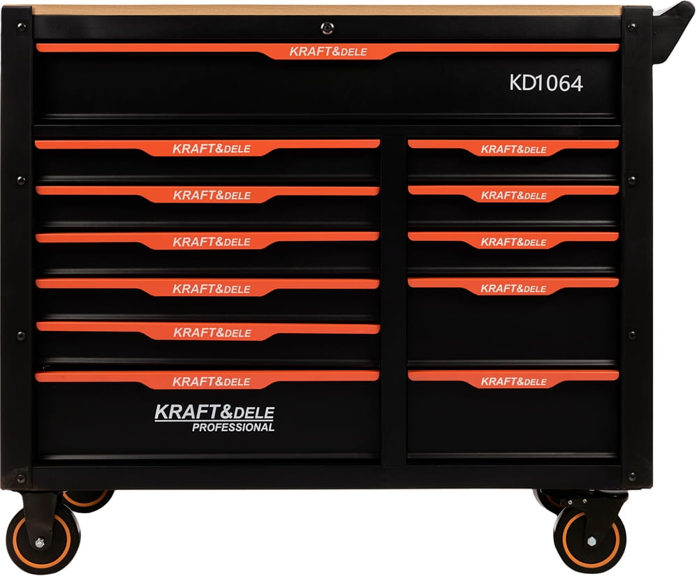 Model KD1064 został wyposażony w rozwiązania zwiększające bezpieczeństwo oraz komfort pracy. Prowadnice łożyskowane zapewniają płynne i ciche otwieranie szuflad, a system blokady umożliwia wysunięcie tylko jednej szuflady jednocześnie. Szafka posiada również solidny drewniany blat roboczy, który stanowi wygodną powierzchnię do pracy, oraz praktyczny uchwyt ułatwiający jej przemieszczanie. Duże koła z hamulcem i blokadą gwarantują stabilność oraz łatwe przemieszczanie nawet na nierównych powierzchniach.
