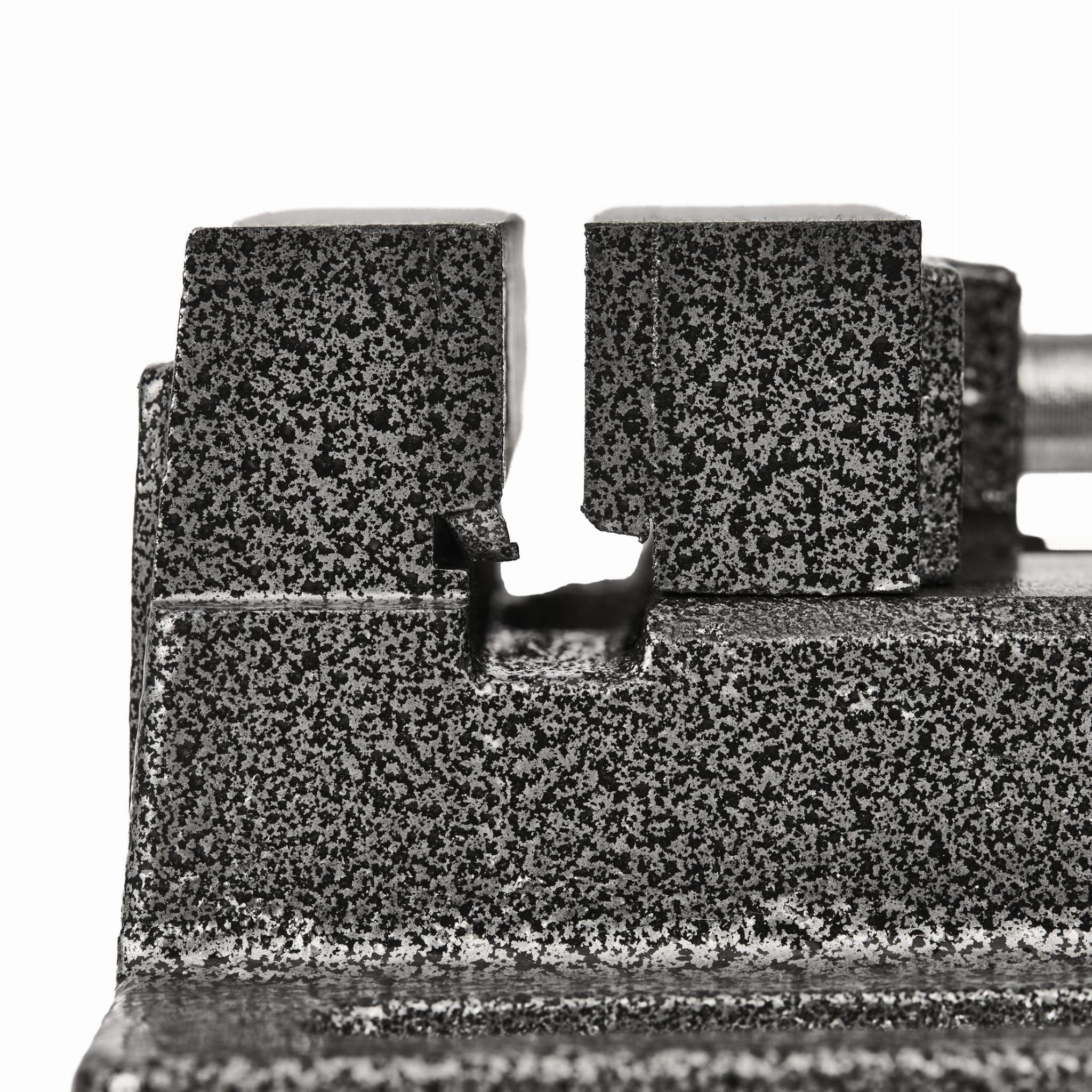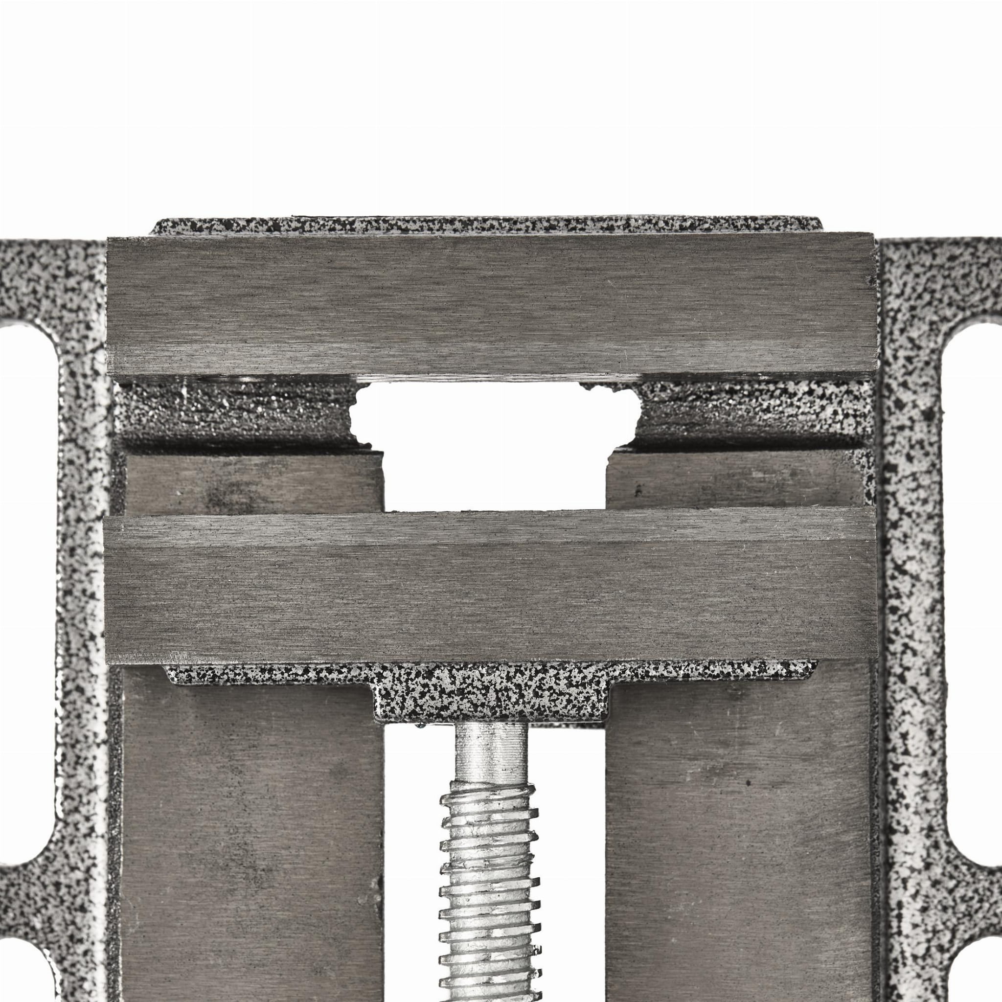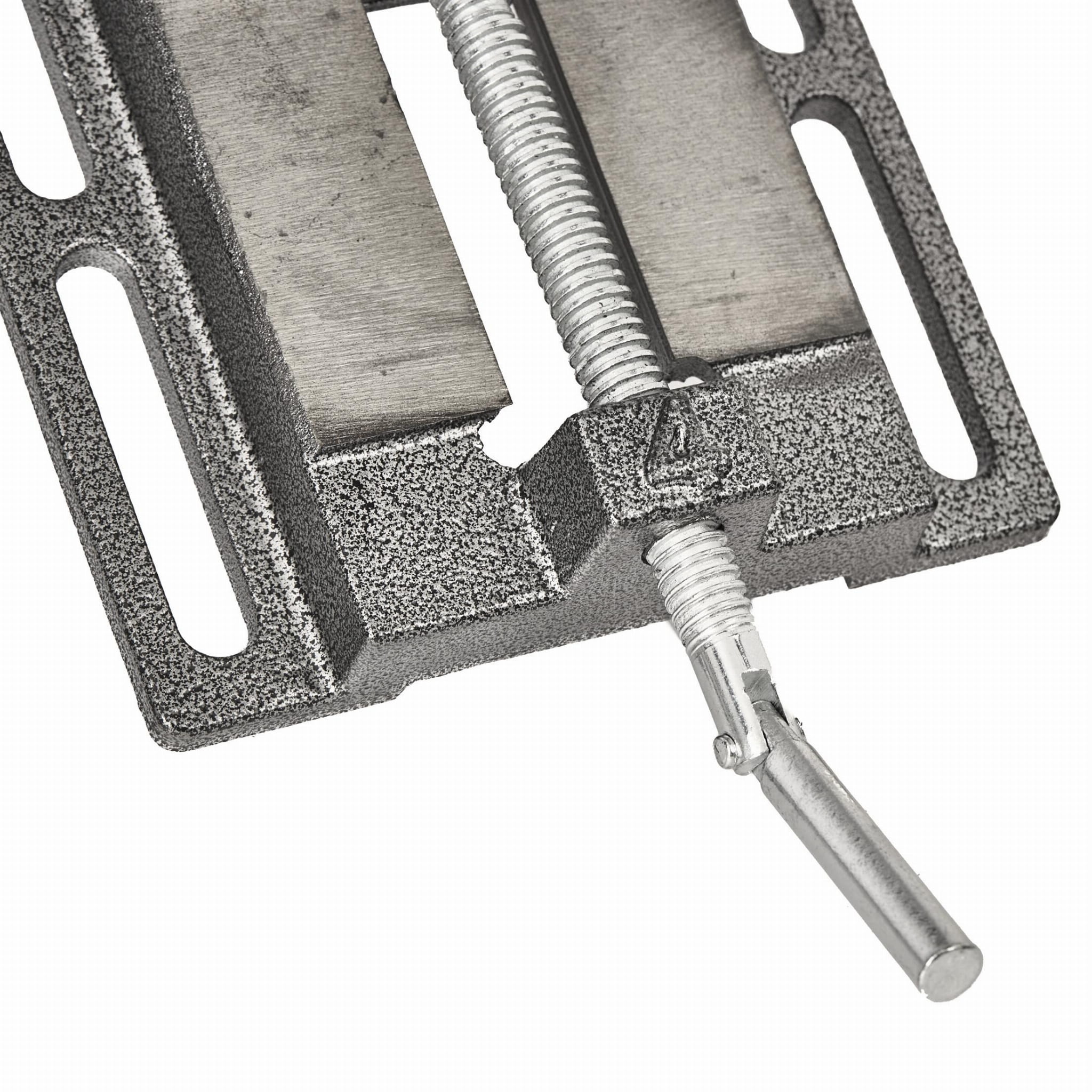 Śruba pociągowa została wyposażona w moletowane pokrętło i luźną przetyczkę, co zwiększa wygodę i precyzję pracy. Imadło wykonane jest z wytrzymałego żeliwa, gwarantującego długą żywotność i stabilność podczas użytkowania.