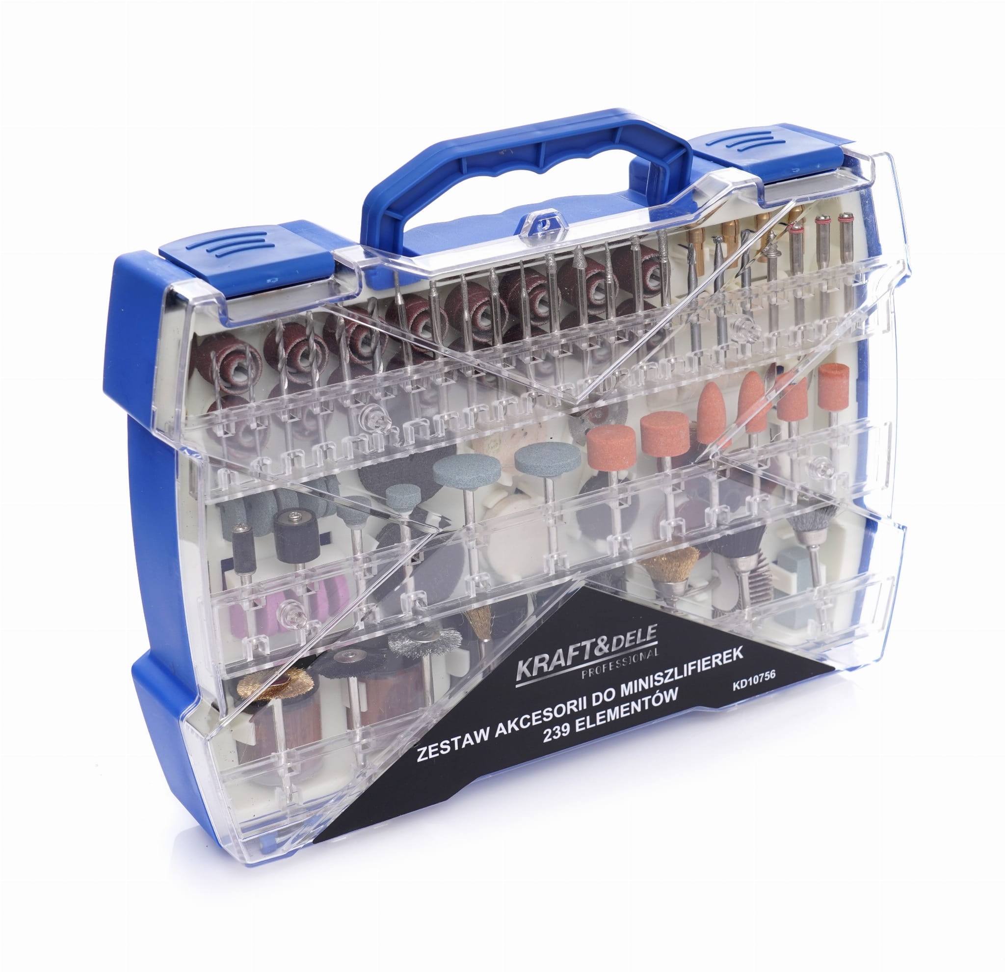 Uniwersalny zestaw akcesoriów do miniszlifierki to zestaw składający się ze 239 sztuk osprzętu różnego przeznaczenia.