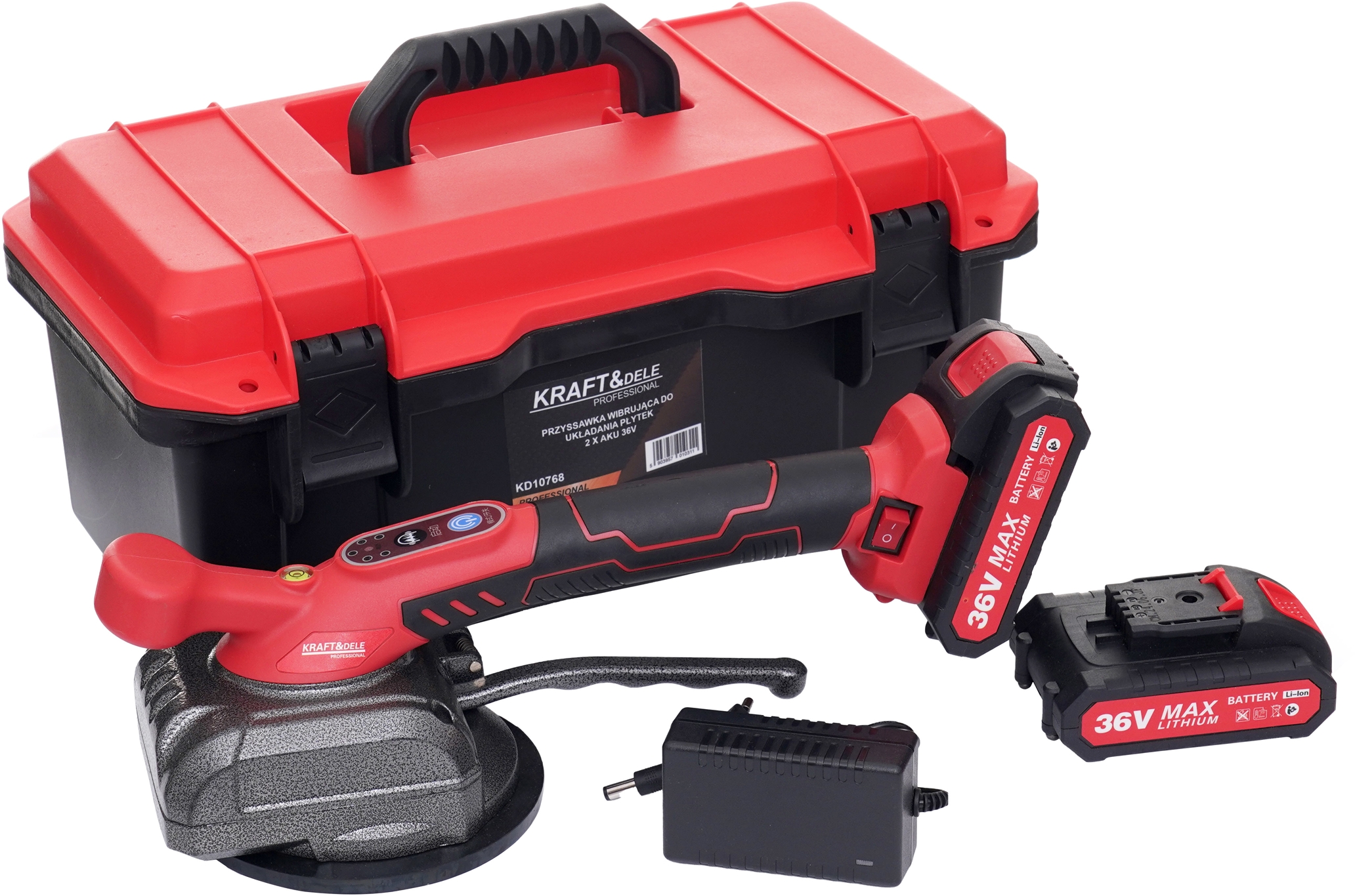 Model KD10768 został wyposażony w funkcję wibracji, która skutecznie eliminuje pęcherzyki powietrza spod powierzchni płytki, co przekłada się na lepszą przyczepność i trwałość montażu. Regulacja prędkości w 5 stopniach pozwala dostosować intensywność pracy do rodzaju materiału oraz warunków montażowych. Zasilanie akumulatorowe oraz dołączone dwie baterie zapewniają wygodę pracy bez przewodów, a praktyczna walizka ułatwia transport i przechowywanie zestawu. Przyssawka została wyposażona w ergonomiczny uchwyt, który pozytywnie wpływa na komfort i wygodę pracy. Dodatkowo urządzenie posiada wbudowaną poziomicę, ułatwiającą precyzyjne ustawienie płytek podczas montażu.