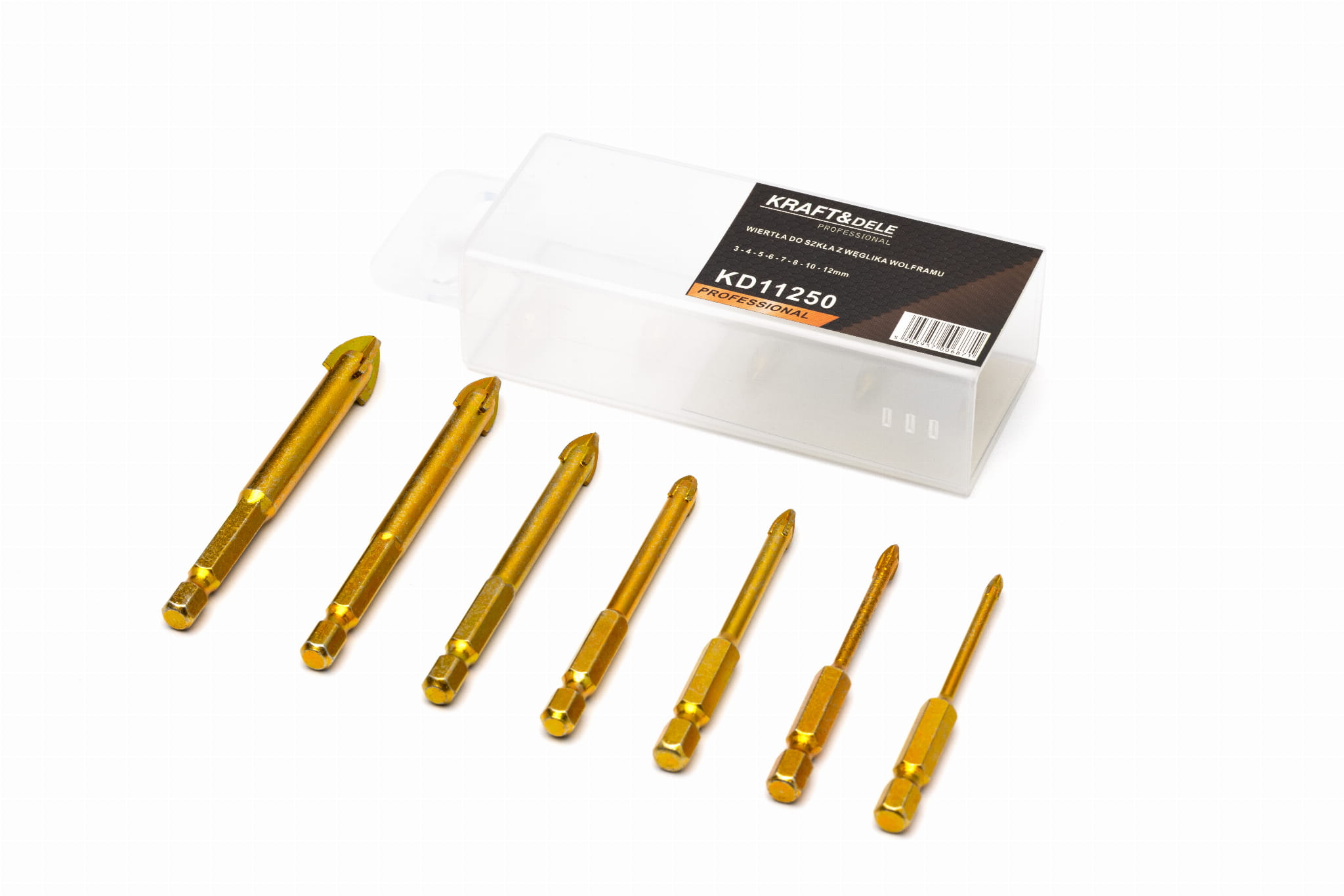 Zestaw wielofunkcyjnych wierteł do szkła przeznaczony do wiercenia bezudarowego w drewnie, tworzywie sztucznym, aluminium, cegle, szkle, ceramice marki Kraft&dele model KD11250.