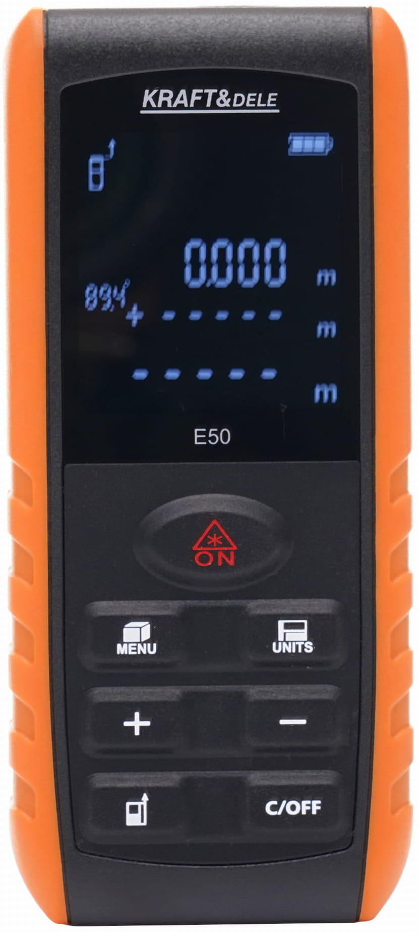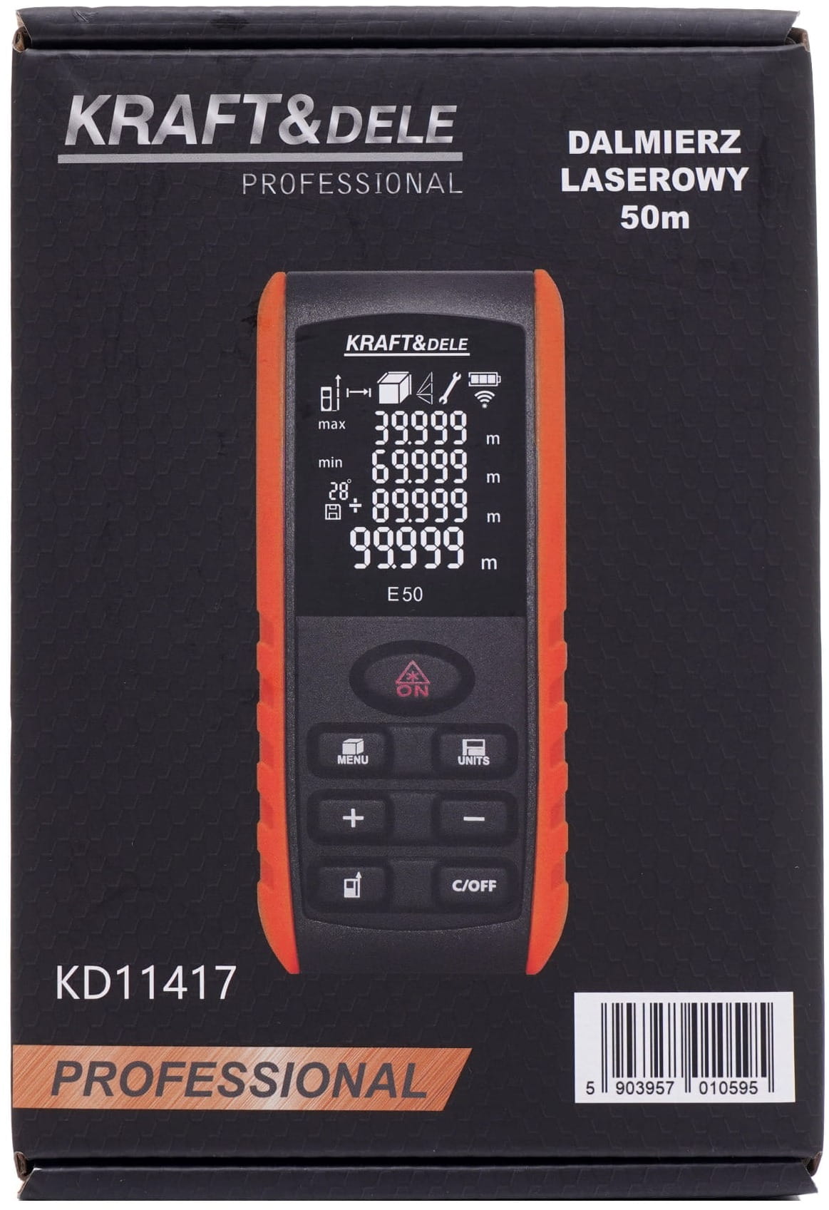 dalmierz laserowy; miernik laserowy 50m; laserowy miernik odległości; dalmierz budowlany; miarka laserowa; dalmierz elektroniczny; miernik odległości LCD; KD11417; KRAFT&DELE;