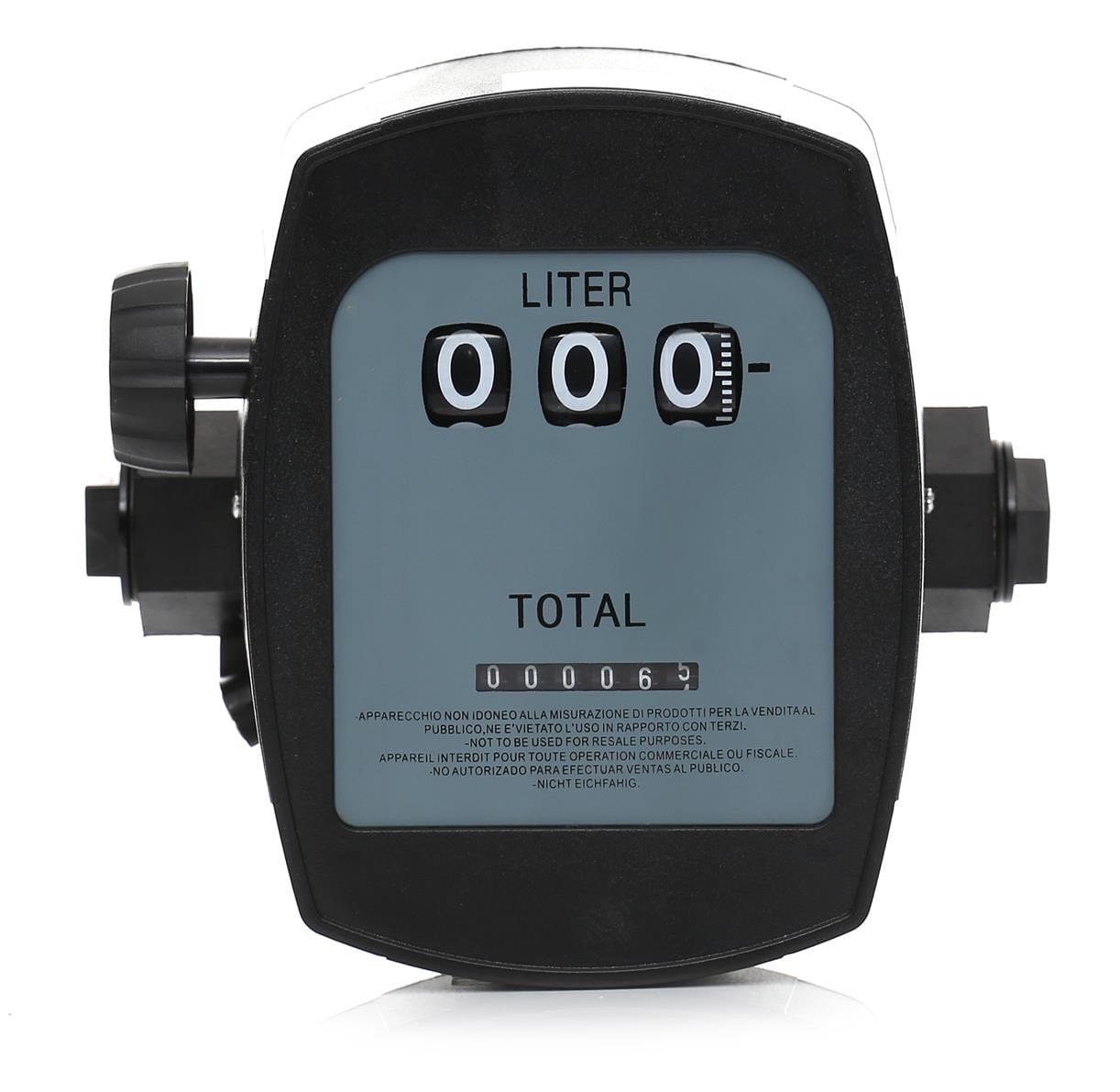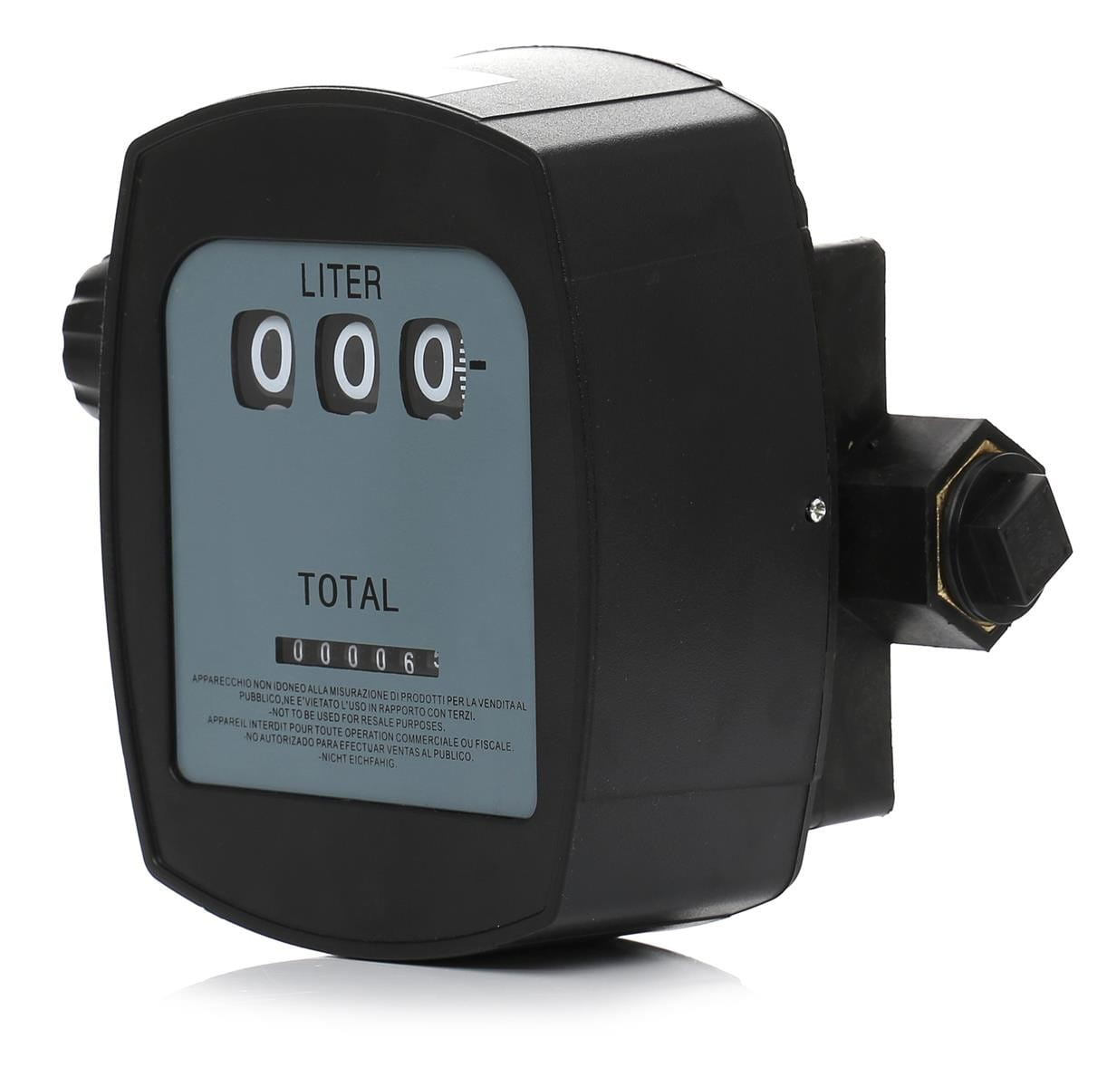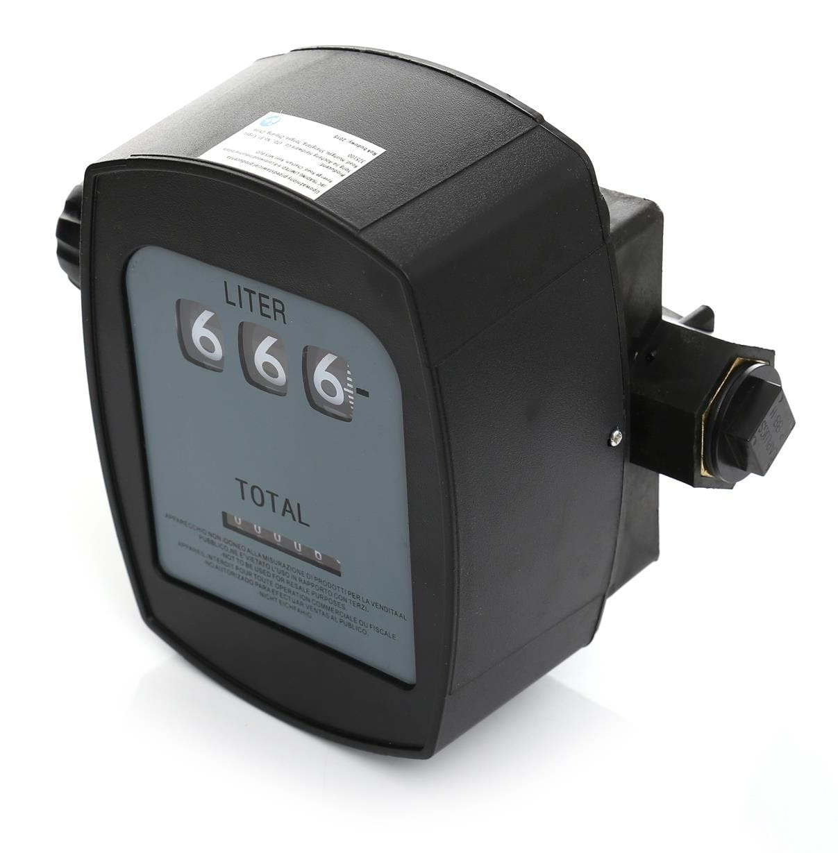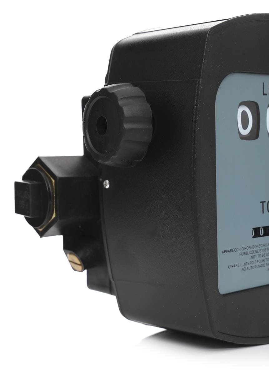 Otwory przepływowe mogą być ustawione w pozycji pionowej lub poziomej. Prosty licznik wskazuje wartość do 999 galonów lub litrów. Dolny główny licznik wskazujący łączne użycie produktu może wyświetlić wartość do 999999 galonów lub litrów.