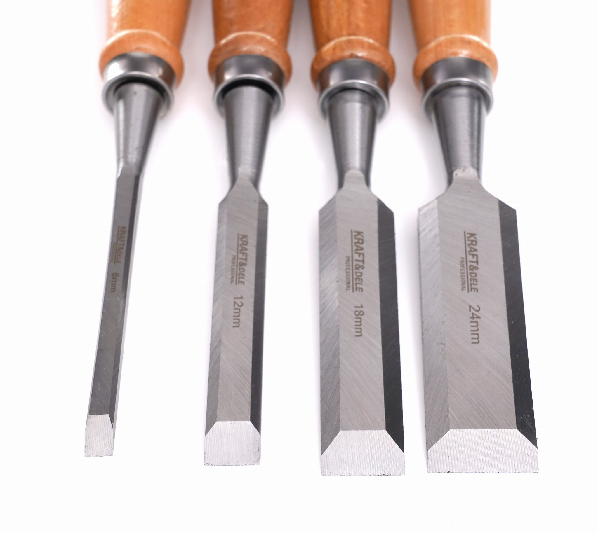 Zestaw profesjonalnych dłut stolarskich 4szt. marki KRAFT&DELE model KD11770. Przeznaczony do obróbki drewna min. do przecinania, wycinania, rzeźbienia itp.