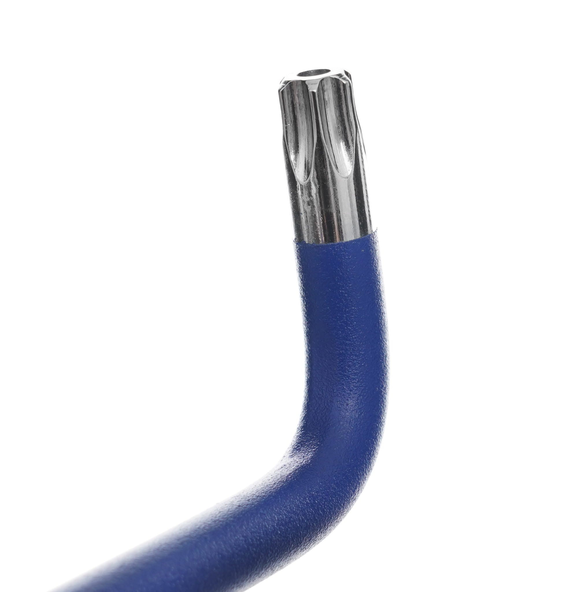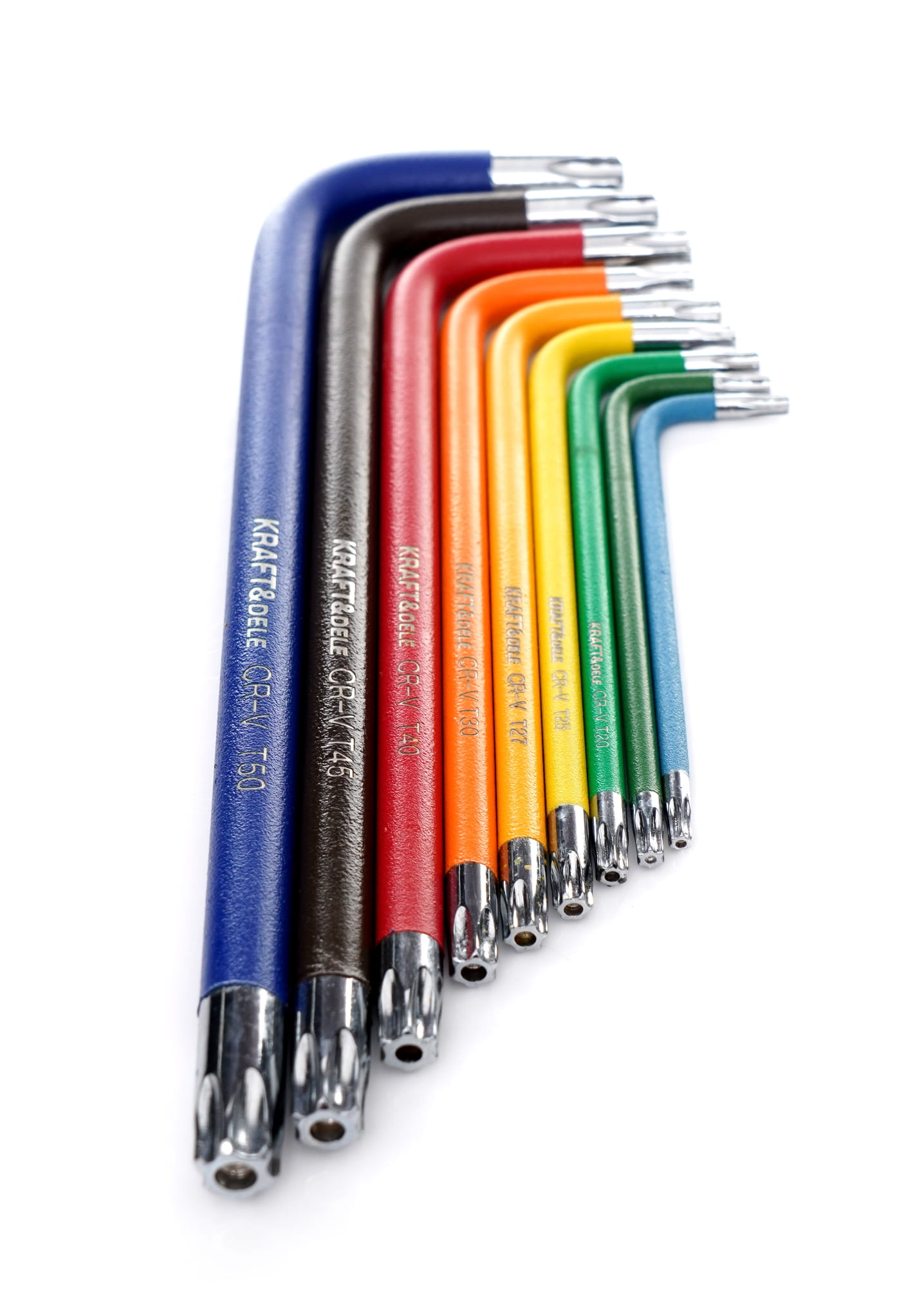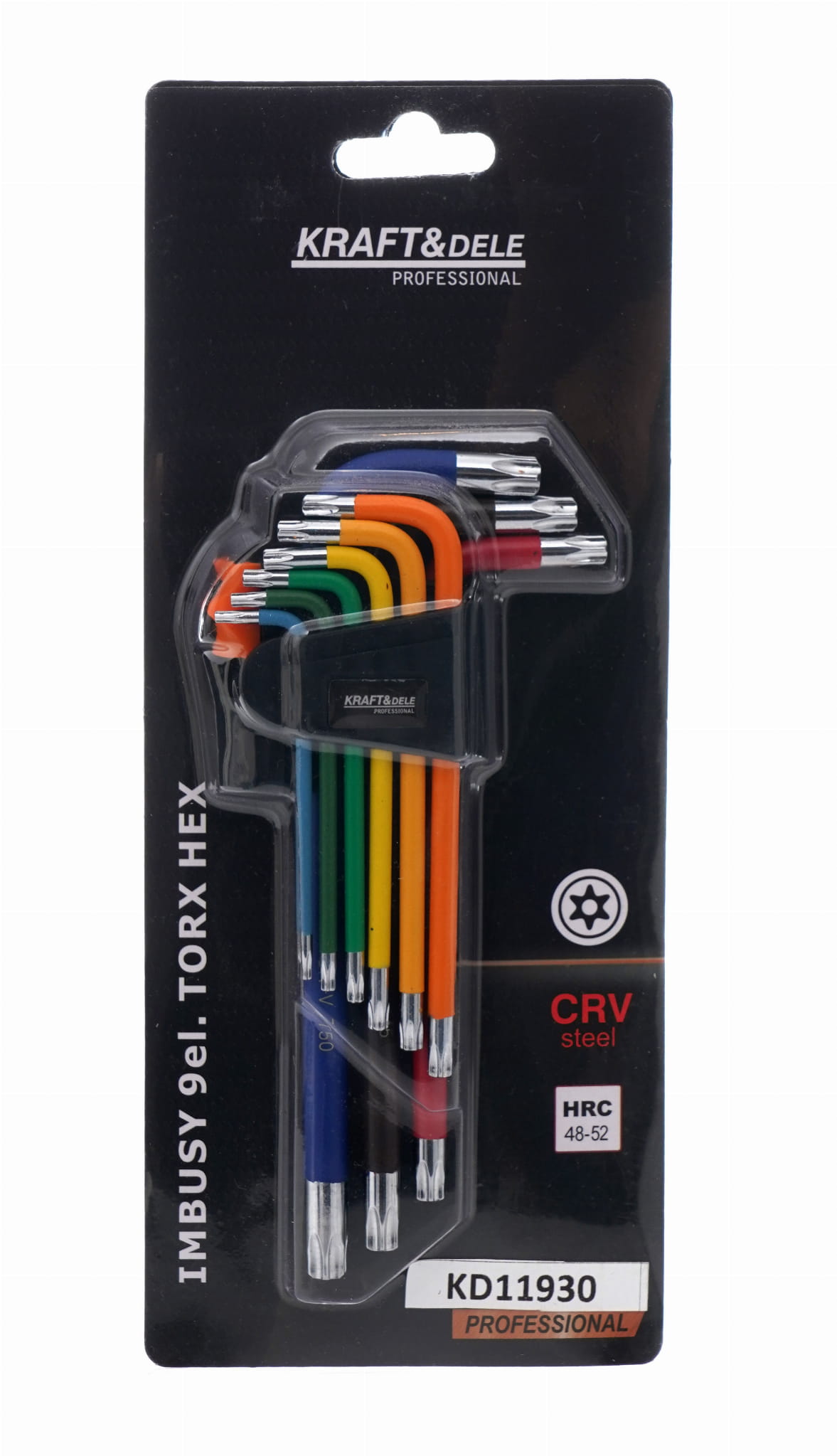 Zestaw kolorowych imbusów marki Kraft&Dele model KD11930 posiadają specjalną końcówkę z otworem dostosowanym do współpracy że śrubami typu TORX.