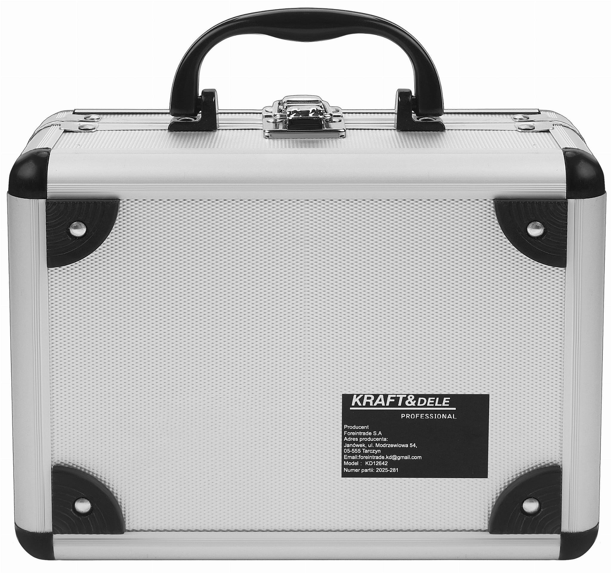 Elementy zestawu zostały starannie zapakowane w solidną walizkę z uchwytem do przenoszenia i zamykaną klamrą, co ułatwia organizację narzędzi i ich bezpieczne przechowywanie.