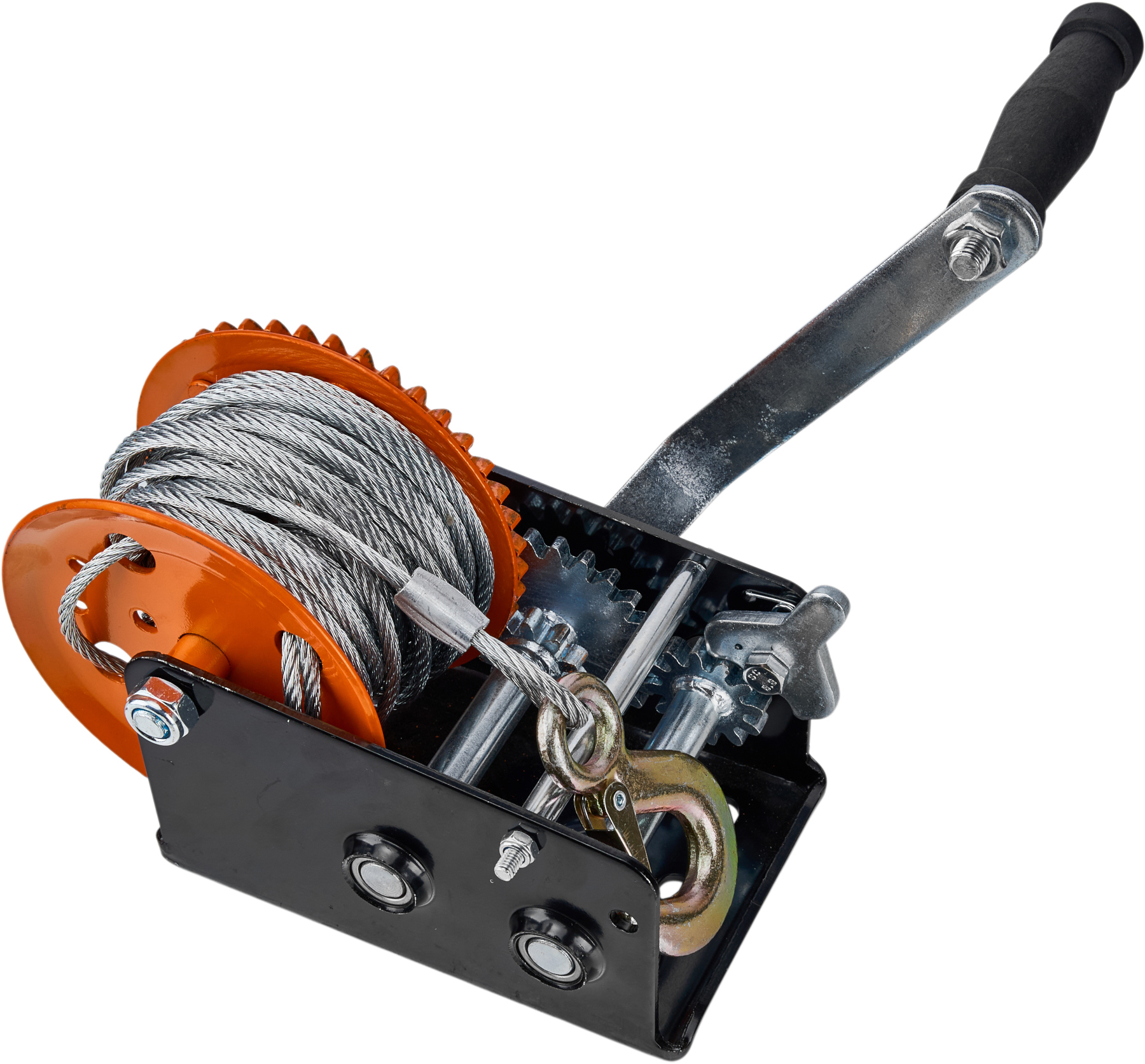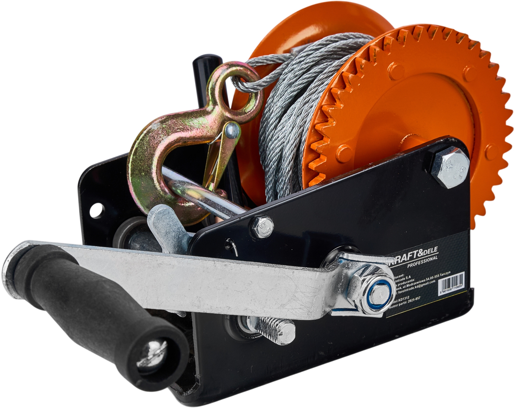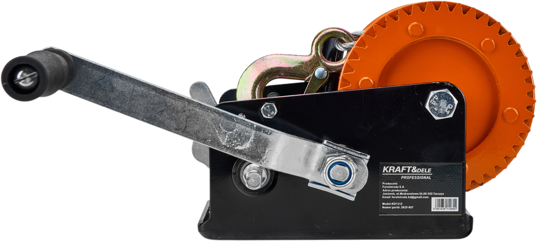 Urządzenie zostało wyposażone w mocny, odlewany hak z dźwignią bezpieczeństwa oraz sprężyną zwrotną, co gwarantuje pewne i stabilne mocowanie ładunku. Ręczna korba współpracująca z precyzyjnym mechanizmem zapadkowym umożliwia płynne i bezproblemowe sterowanie procesem wciągania oraz opuszczania. Stabilna konstrukcja przekładni oraz przełączana blokada biegów zwiększają bezpieczeństwo pracy i zapewniają długą żywotność wciągarki.