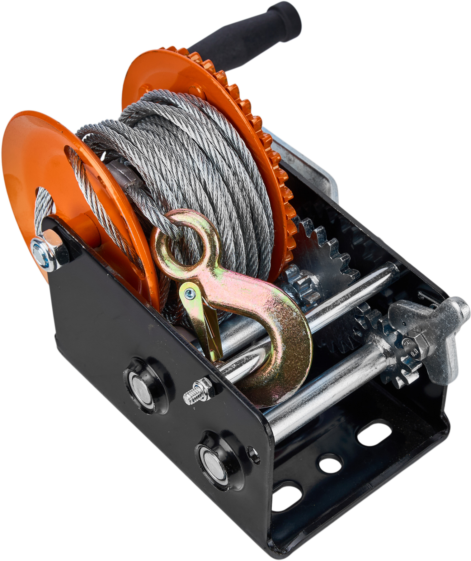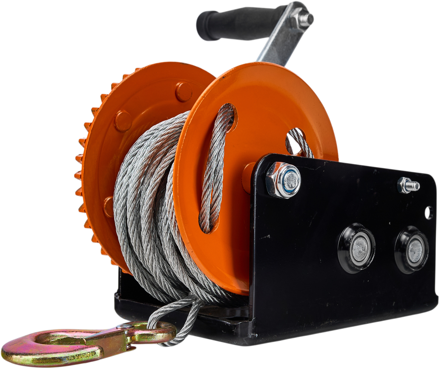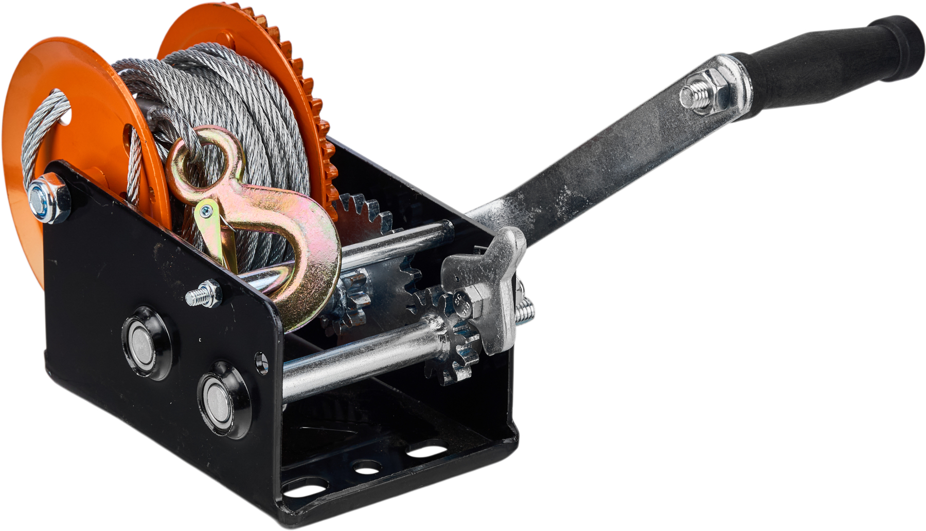 Urządzenie zostało wyposażone w mocny, odlewany hak z dźwignią bezpieczeństwa oraz sprężyną zwrotną, co gwarantuje pewne i stabilne mocowanie ładunku. Ręczna korba współpracująca z precyzyjnym mechanizmem zapadkowym umożliwia płynne i bezproblemowe sterowanie procesem wciągania oraz opuszczania. Stabilna konstrukcja przekładni oraz przełączana blokada biegów zwiększają bezpieczeństwo pracy i zapewniają długą żywotność wciągarki.