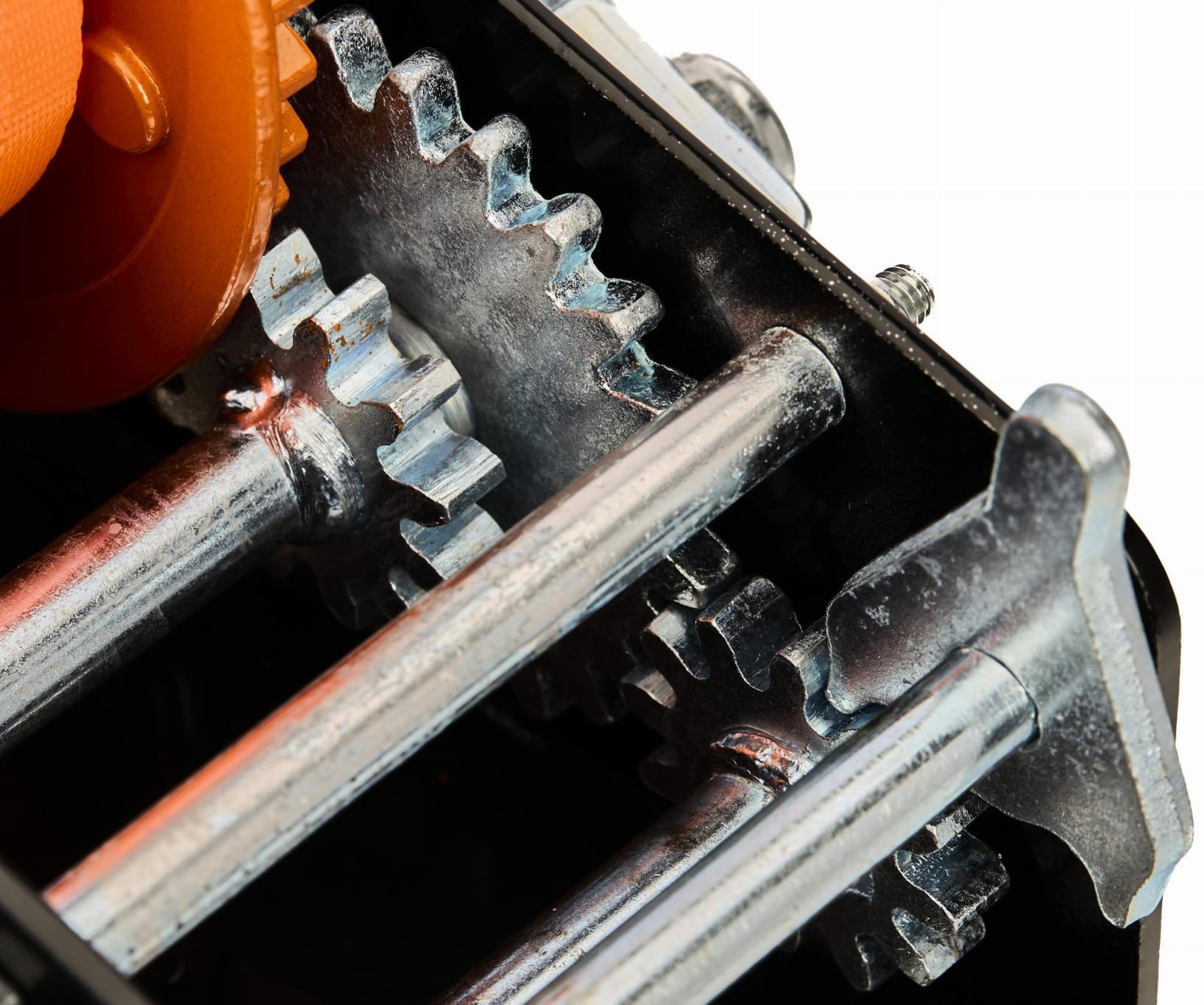Urządzenie wyposażone zostało w mocny, odlewany hak z dźwignią bezpieczeństwa oraz sprężyną zwrotną, co gwarantuje pewne i stabilne mocowanie ładunku. Ręczna korba współpracująca z precyzyjnym mechanizmem zapadkowym umożliwia płynne i bezproblemowe sterowanie procesem wciągania oraz opuszczania. Stabilna konstrukcja przekładni oraz przełączana blokada biegów zwiększają bezpieczeństwo pracy i zapewniają długą żywotność wciągarki nawet przy intensywnym użytkowaniu.