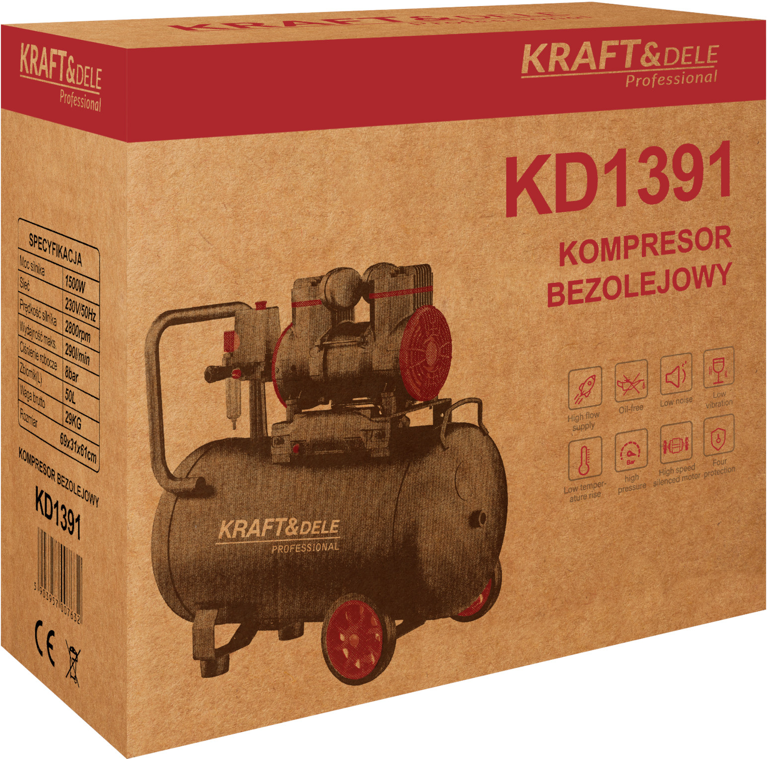 KD1391 to wydajny kompresor bezolejowy marki KRAFT&DELE, zaprojektowany z myślą o pracach warsztatowych, serwisowych oraz przydomowych. Dzięki pojemności zbiornika 50L, wydajnemu silnikowi o mocy 1500W oraz zasilaniu 230V urządzenie doskonale sprawdza się przy pompowaniu kół, czyszczeniu trudno dostępnych miejsc sprężonym powietrzem oraz wielu innych zastosowaniach technicznych.