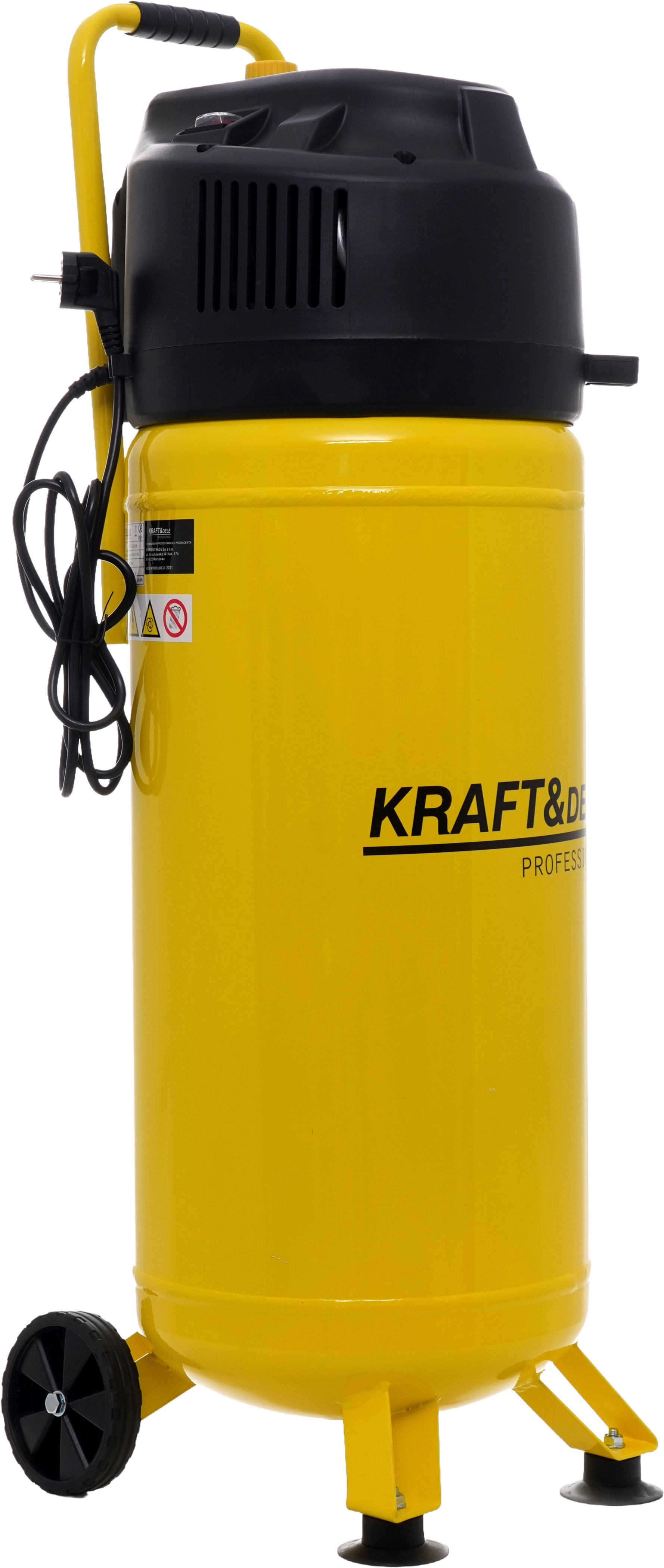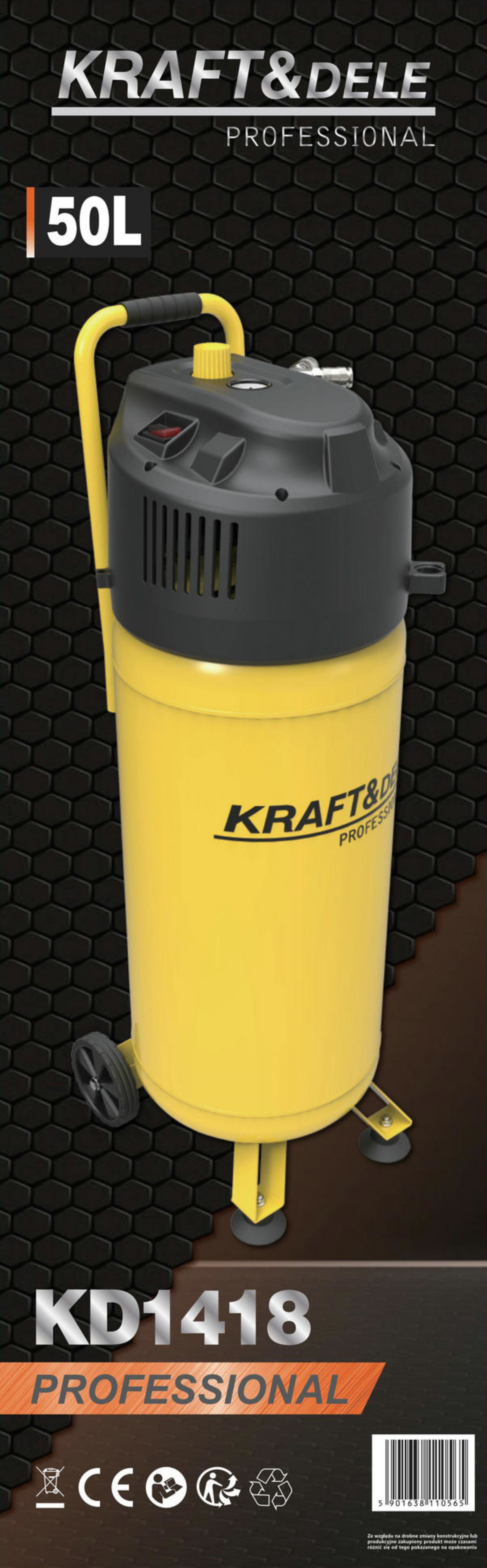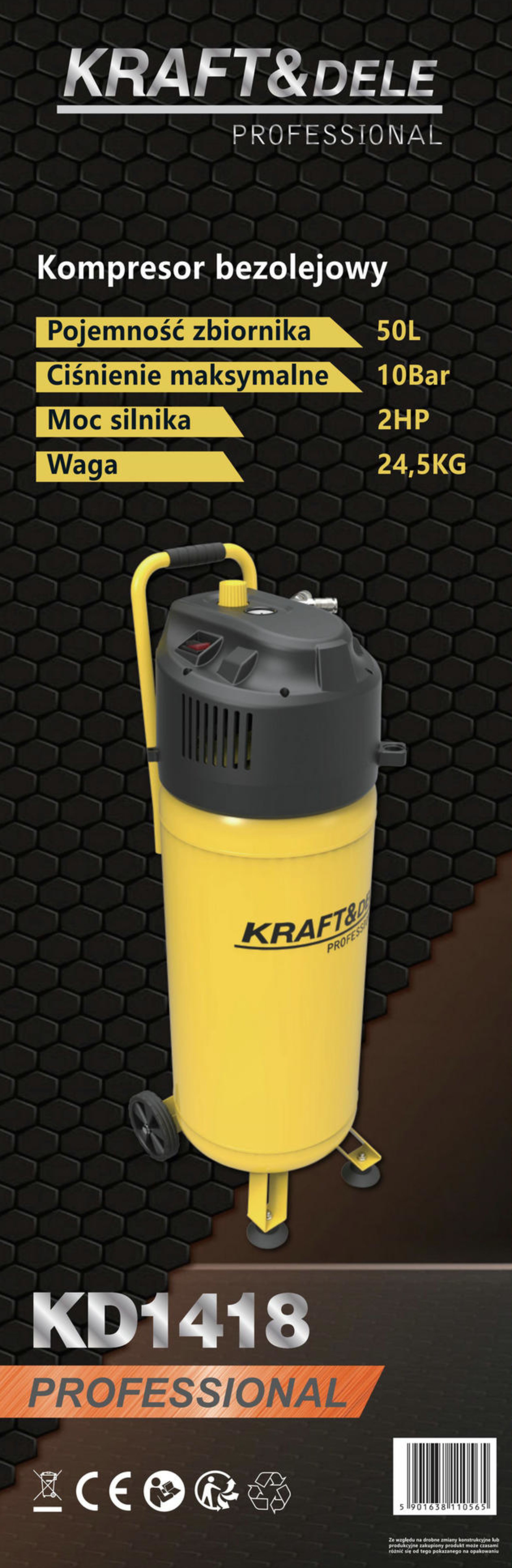 Kompresor został wyposażony w zbiornik o pojemności 50L oraz silnik o mocy 2HP. Maksymalne ciśnienie robocze wynosi 10 bar, co pozwala na efektywną pracę z różnymi urządzeniami pneumatycznymi. Konstrukcja pionowa ułatwia przechowywanie oraz transport urządzenia. Model KD1418 posiada uchwyt transportowy z gąbką, który zapewnia wygodne przenoszenie, a także koła transportowe i stabilne stopki umożliwiające łatwe przemieszczanie oraz pewne ustawienie kompresora podczas pracy. Urządzenie wyposażone jest w manometr do kontroli ciśnienia, wejścia na szybkozłączki oraz przełącznik ON/OFF, a także pokrętło regulacji umieszczone nad manometrem.