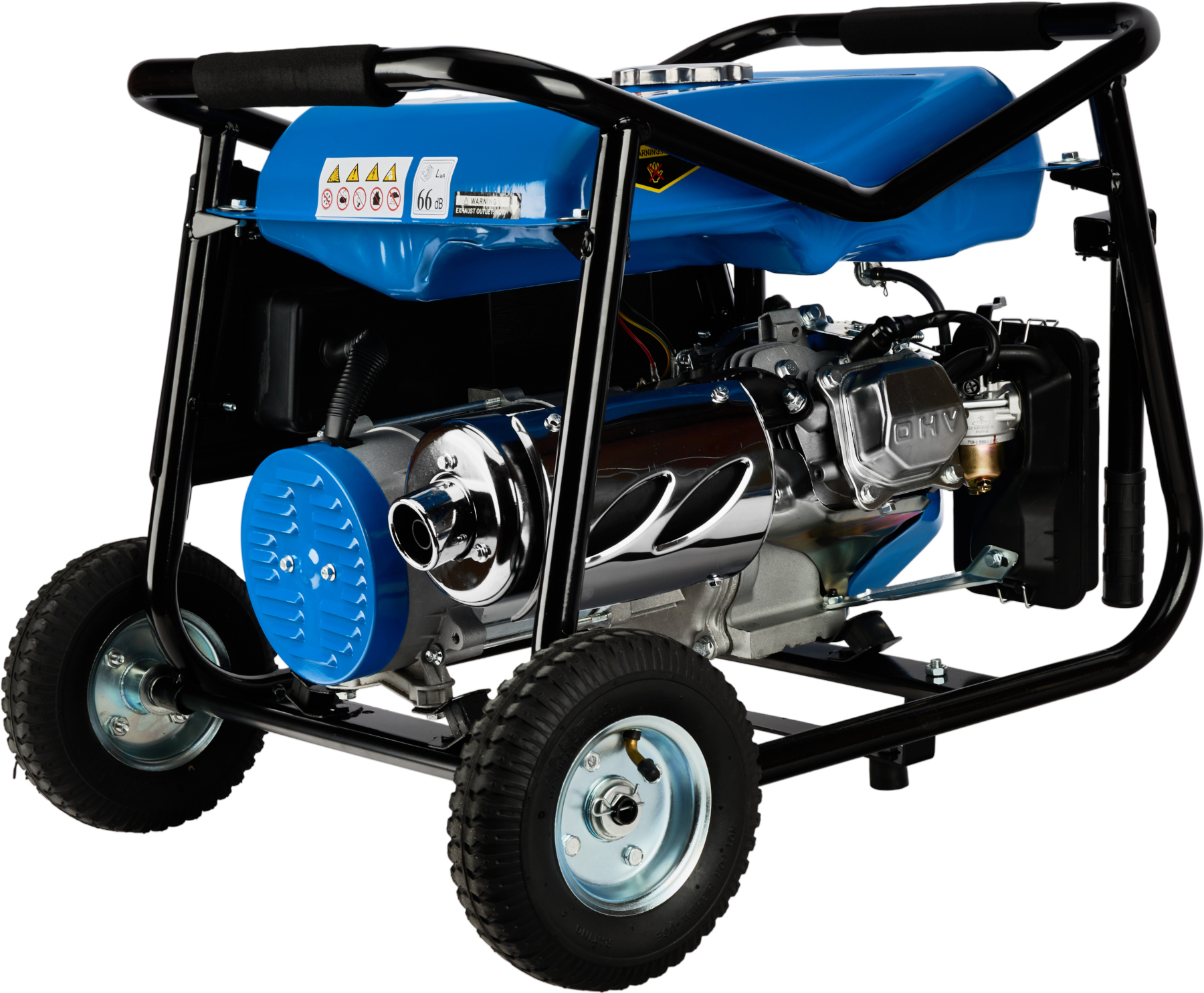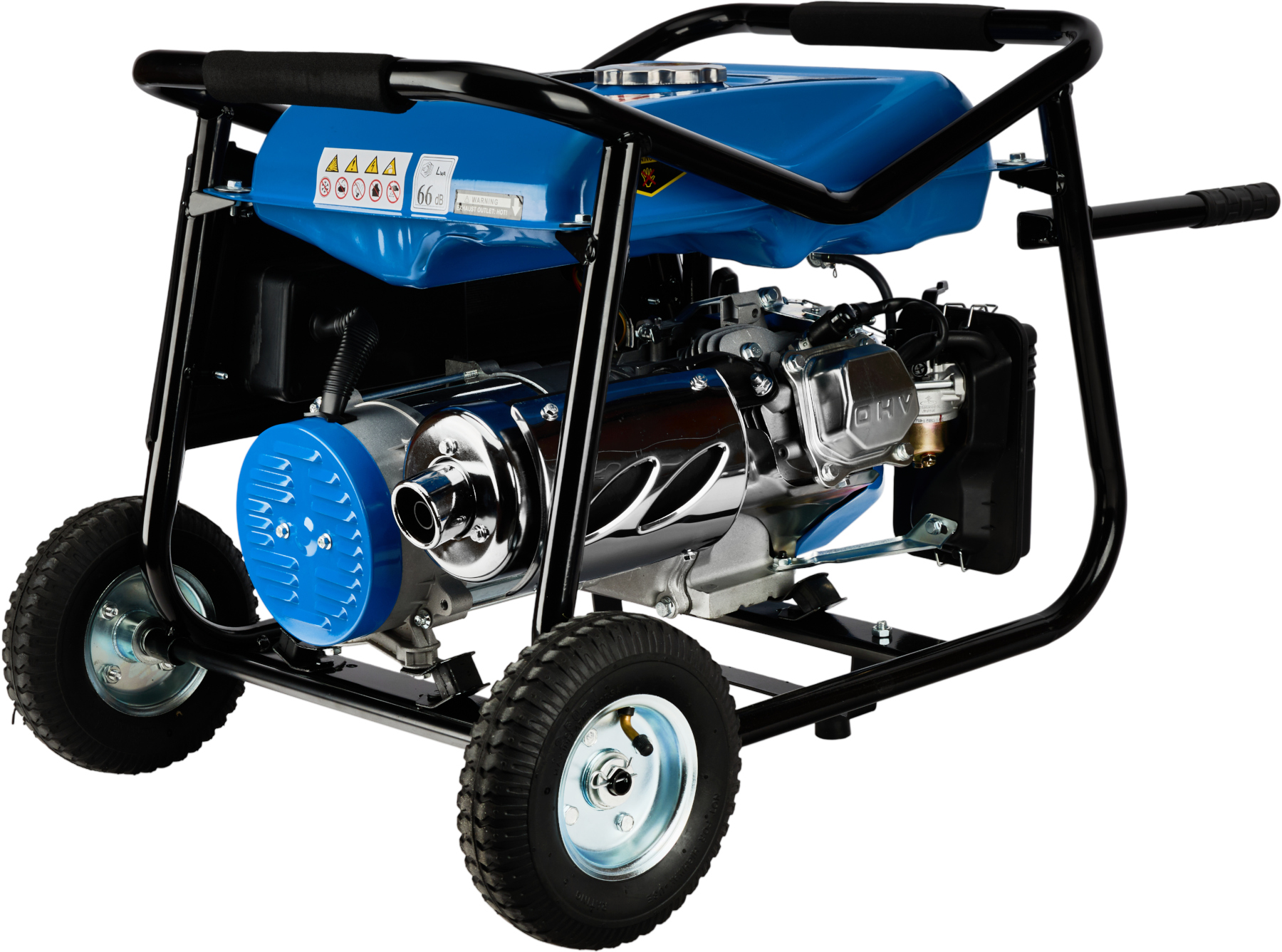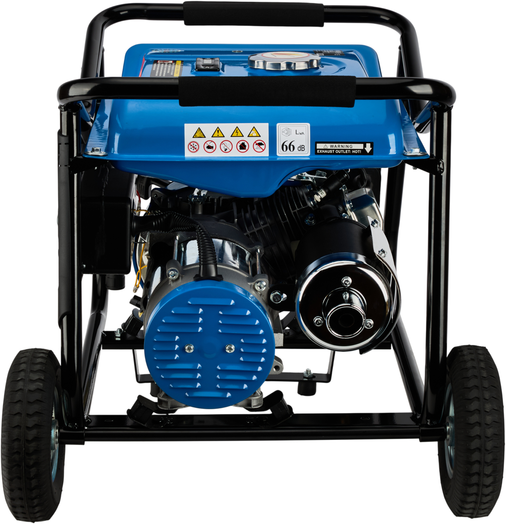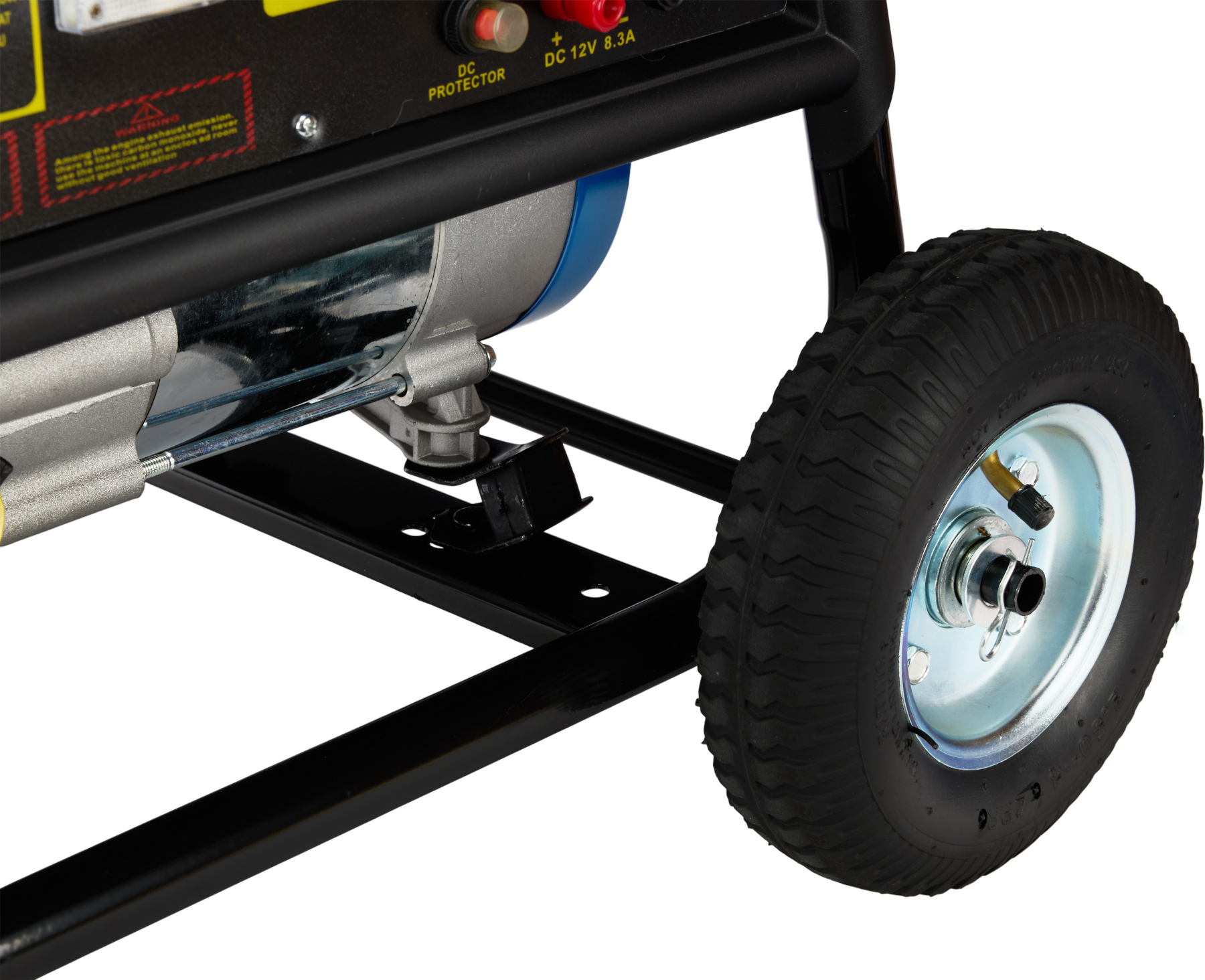 Agregat został wyposażony w trwałe kółka transportowe oraz ergonomiczne rączki, dzięki czemu jego przemieszczanie jest szybkie i wygodne. Gumowe stabilizatory oraz poduszki amortyzujące skutecznie redukują drgania i hałas podczas pracy. Dodatkowo urządzenie posiada czytelny woltomierz oraz wyjście 12 V, umożliwiające ładowanie akumulatorów.