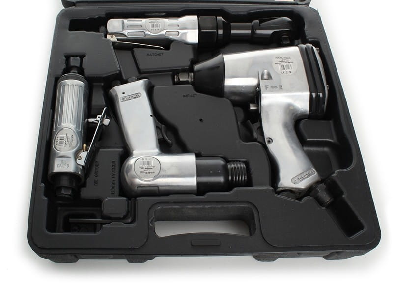 Zestaw pneumatyczny KD1421 Kraft&Dele są to urządzenia przeznaczone dla domowego majsterkowicza jak i fachowca, Poręczne, lekkie, urządzenia pneumatyczne mają szerokie zastosowanie w montażu i demontażu wszystkich połączeń śrubowych. Nasadki wykonane zostały z specjalnej odmiany stali (CrV) chromowo-wanadowa.Chrom i wanadan gwarantuje odporność na korozję, utlenianie ścieranie i dużą wytrzymałość materiału. W zestawie dołączona jest przedłużka umożliwiająca dostanie się do oddalonych połączeń śrubowych, oprzyrządowanie dodatkowe dłuta płaskie, szpicak i ściernice trzpieniowe. Klucz i grzechotka posiadają funkcję obrotów w obie strony prawo/lewo. Całość zapakowana jest w ergonomiczną walizkę.