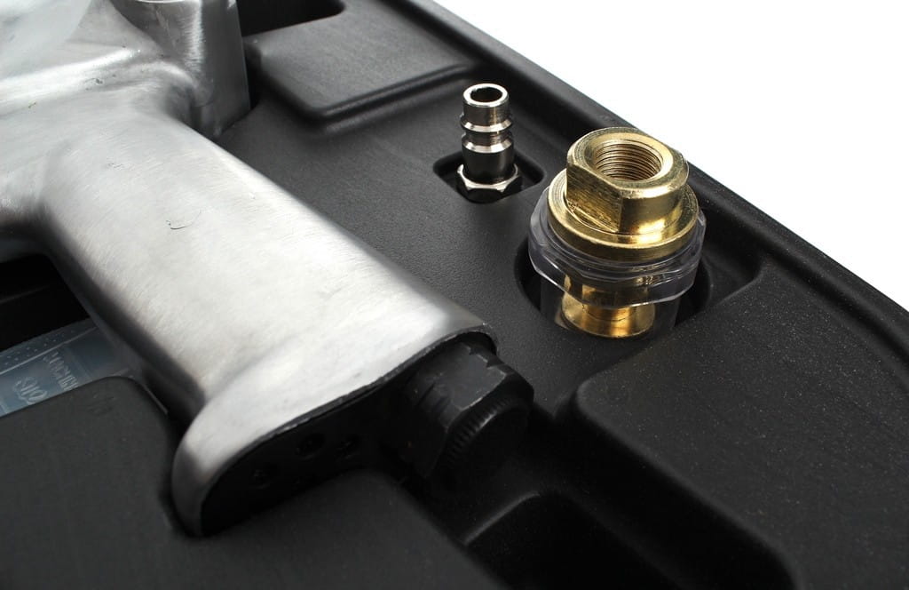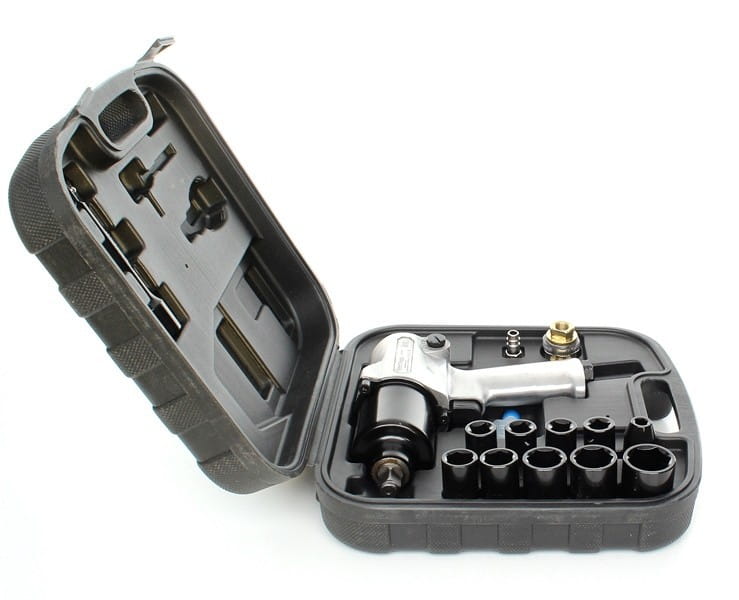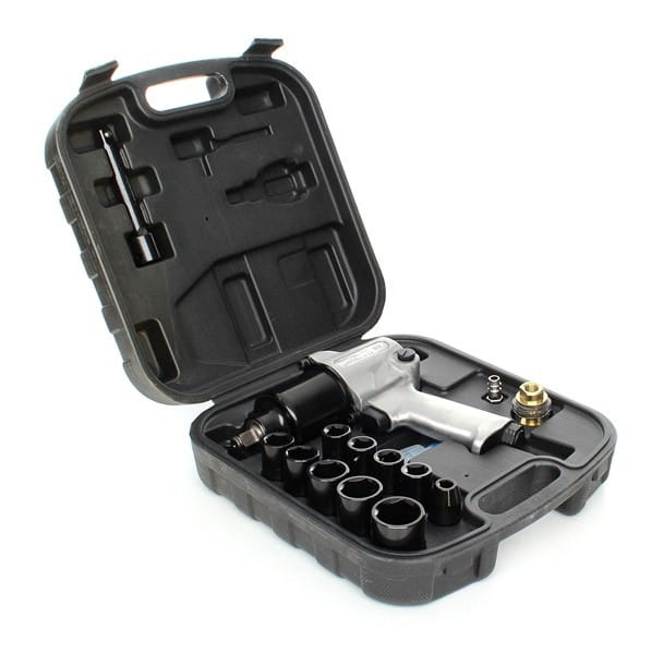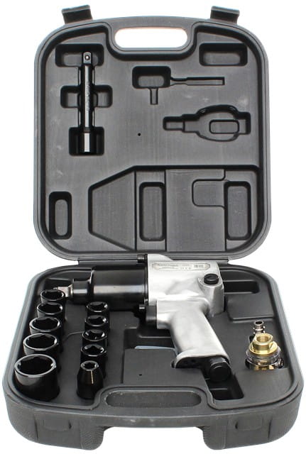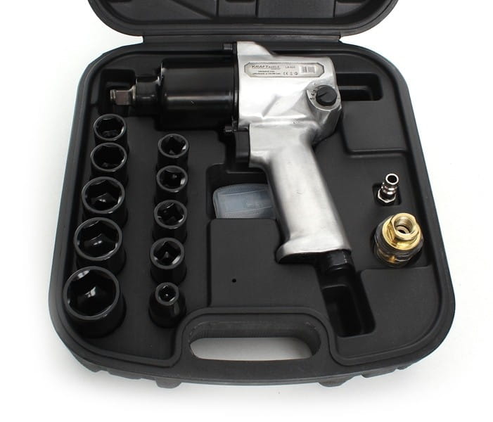 | Cechy: • Model: KD1424 • Prędkość bez obciążenia: 7000 obr/min • Średnie zużycie powietrza: 204 l/min • Napęd czworokątny: 1/2" • Pojemność: 5/8" • Maksymalny moment obrotowy: 569 Nm • Rodzaj sprzęgła: Twin hammer • Długość: 7,3" • Ciśnienie powietrza: 90 PSI • Wlot powietrza: 1,4" • Sprężenie powietrza: 2.5 HP | Skład zestawu • Klucz udarowy pneumatyczny 1/2" KD1424 Kraft&Dele • Przedłużka • 10x nasadek 1/2" ze stali CrV: 9, 10, 11, 13, 14, 17, 19, 22, 24, 27 mm • Olejarka • Złączka • Walizka |