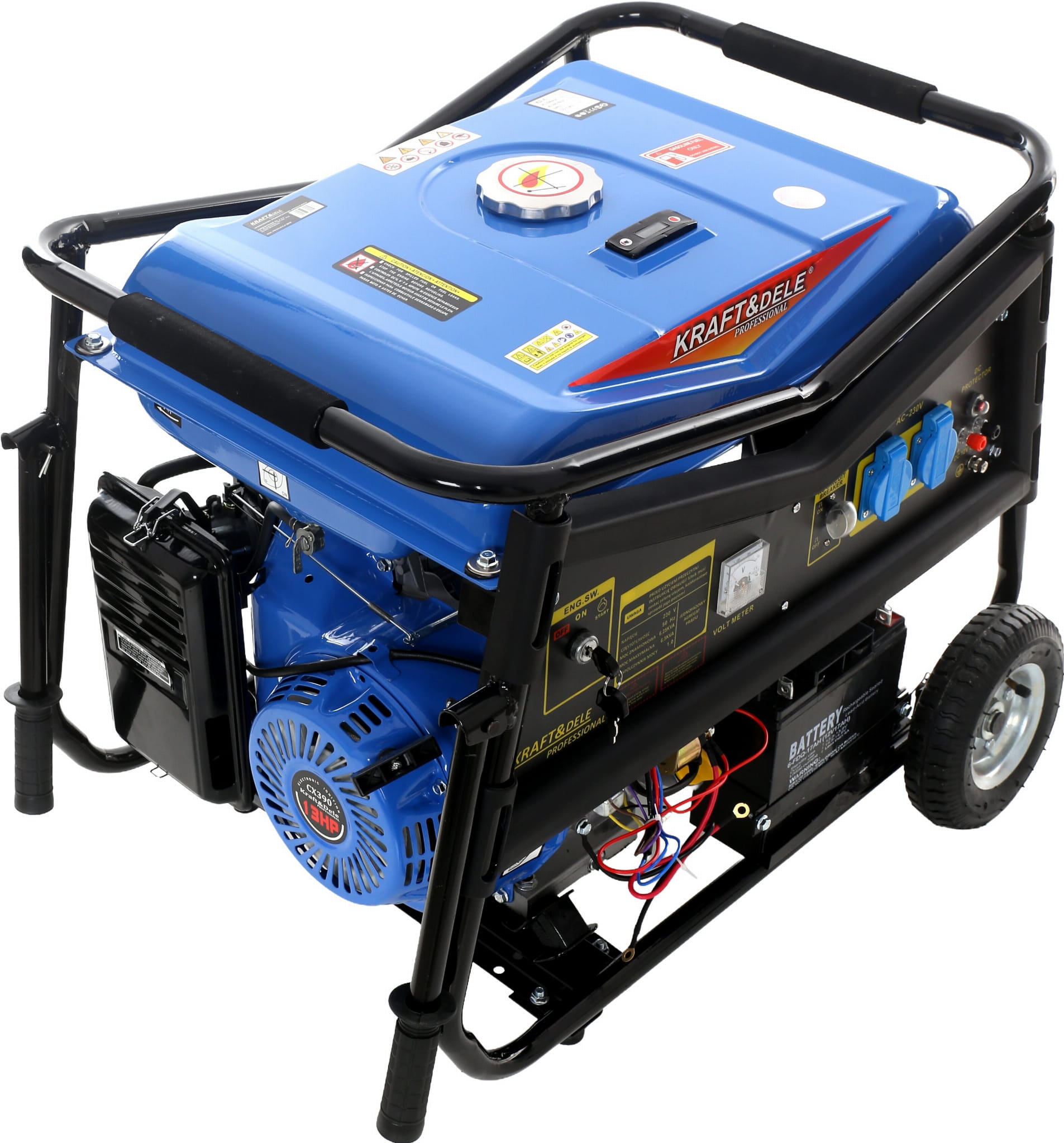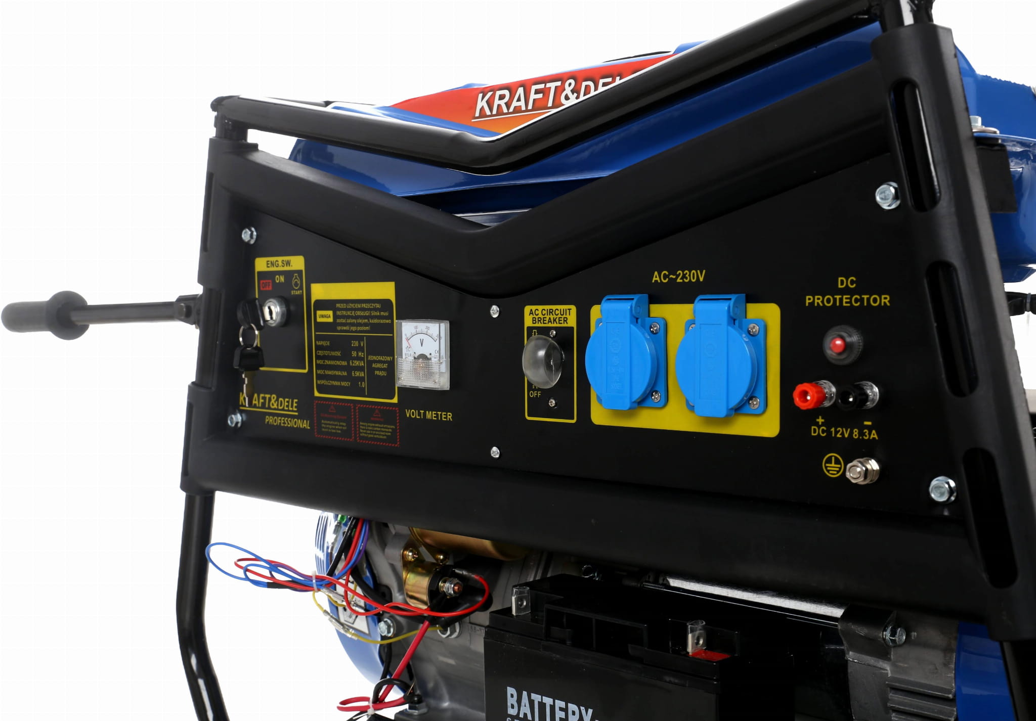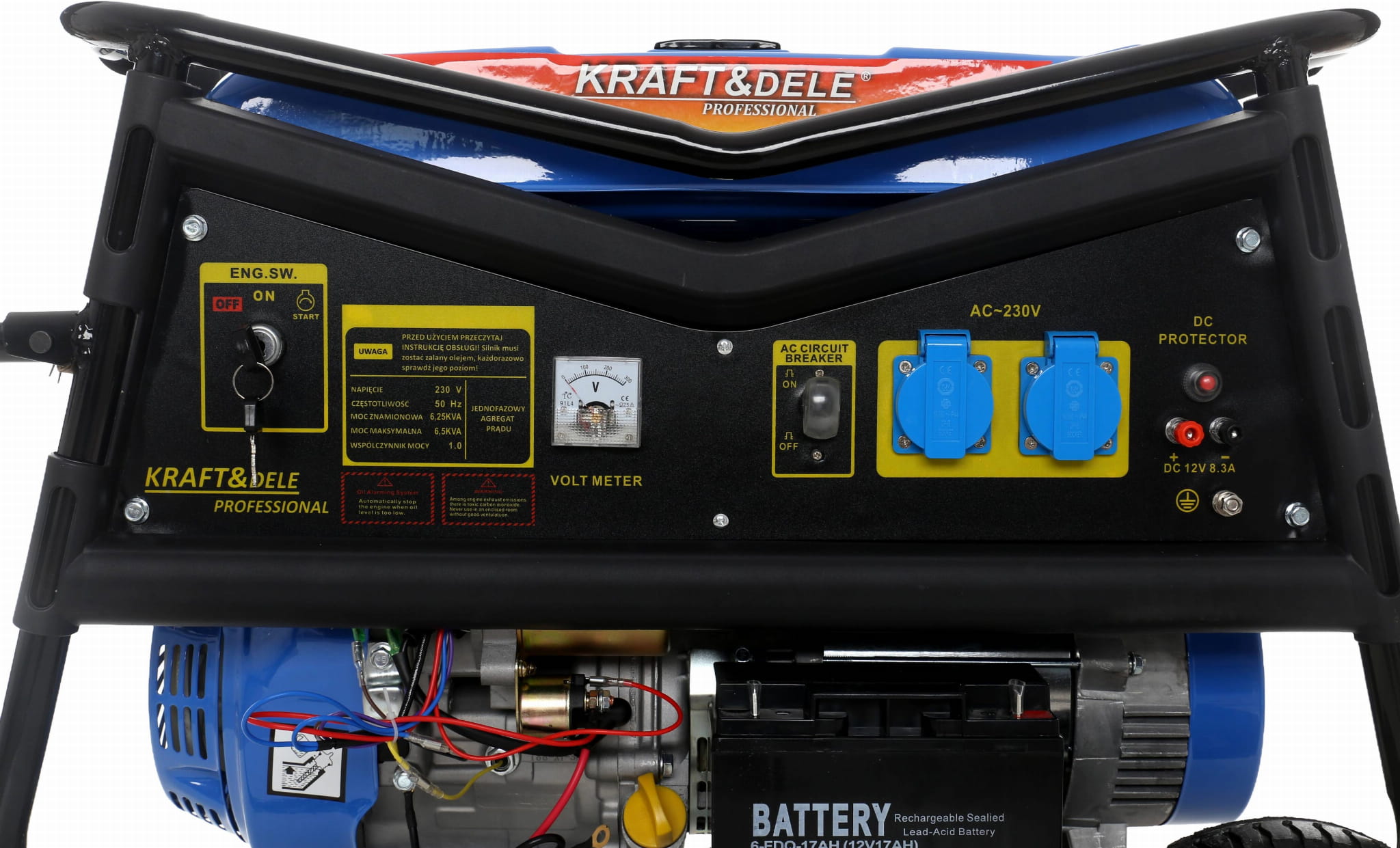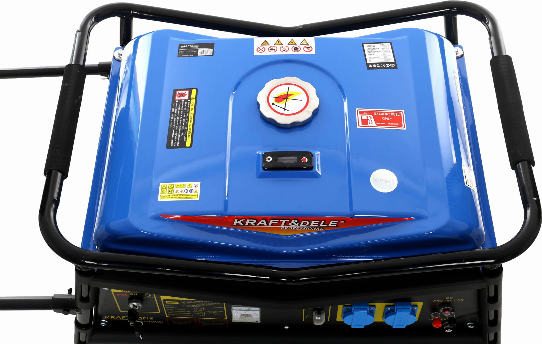 Model KD145 wyposażony jest w rozruch ręczny oraz elektryczny – w zestawie znajduje się akumulator oraz kluczyki do stacyjki, co zapewnia wygodne uruchamianie urządzenia. Dwa gniazda 230V oraz wyjście 12V umożliwiają podłączenie różnego rodzaju odbiorników, w tym ładowanie akumulatorów. Wbudowany woltomierz oraz wskaźnik poziomu paliwa zwiększają kontrolę nad pracą urządzenia.