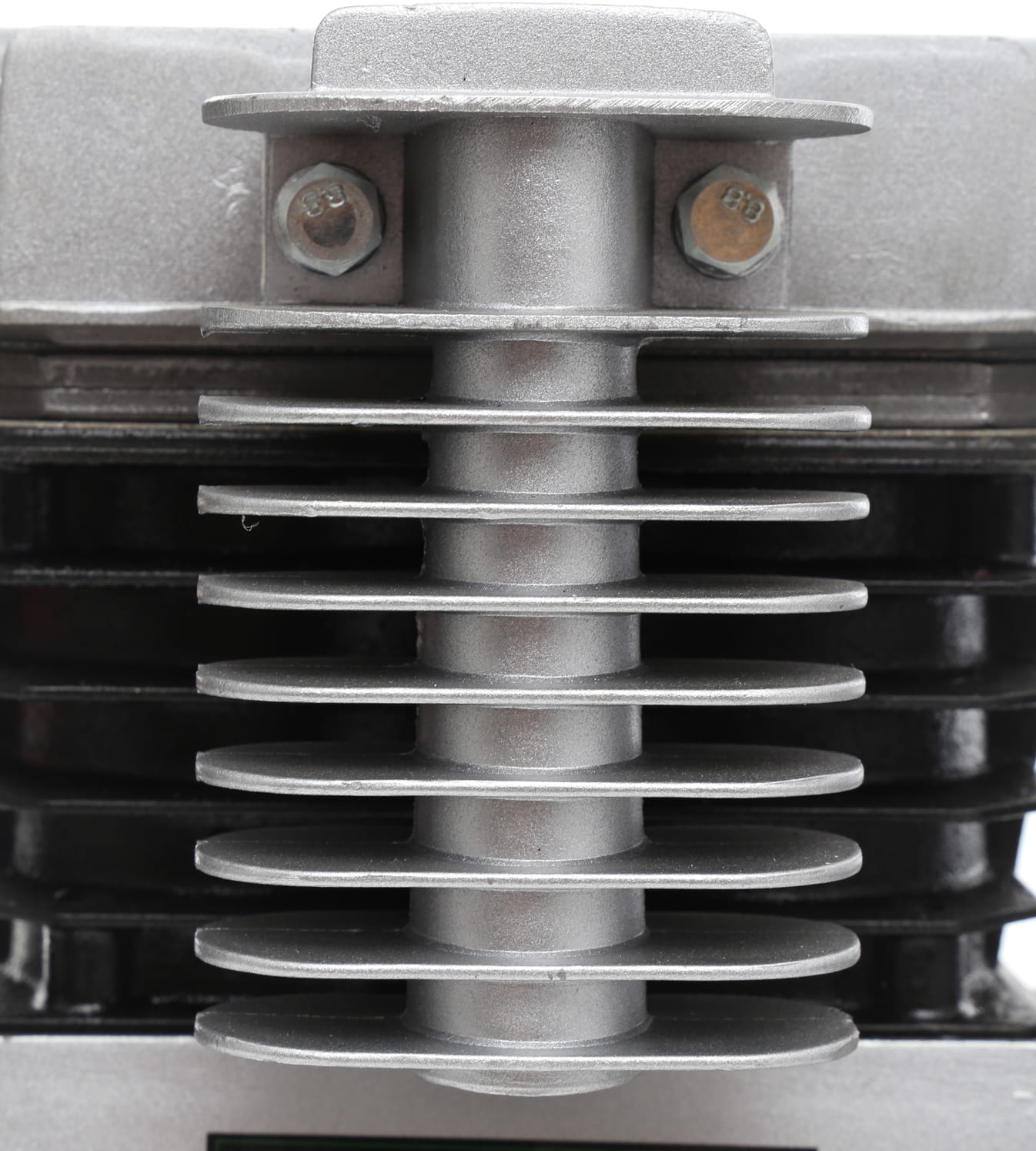 Dwa równoległe tłoki o średnicy 70 mm generują wydajność na poziomie aż 700 L/min oraz ciśnienie robocze do 8 bar. Zalecana moc silnika wynosząca 3 kW / 4 KM pozwala w pełni wykorzystać możliwości urządzenia. Duże, specjalnie wyprofilowane koło pasowe pełni jednocześnie funkcję wentylatora, skutecznie chłodząc sprężarkę i zwiększając jej wydajność oraz trwałość.