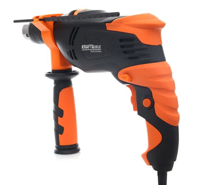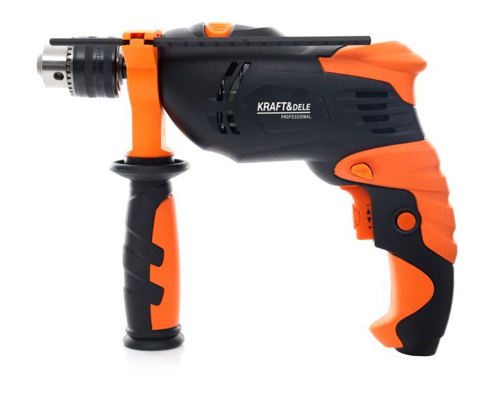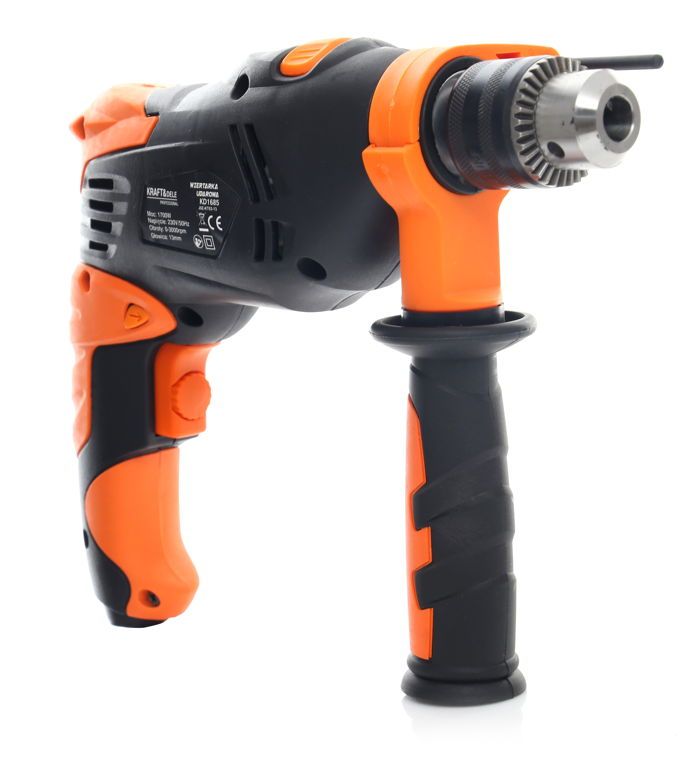 Elektryczna wiertarka udarowa Kraft&Dele KD1685 o mocy 1700W przeznaczona do wiercenia udarowego w murze, betonie i kamieniu oraz do wiercenia w metalu, ceramice, drewnie i tworzywie sztucznym. Główna rękojeść została wykonana ze specjalnego antypoślizgowego materiału ułatwiającego trzymanie urządzenia w dłoni. Jest to wesja wyposażona w dodatkwą rękojeść boczną.Głowica wykonana z tworzywa sztucznego.