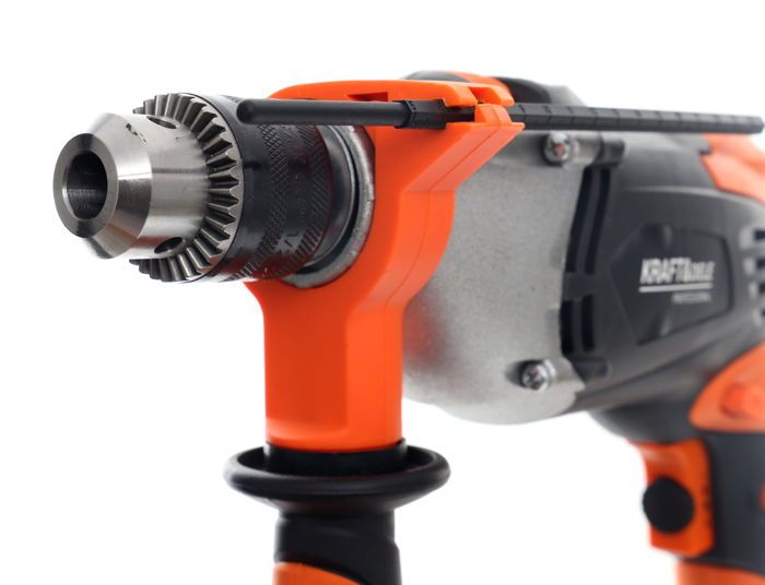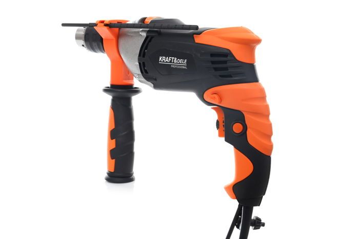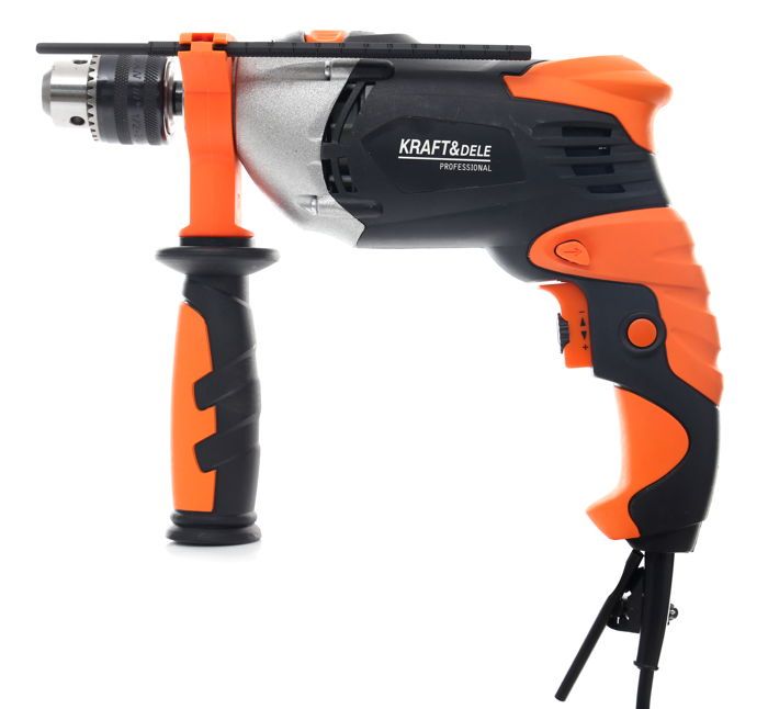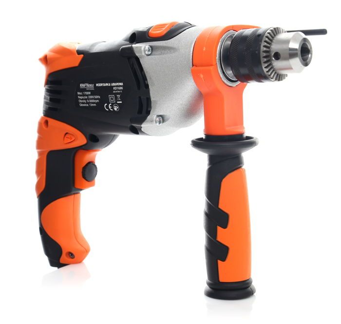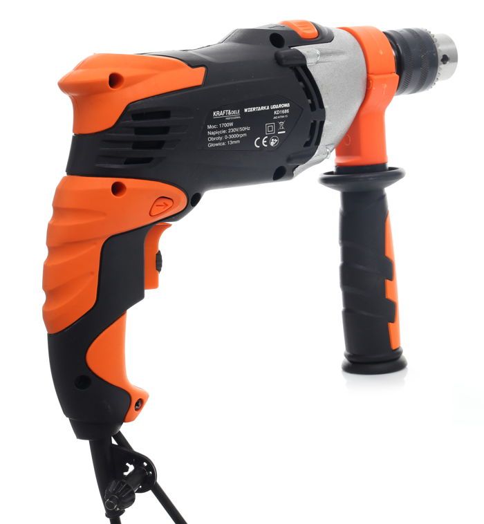 Elektryczna wiertarka udarowa Kraft&Dele KD1686 o mocy 1700W przeznaczona do wiercenia udarowego w murze, betonie i kamieniu oraz do wiercenia w metalu, ceramice, drewnie i tworzywie sztucznym. Główna rękojeść została wykonana ze specjalnego antypoślizgowego materiału ułatwiającego trzymanie urządzenia w dłoni. Jest to wesja wyposażona w dodatkwą rękojeść boczną.Głowica wykonana z metalu.