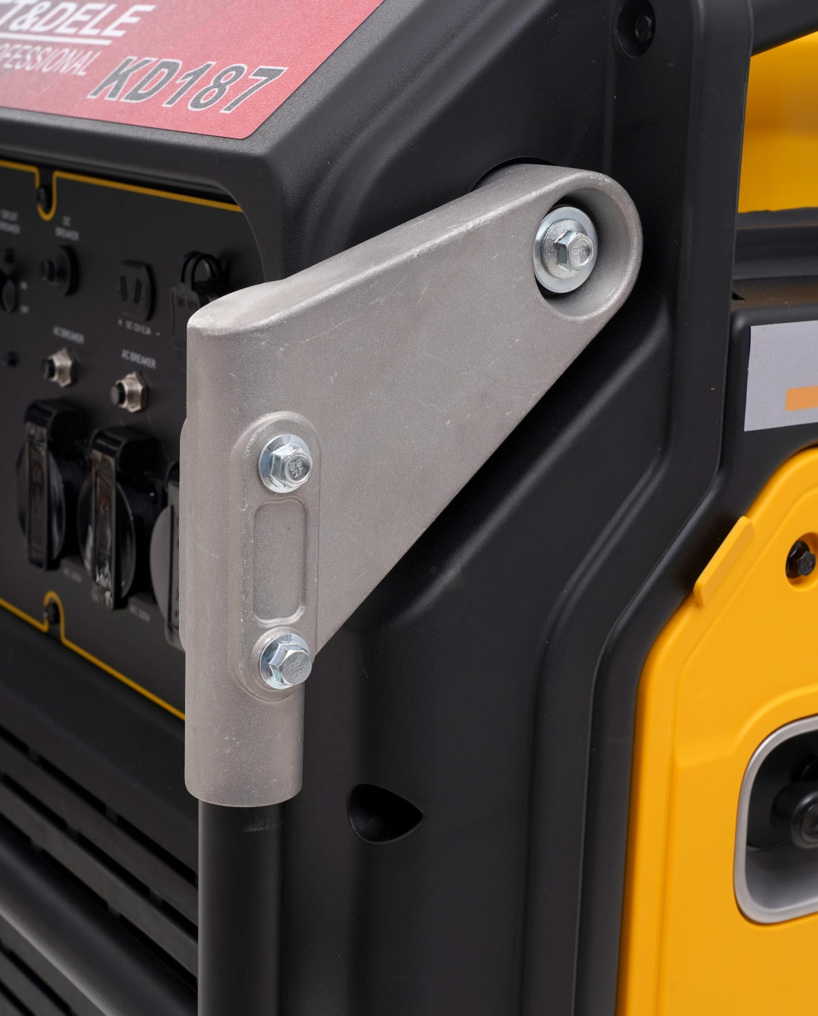 Model KD187 posiada komplet wskaźników informujących o poziomie oleju, przeciążeniu oraz napięciu, co zwiększa bezpieczeństwo i komfort użytkowania. Stabilna konstrukcja, kółka transportowe oraz składane uchwyty umożliwiają wygodne przemieszczanie, a liczne zabezpieczenia chronią urządzenie przed awariami.