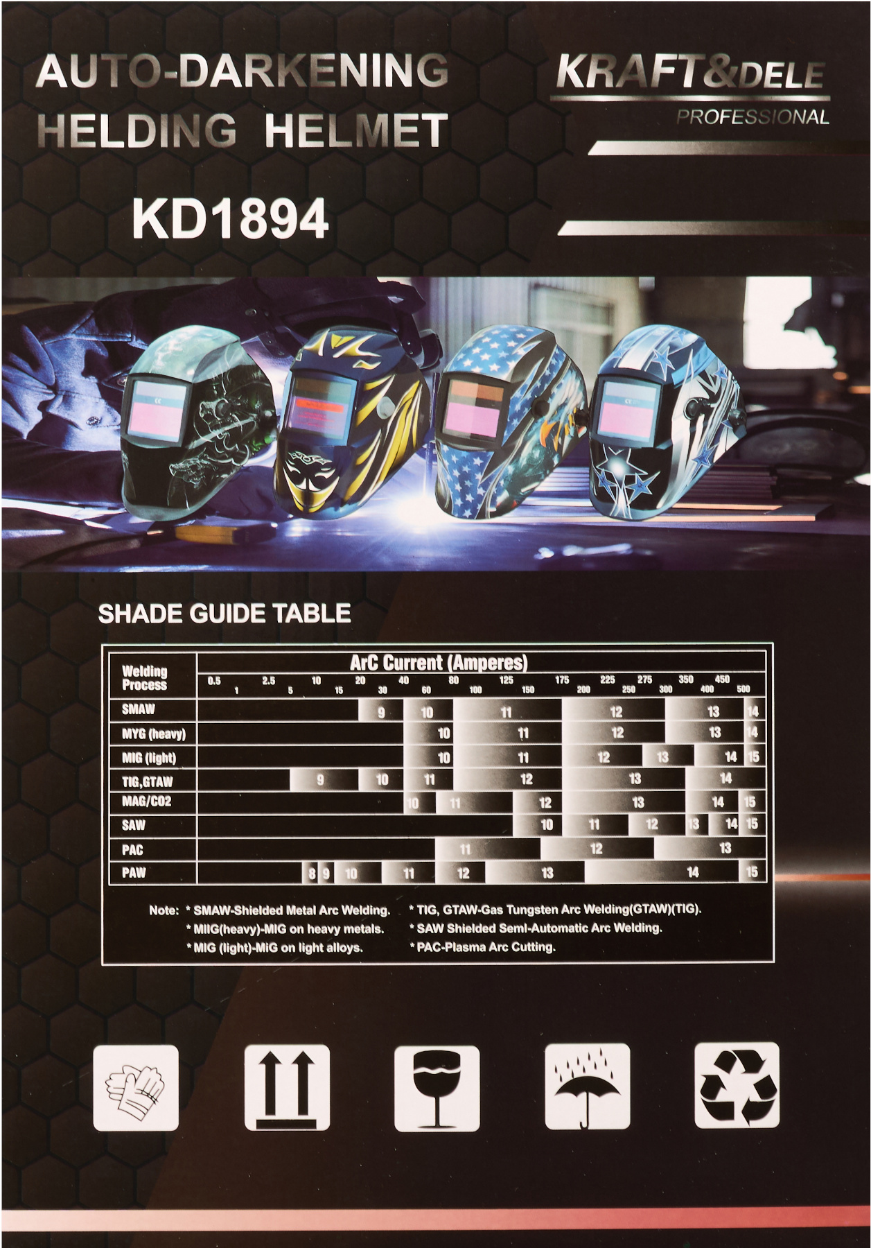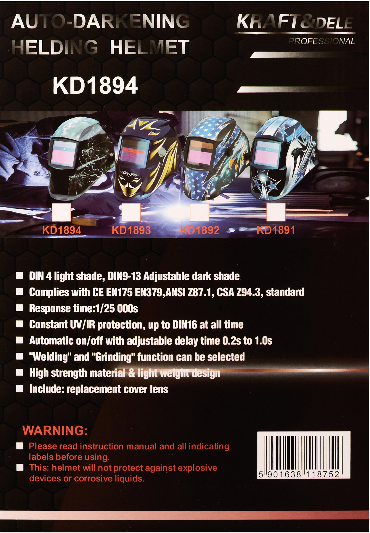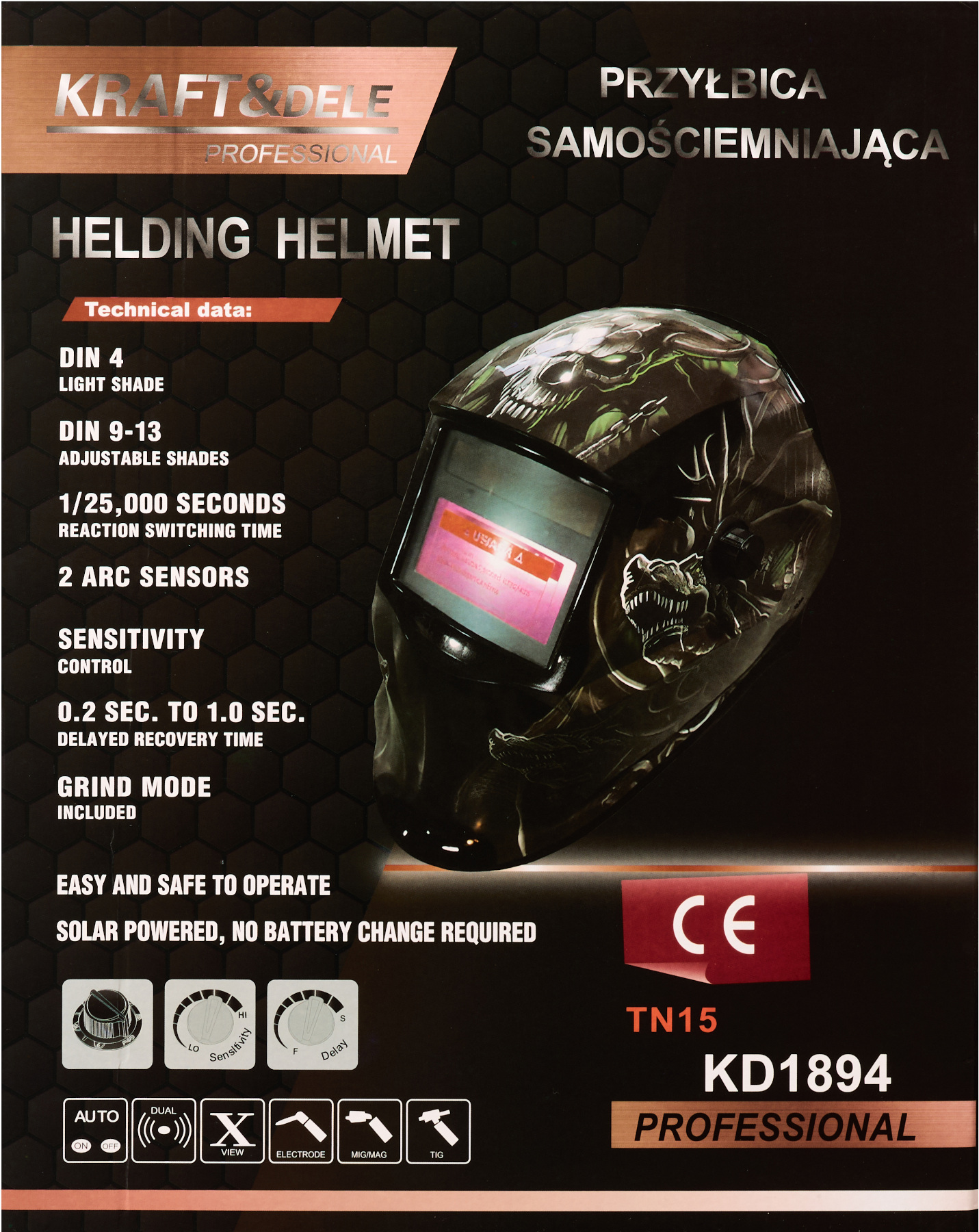 KD1894 to profesjonalna przyłbica spawalnicza wyposażona w filtr samościemniający, przeznaczona do pracy z różnymi metodami spawania, takimi jak MMA, MIG/MAG oraz TIG. Idealnie sprawdza się zarówno w warsztatach profesjonalnych, jak i przy domowych pracach spawalniczych.