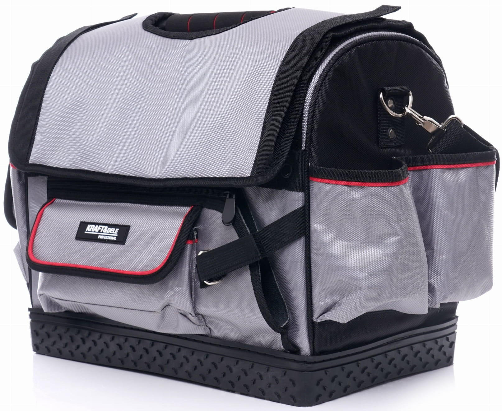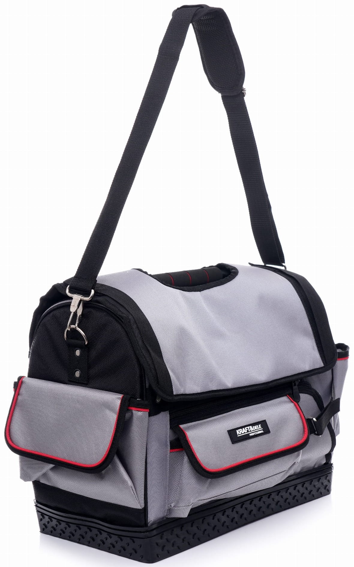 Sztywne dno pokryte kompozytowym tworzywem gwarantuje wysoką trwałość oraz stabilność torby, nawet przy intensywnym użytkowaniu. Model KD2037 oferuje dużą pojemność dzięki trzem kieszeniom wewnętrznym oraz sześciu kieszeniom zewnętrznym, co pozwala na wygodne uporządkowanie narzędzi i akcesoriów.