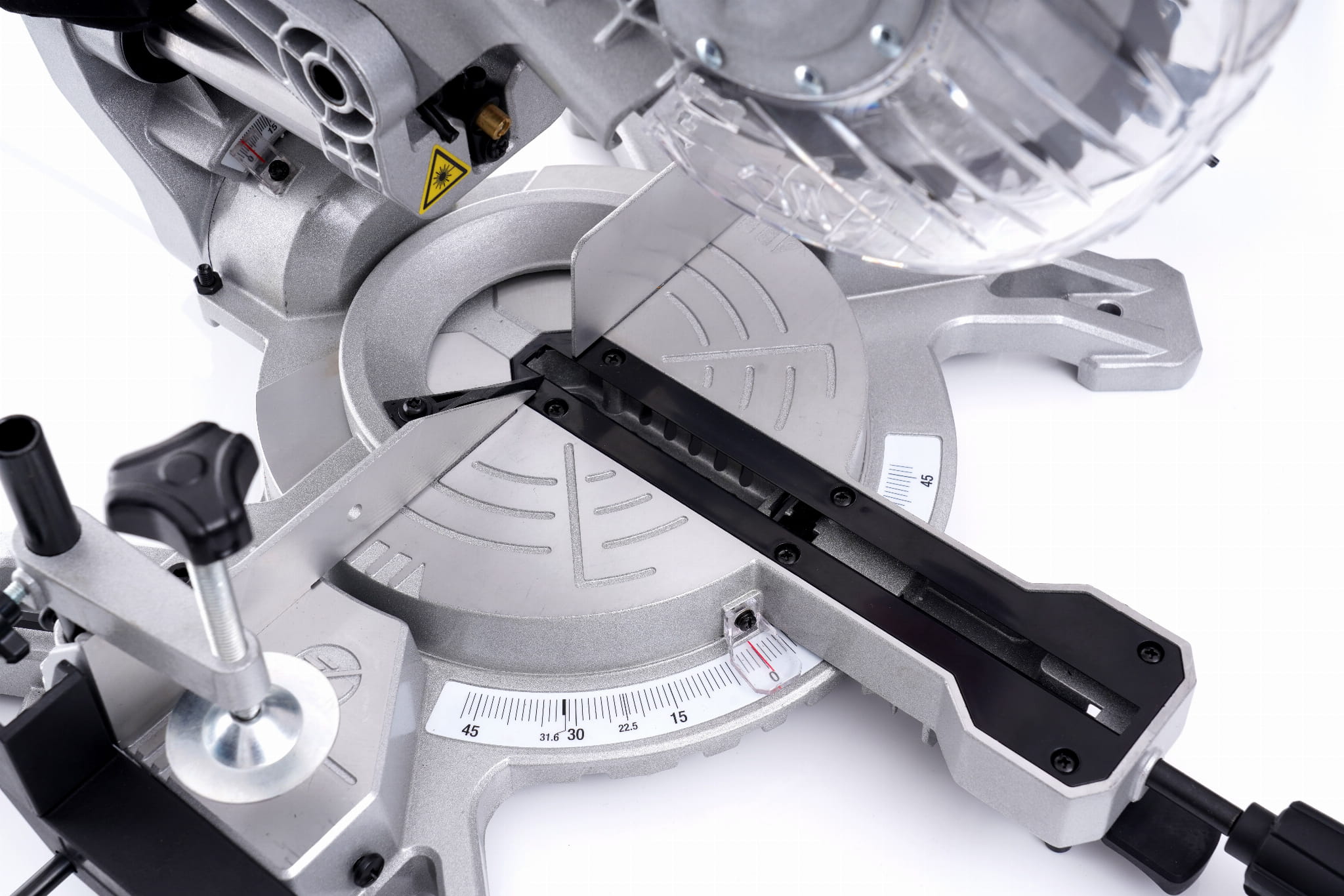 Ukośnica wyposażona jest w regulowany laser który, wskazuje precyzyjnie krawędź ciętą, co znacznie usprawnia pracę i sprawia, że cięcia będą dokładniejsze.