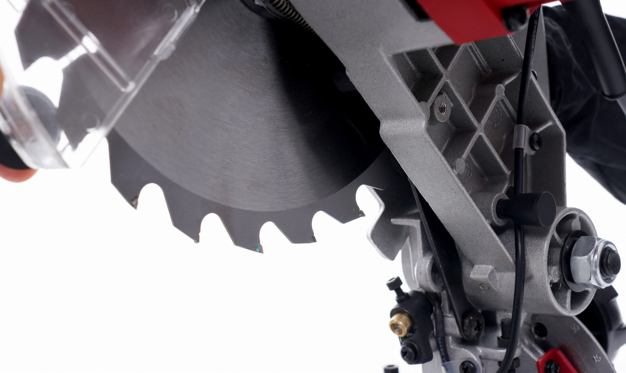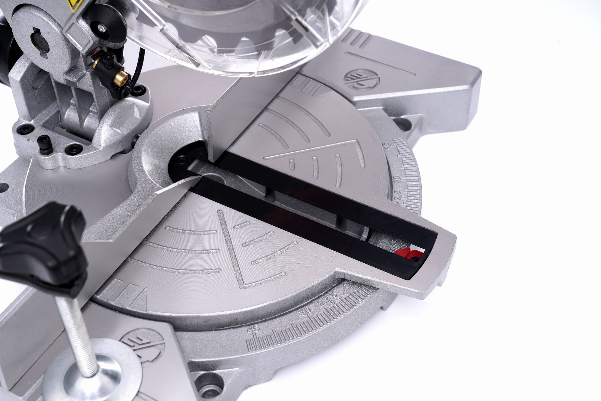 Ukośnica wyposażona jest w regulowany laser który, wskazuje precyzyjnie krawędź ciętą, co znacznie usprawnia pracę i sprawia, że cięcia będą dokładniejsze.
