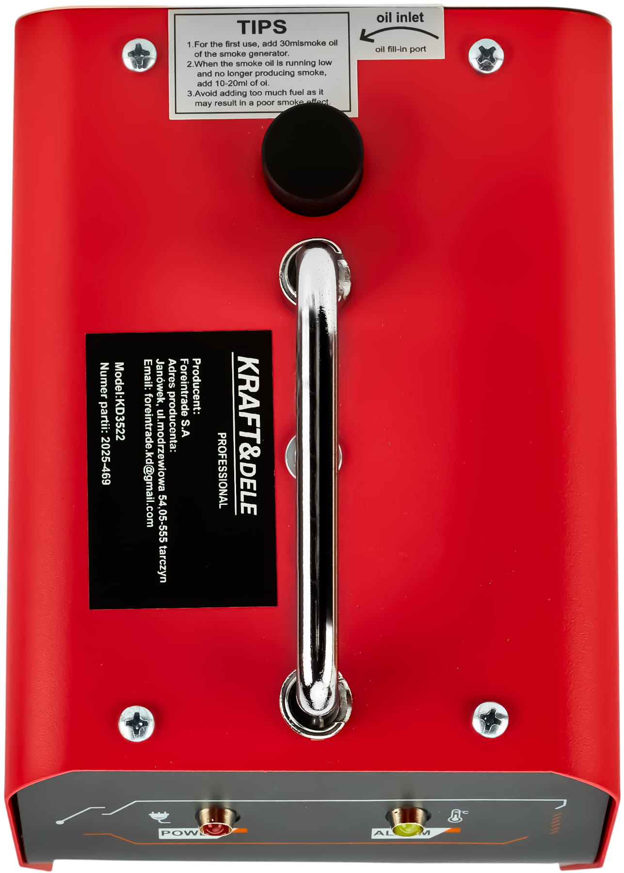 Generator dymu KRAFT&DELE KD3522 to profesjonalne urządzenie diagnostyczne do wykrywania nieszczelności w systemach rurowych pojazdów i instalacjach technicznych. Umożliwia szybkie, bezpieczne i precyzyjne zlokalizowanie wycieków w układach takich jak: system EVAP, układ dolotowy, wydechowy, paliwowy, chłodzenia czy przewody podciśnienia.