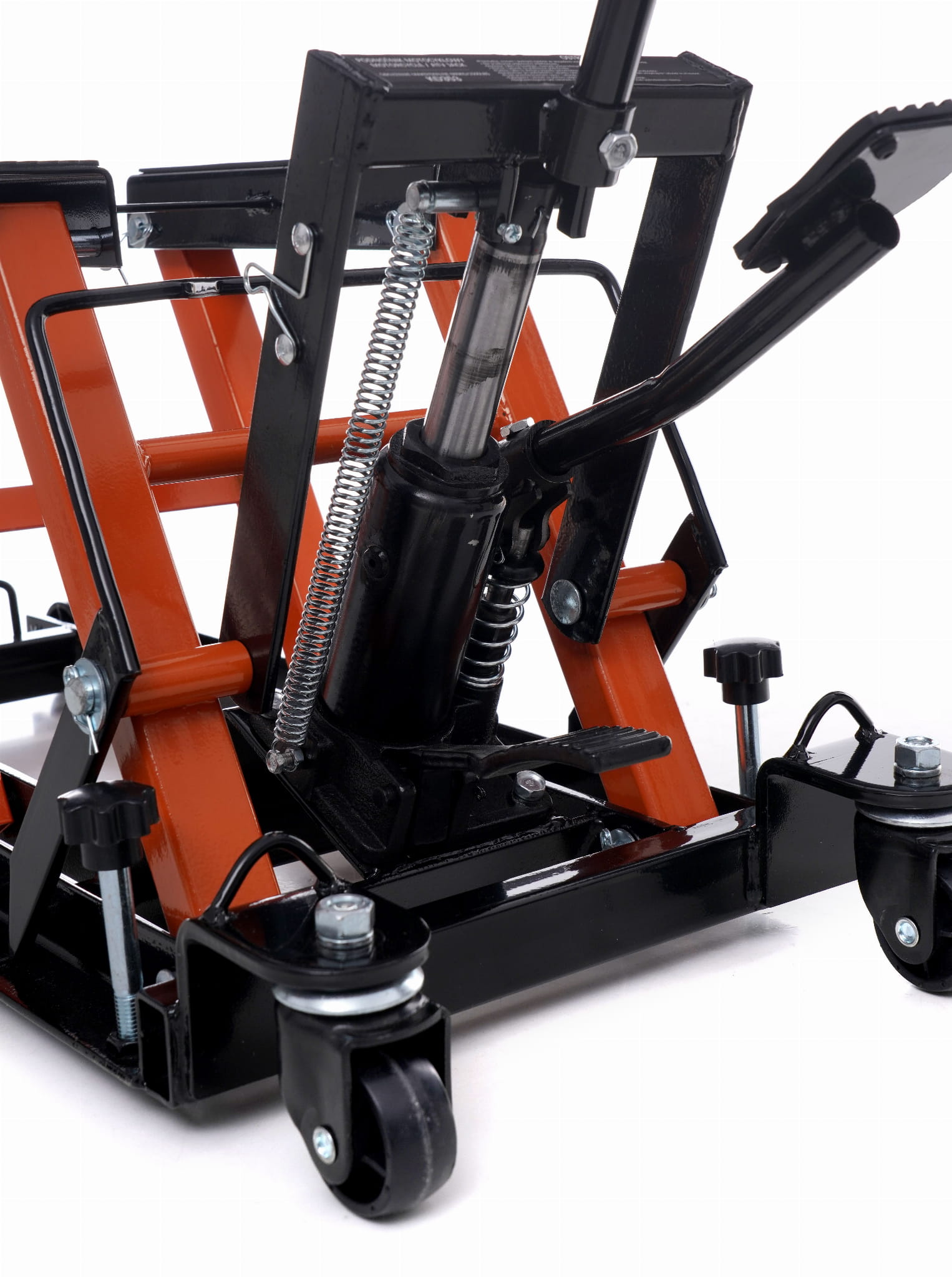 Hydrauliczny siłownik zastosowany w podnośniku ATV jest wydajny i sprawia, że podnoszenie nawet najcięższych pojazdów do 680 kg odbywa się szybko i bez nadmiernego wysiłku.