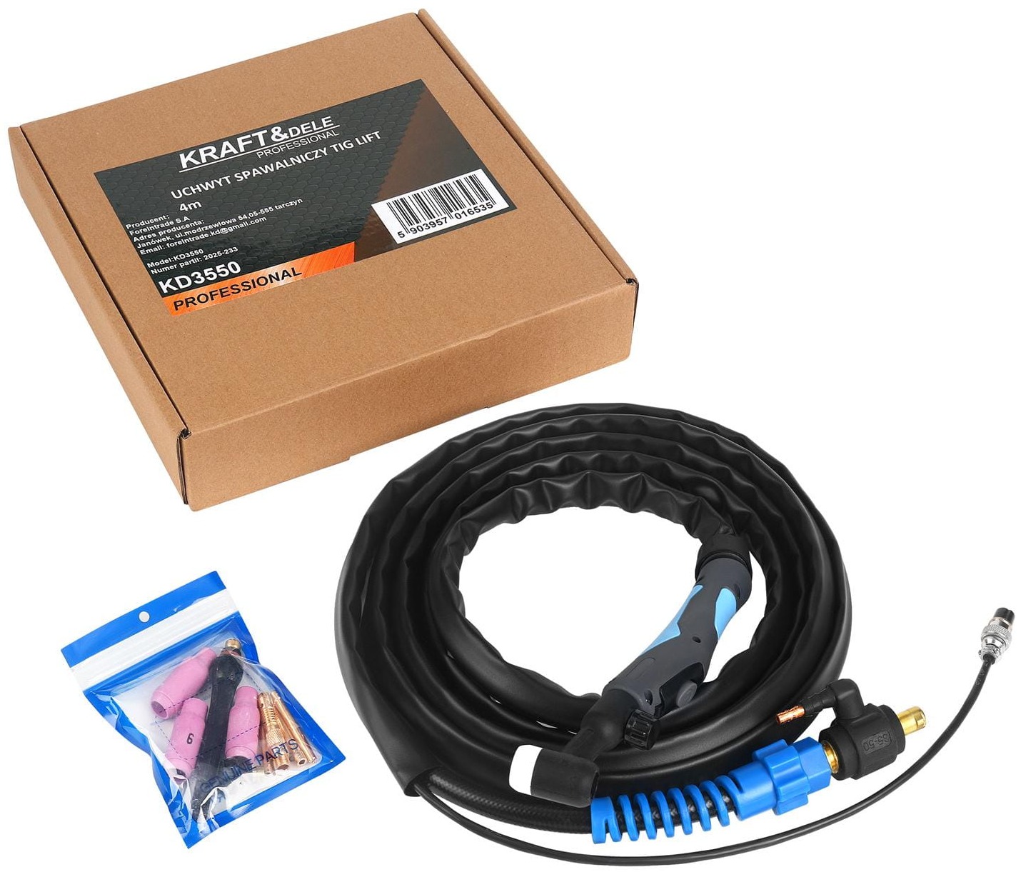 KD3550 to wysokiej jakości uchwyt spawalniczy TIG LIFT marki KRAFT&DELE, przeznaczony do precyzyjnego spawania metodą TIG z zajarzaniem łuku przez dotyk. Dzięki długości przewodu wynoszącej 4 metry zapewnia swobodę pracy oraz wygodę użytkowania zarówno w warsztacie, jak i podczas prac mobilnych. Uchwyt jest kompatybilny z większością spawarek TIG DC, co czyni go uniwersalnym rozwiązaniem dla wielu zastosowań.