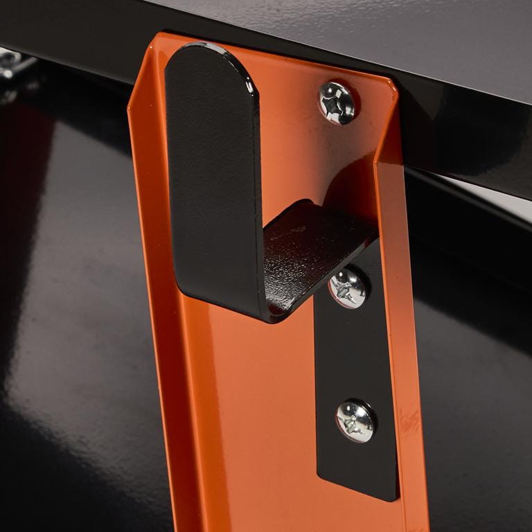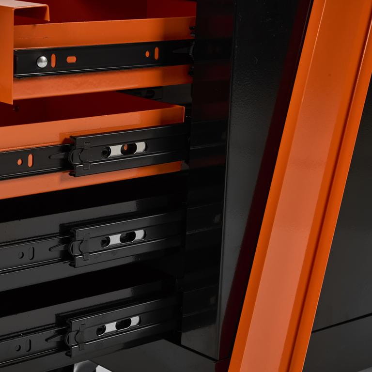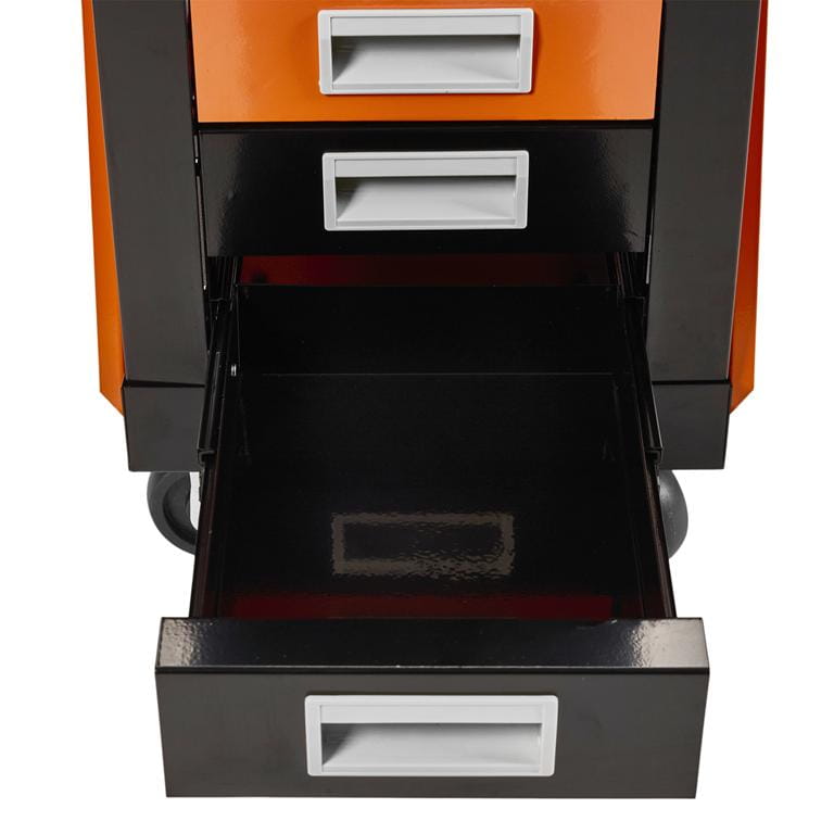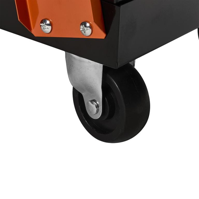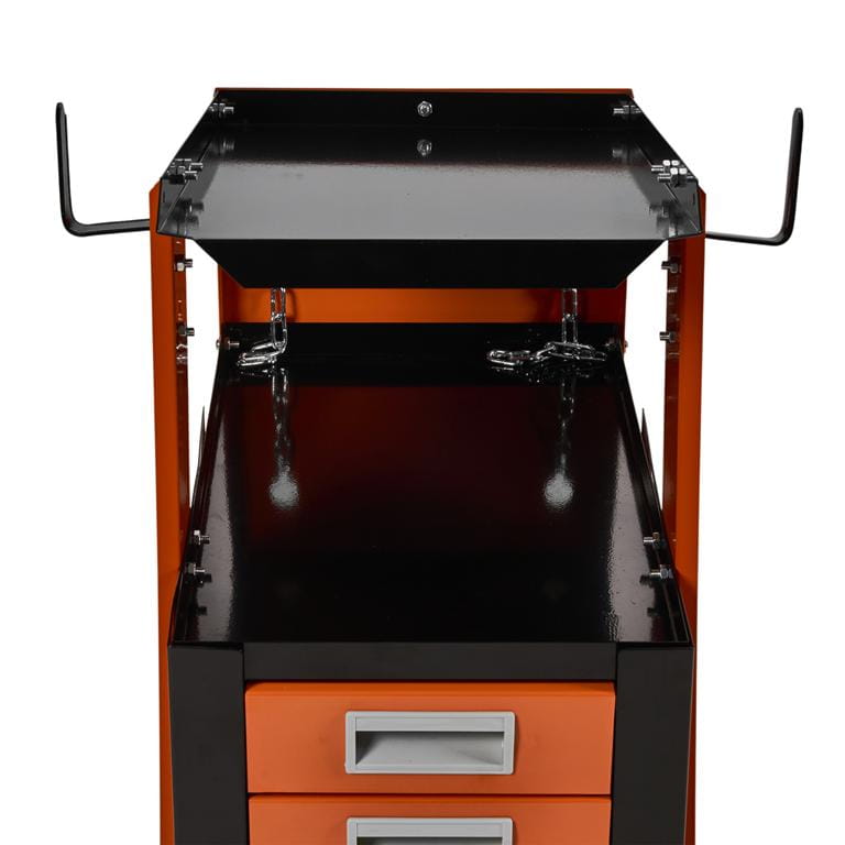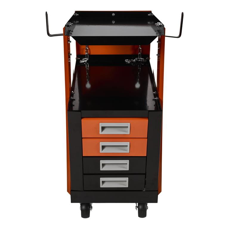 Wyposażony w 4 szuflady oraz wydłużoną górną półkę, zapewnia wygodne przechowywanie narzędzi i akcesoriów. Solidna konstrukcja z wysokiej jakości stali gwarantuje wytrzymałość i nośność do 75 kg, a system kółek (większe z tyłu, mniejsze z przodu) ułatwia manewrowanie nawet przy pełnym obciążeniu.