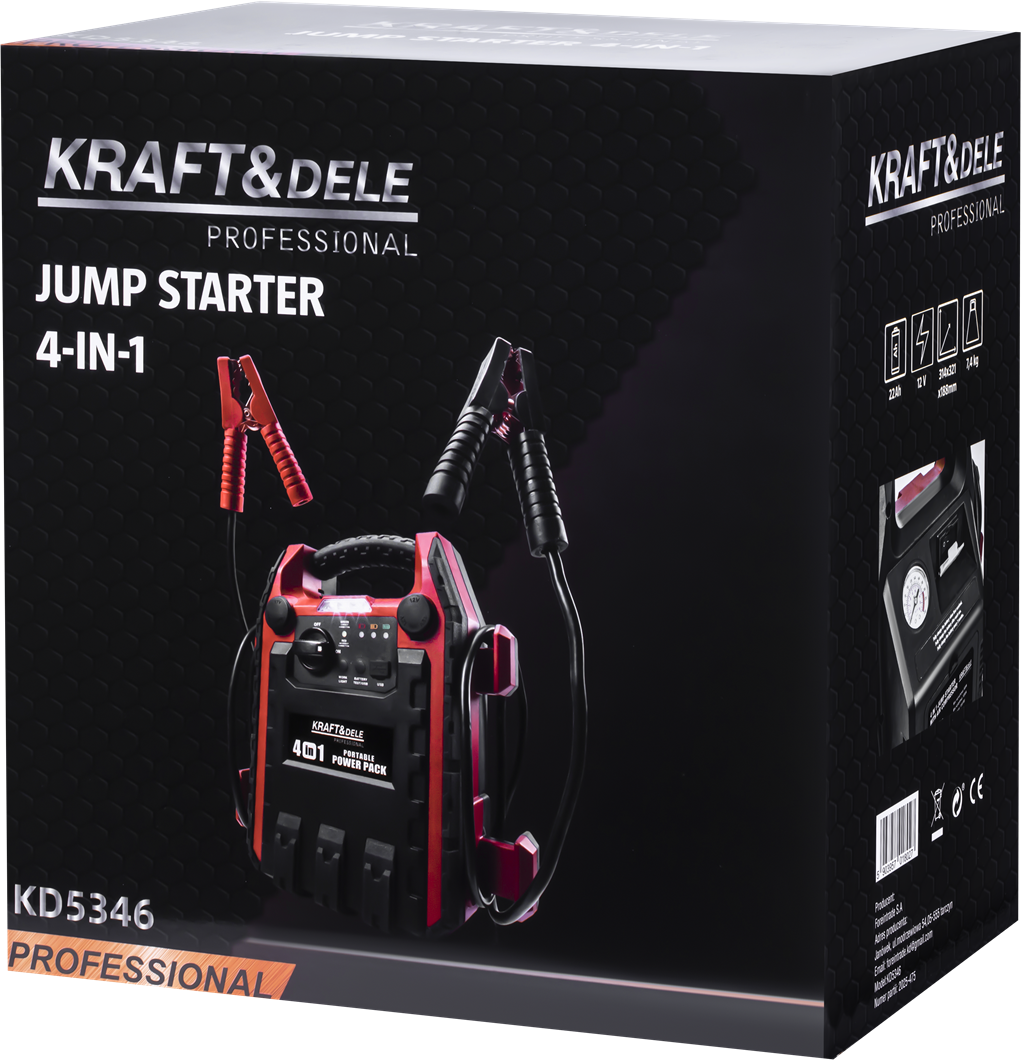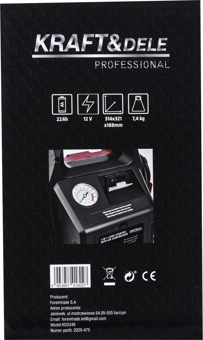 KD5346 został wyposażony w mocny akumulator 22Ah, który gwarantuje wysoki prąd rozruchowy 1200A, umożliwiający uruchomienie większości pojazdów z instalacją 12V – od samochodów osobowych, przez motocykle, po sprzęt rekreacyjny. Wbudowany kompresor o ciśnieniu 11 bar pozwala szybko dopompować koła, a dwie wtyczki zapalniczki 12V oraz port USB umożliwiają zasilanie dodatkowych urządzeń. Trzy diody LED o dużej jasności pełnią rolę latarki warsztatowej, dzięki której praca po zmroku staje się komfortowa i bezpieczna. Całość uzupełnia solidna konstrukcja z ergonomicznym uchwytem oraz intuicyjny panel sterowania, który zapewnia prostotę obsługi nawet w trudnych warunkach terenowych.