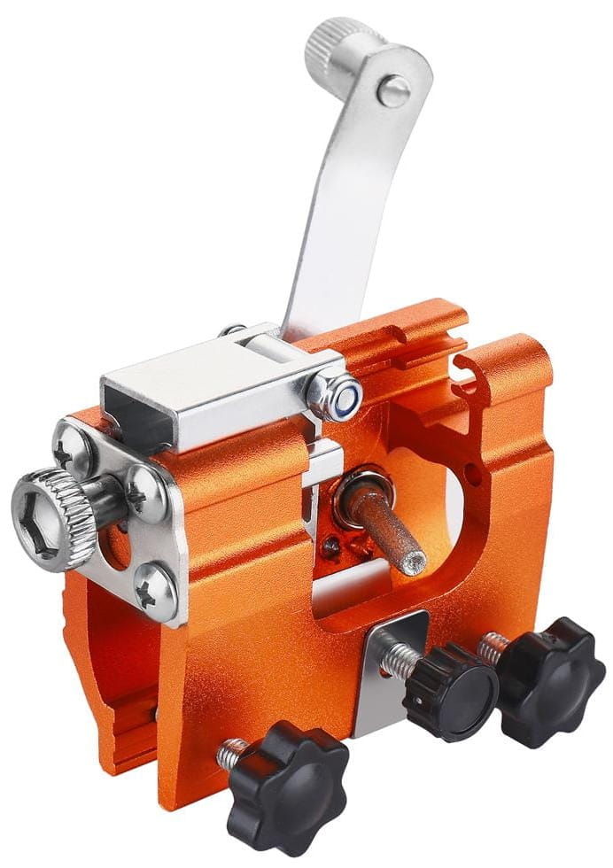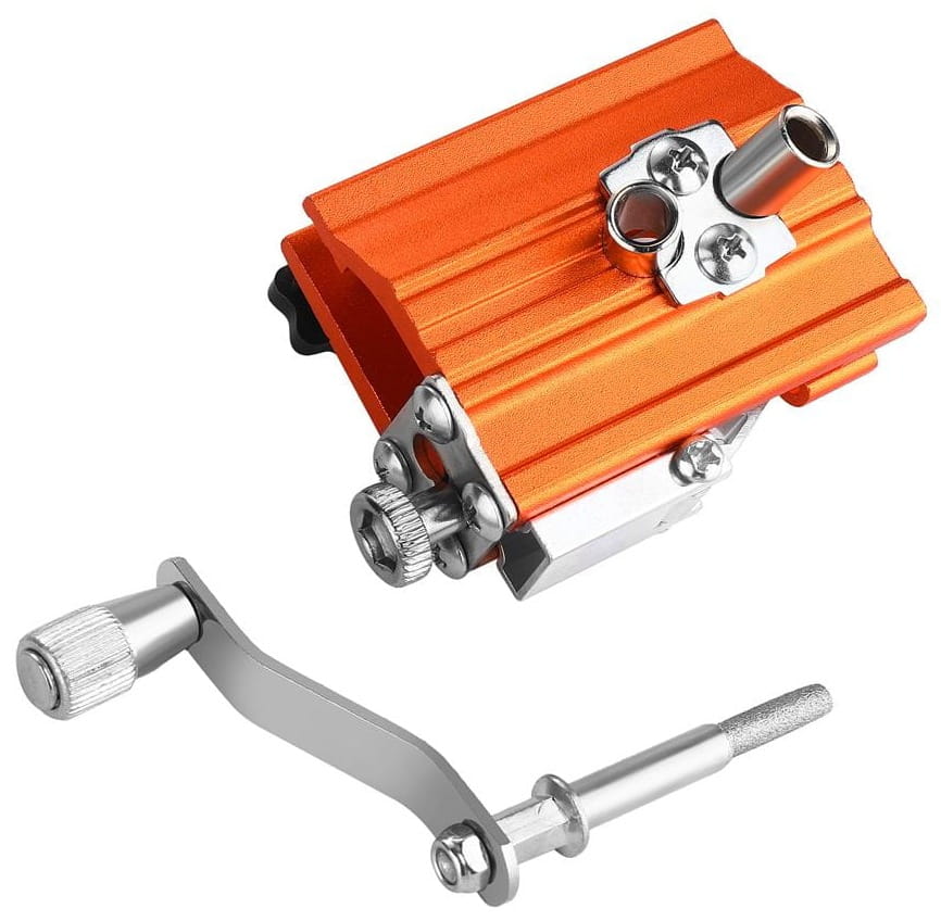 - Dzięki regulowanym śrubom, ostrzałkę można łatwo dostosować do różnych rozmiarów łańcuchów, co sprawia, że jest wszechstronnym narzędziem, kompatybilnym z większością dostępnych na rynku pił łańcuchowych o długości od 8 do 20 cali.
